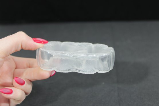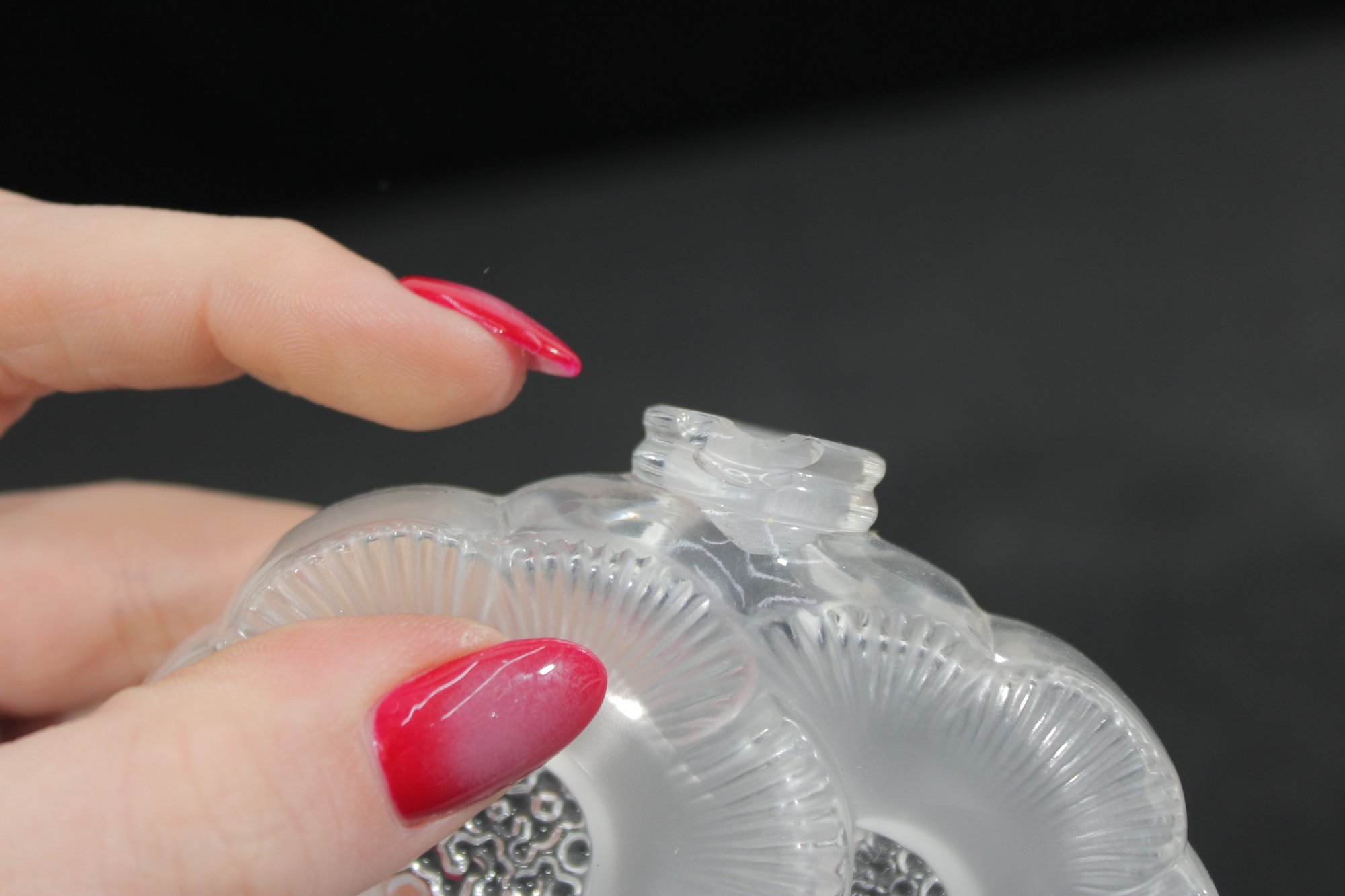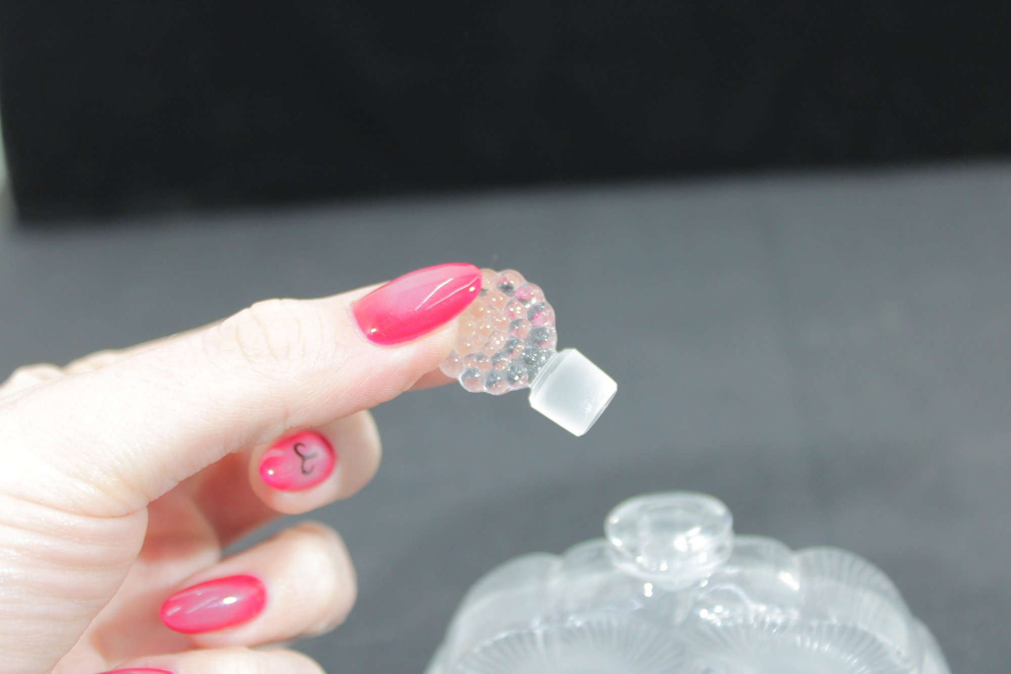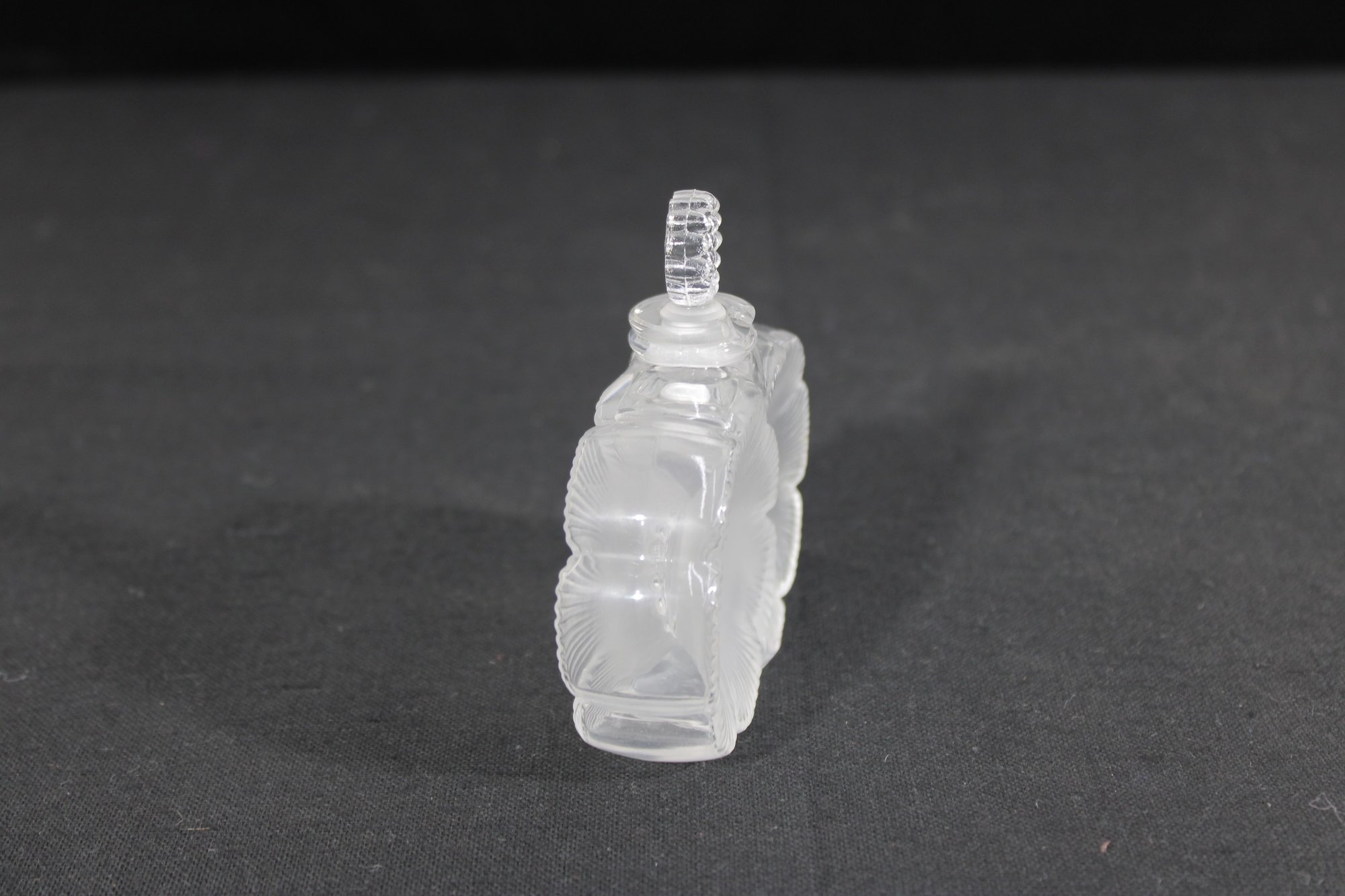 frosted crystal perfume bottle in the “Deux Fleurs” (Two Flowers) design, featuring a beautifully sculpted double floral motif. The bottle is crafted with a soft matte finish and detailed petal textures, with raised centers adding depth and visual interest.