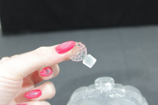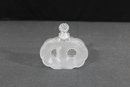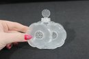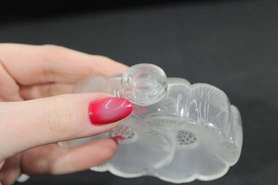 The matching stopper is topped with a textured, faceted design that complements the floral theme. This piece is empty and ready for display, making it a lovely decorative accent or addition to a perfume bottle collection..