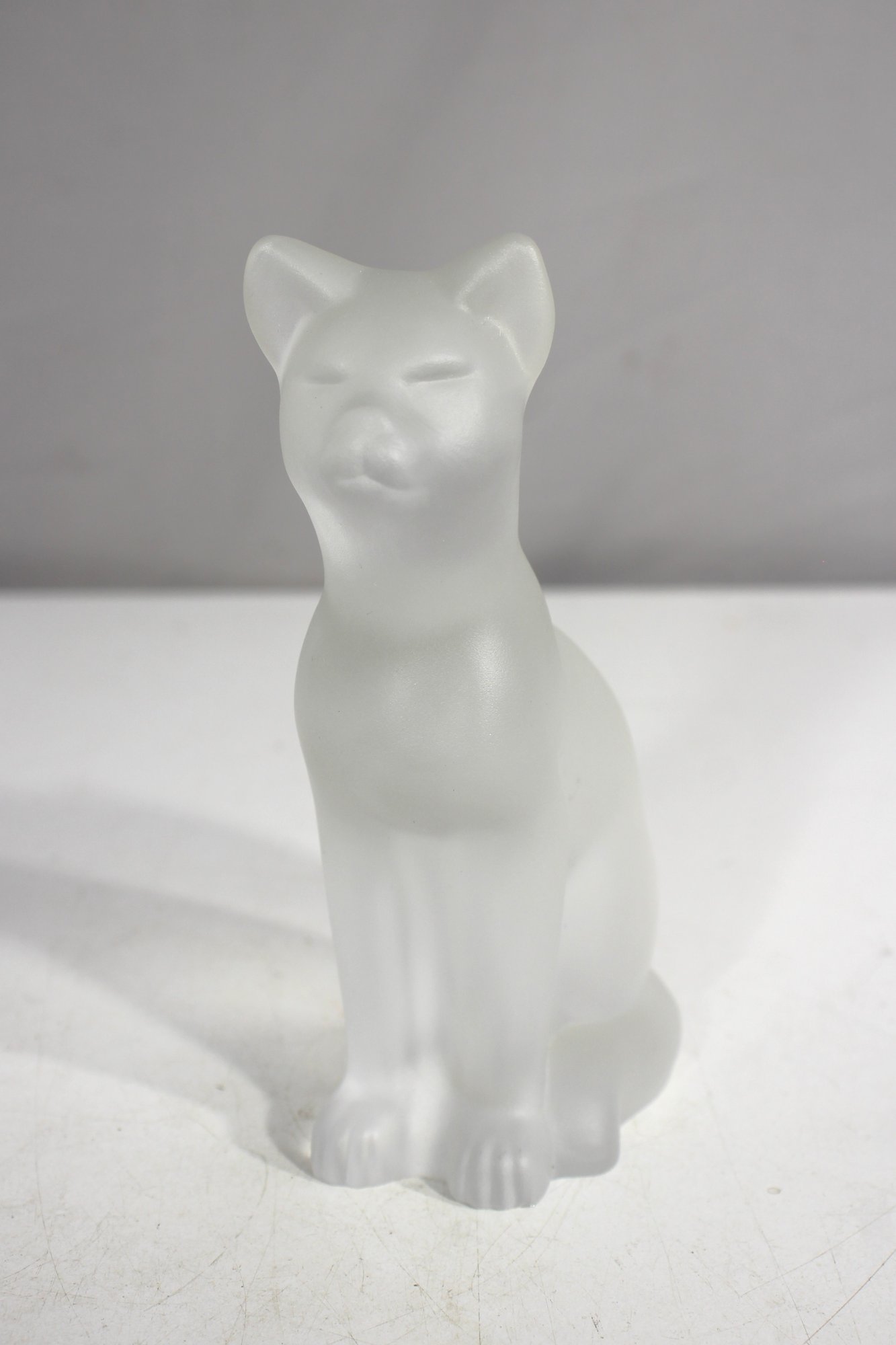 This elegant frosted glass cat figurine stands at 6.5 inches tall, capturing the feline form with a smooth, matte finish. The sculptural details highlight the cat's poised posture, alert ears, and serene facial expression. Crafted with a translucent quality, the piece beautifully diffuses light, adding a soft glow to any space. The base is smooth and slightly curved, ensuring stability. This exquisite decorative piece is perfect for collectors of glass art, cat enthusiasts, or those looking to add a touch of sophistication to their décor.