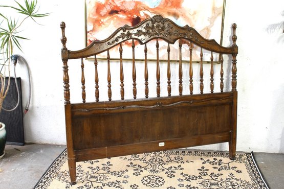 features a beautifully crafted full-size bed frame from Aubbray & Co, renowned for their exquisite and detailed woodwork. The headboard and footboard boast ornate carvings, with a series of turned spindles and a flowing, scalloped top that adds a touch of sophistication to any bedroom.