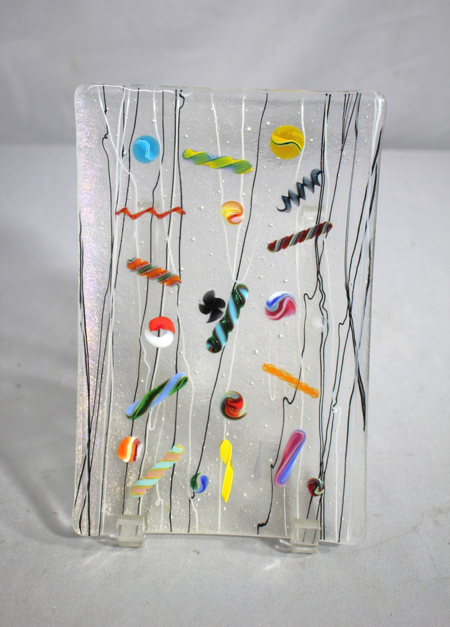 This hand-made square dish features an iridescent finish with colorful bubble designs and intricate fused elements, creating a visually stunning effect. Perfect for display or as a unique serving piece