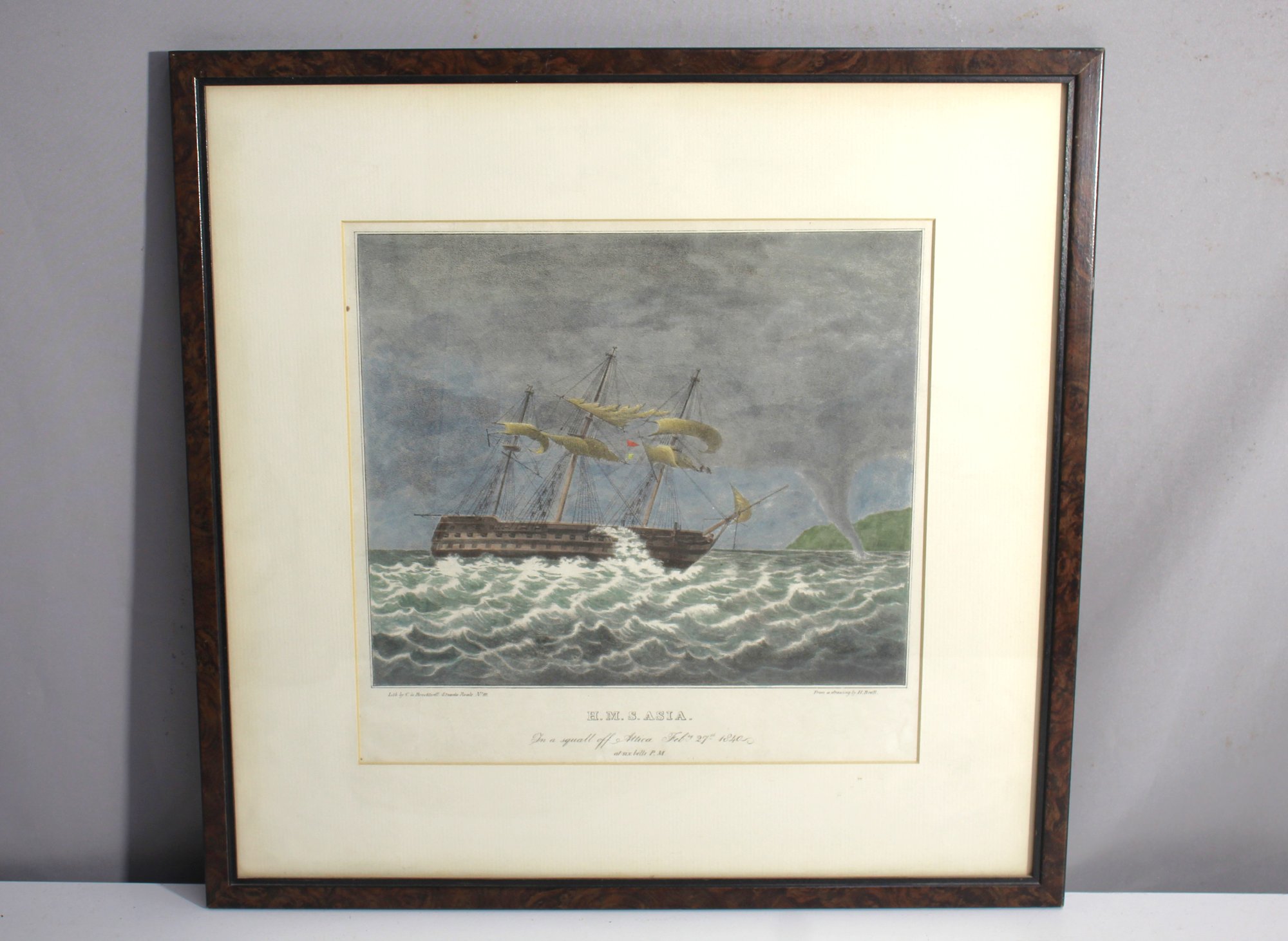 This antique hand-colored lithograph, titled H.M.S. Asia in a Squall off Attica, depicts the British warship H.M.S. Asia battling a turbulent storm on February 27, 1840. The dramatic maritime scene captures the ship as it navigates through rough waters under darkened skies, with impressive detail that highlights the challenges of naval life during this period.