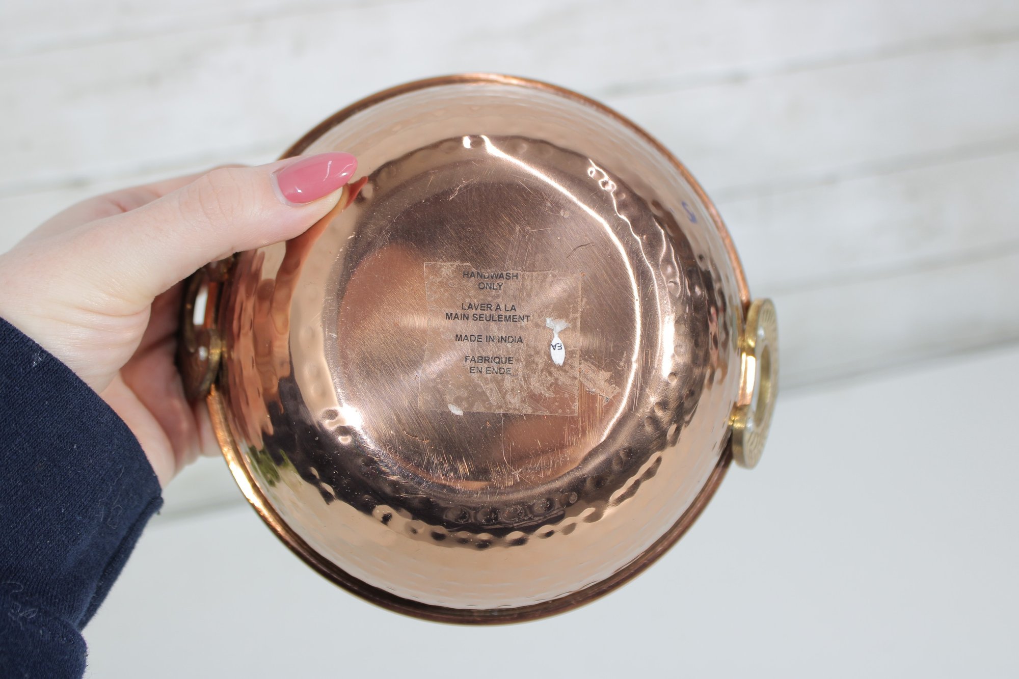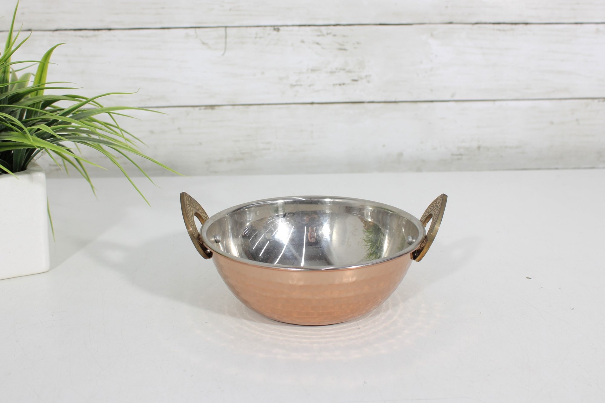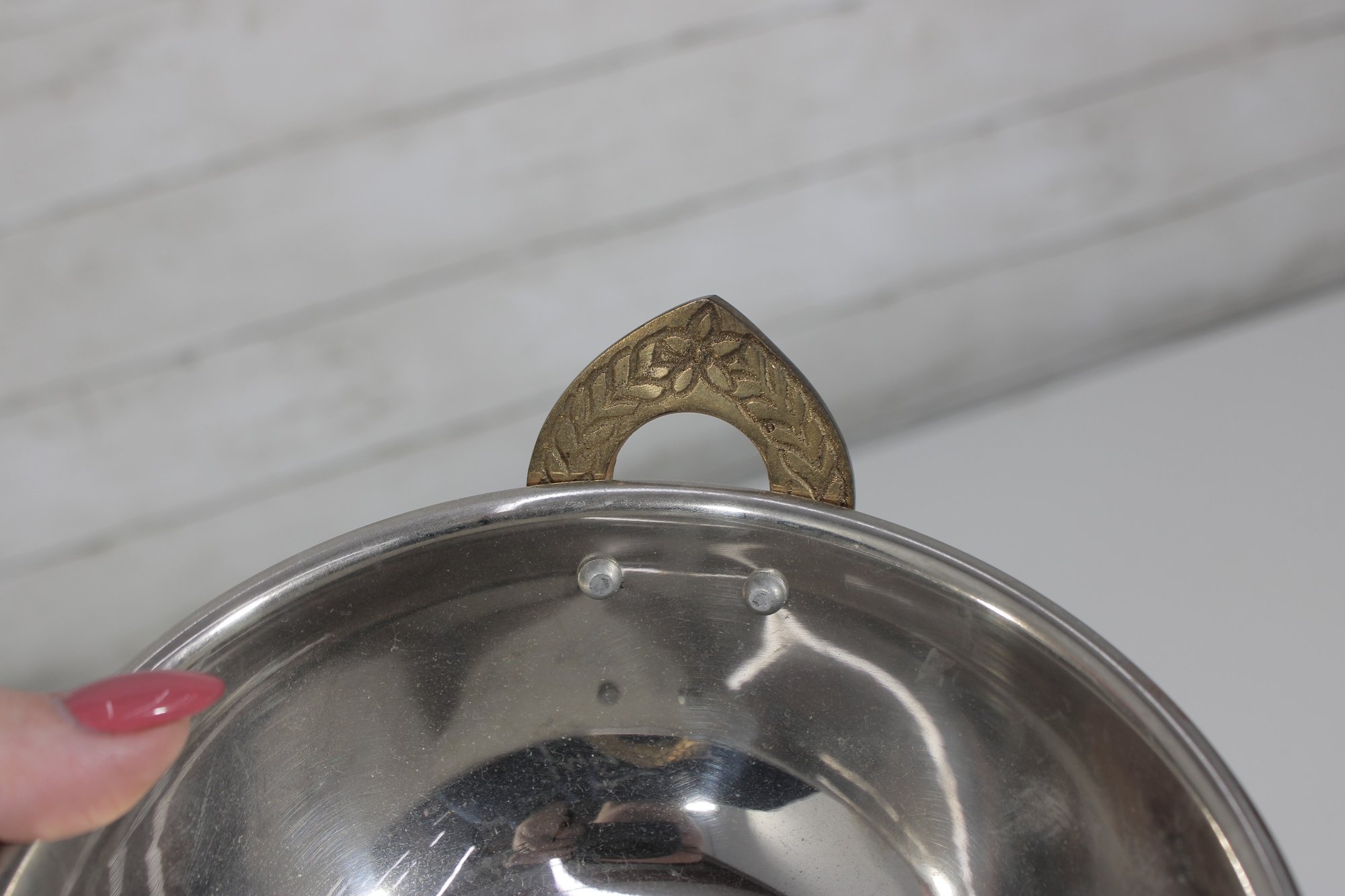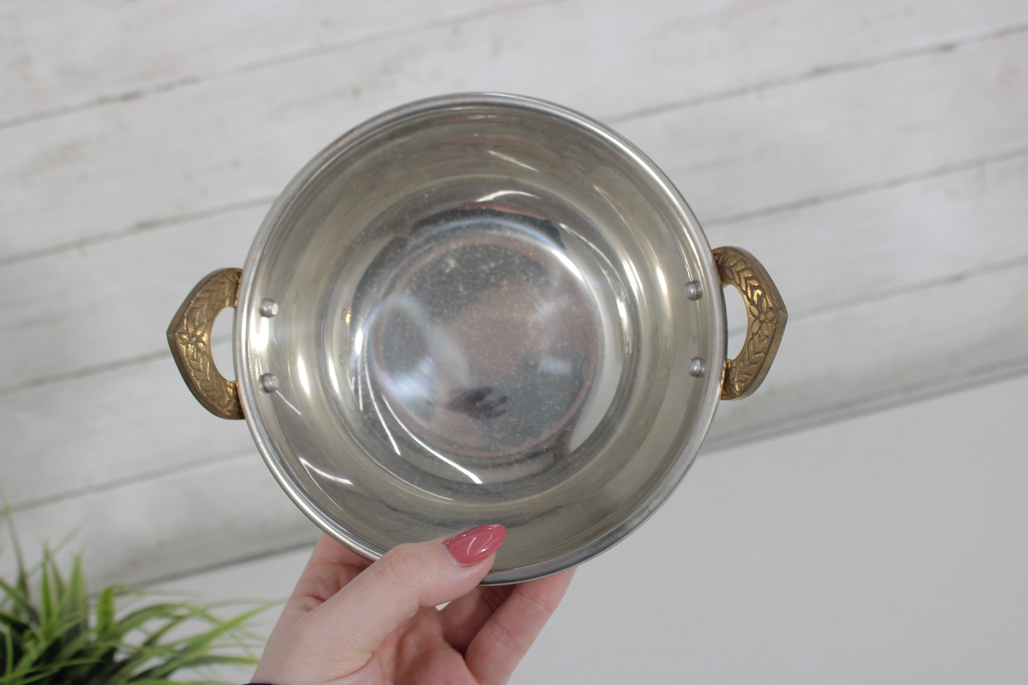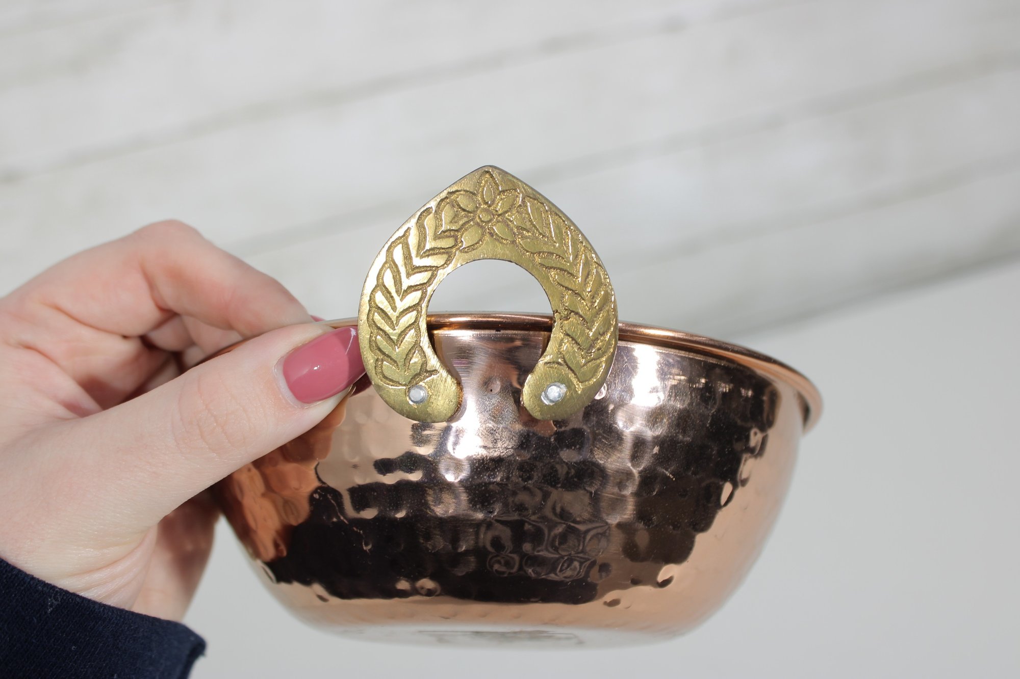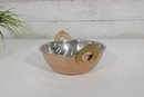 The decorative brass handles are accented with a detailed leaf motif, adding a refined and traditional touch. Compact in size at approximately 6 inches in diameter, this bowl is perfect for serving small dishes, snacks, or for use as a decorative accent piece.