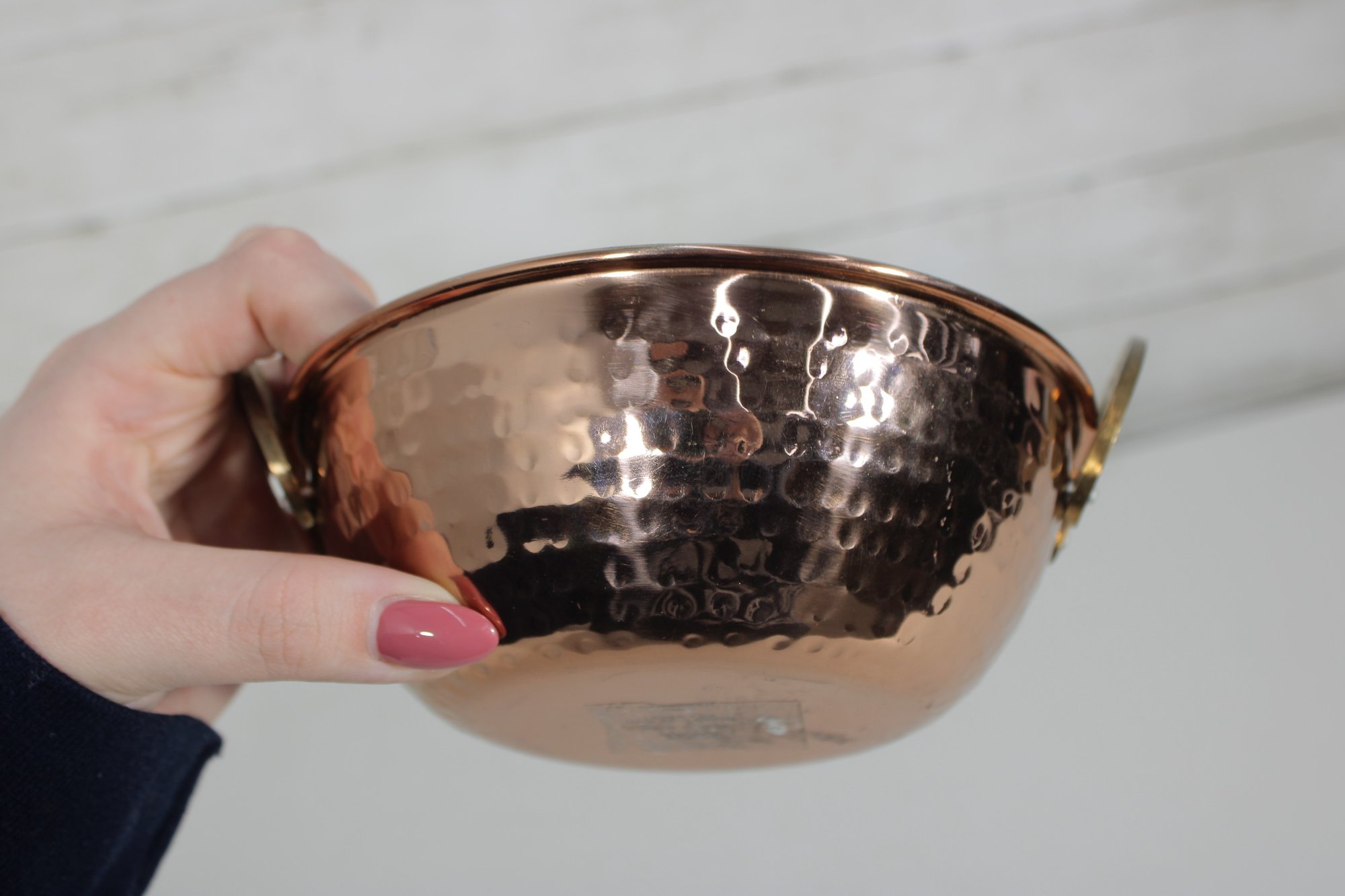 Beautiful hammered copper serving bowl featuring classic Indian craftsmanship and elegant brass handles. The exterior showcases a rich, warm copper finish with a hand-hammered texture, while the interior has a smooth, polished surface.