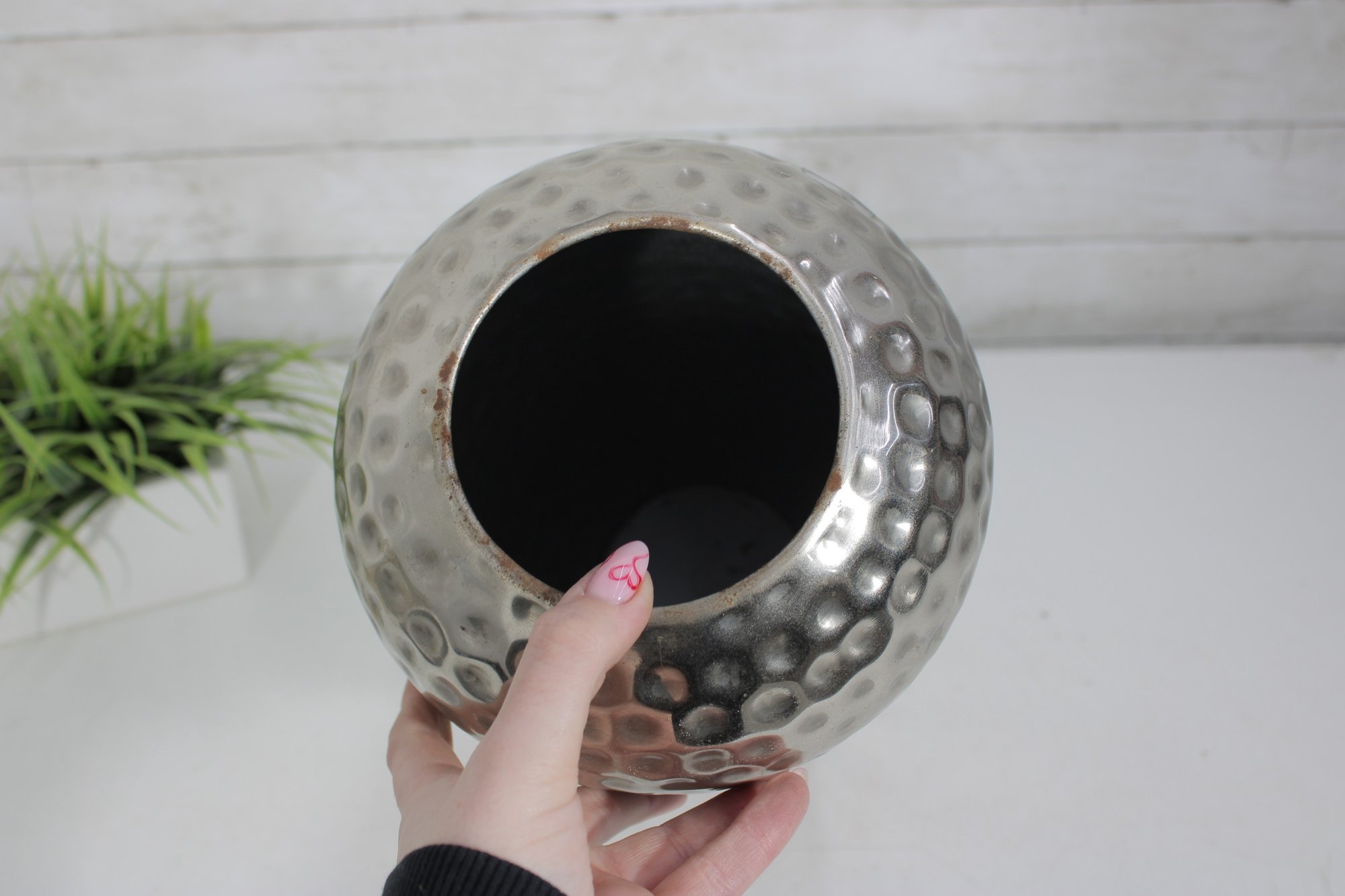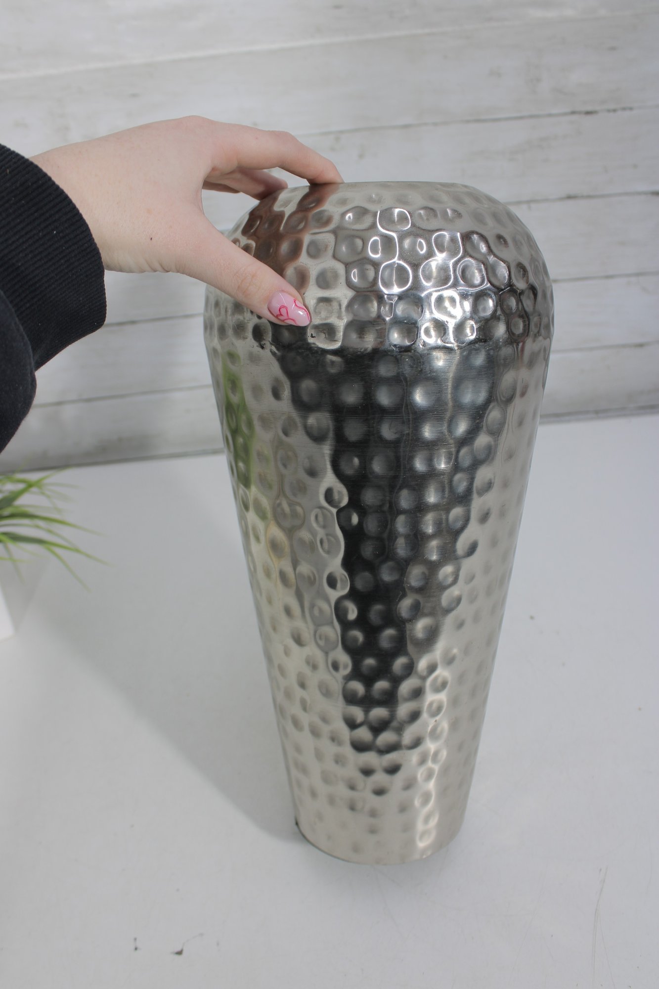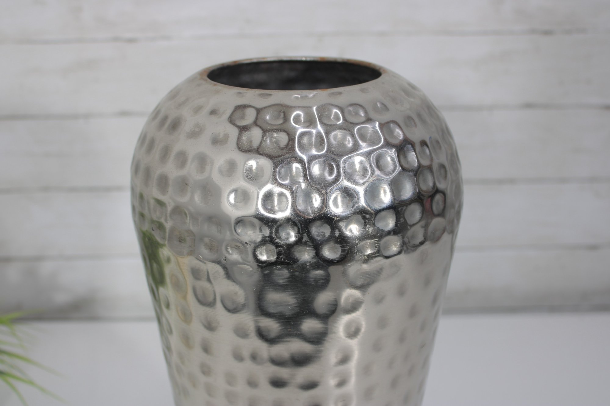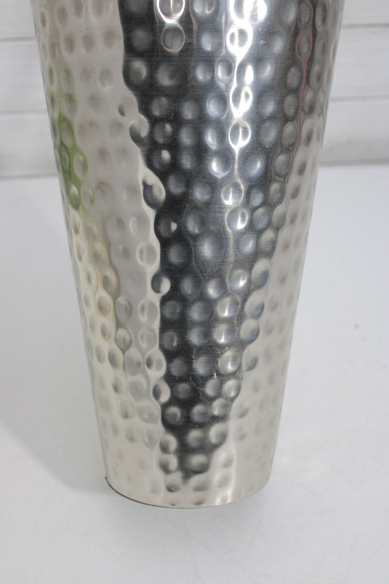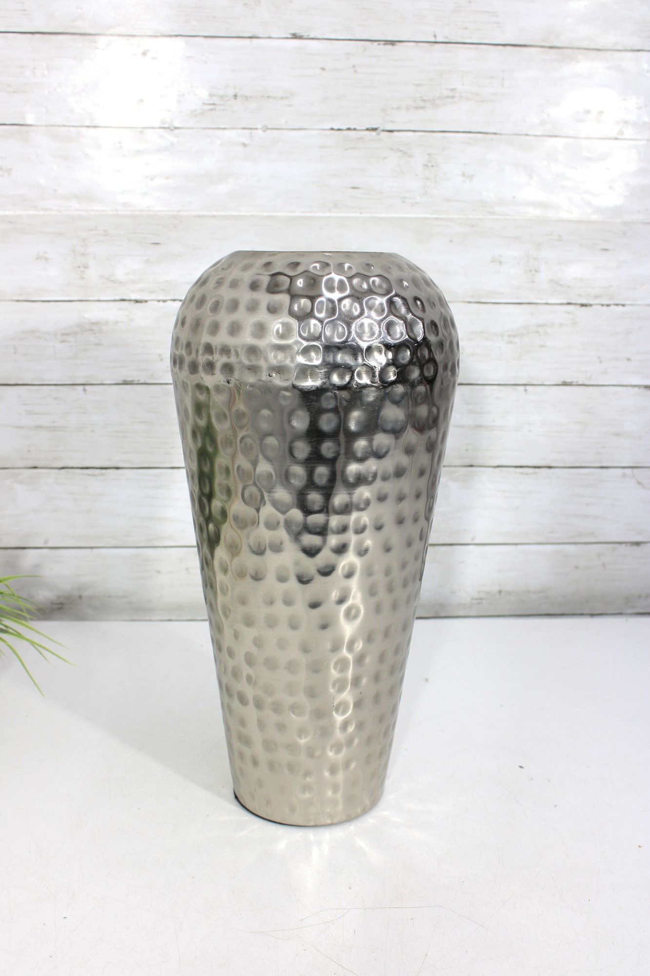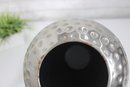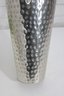 a hammered silver-tone metal decorative vase featuring a sleek, contemporary silhouette and textured finish. The dimpled hammered surface catches the light beautifully, making this a striking accent piece for modern, industrial, or glam-inspired interiors.