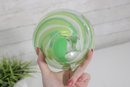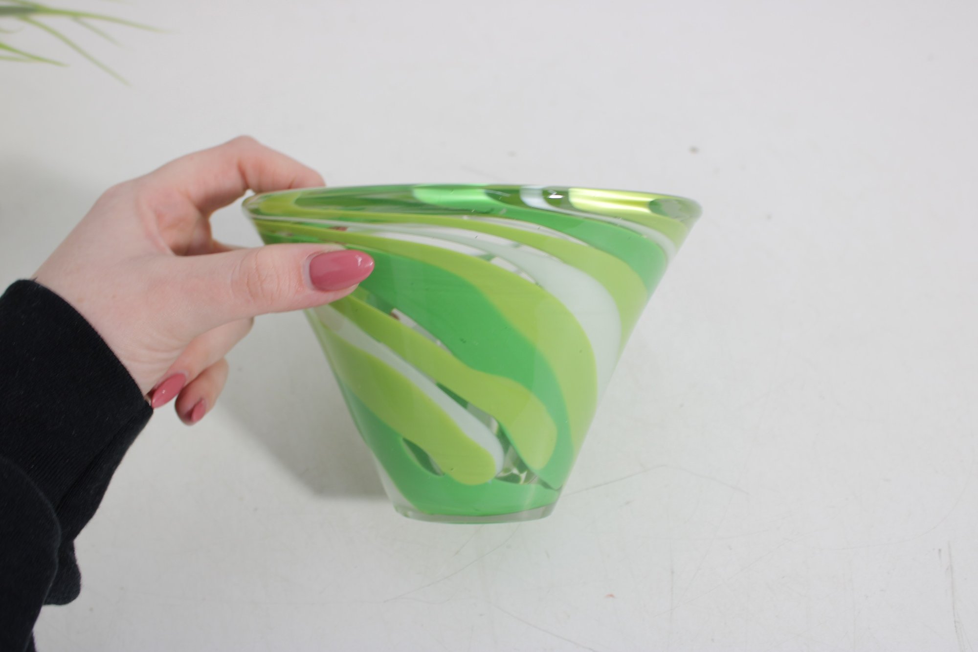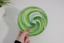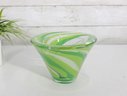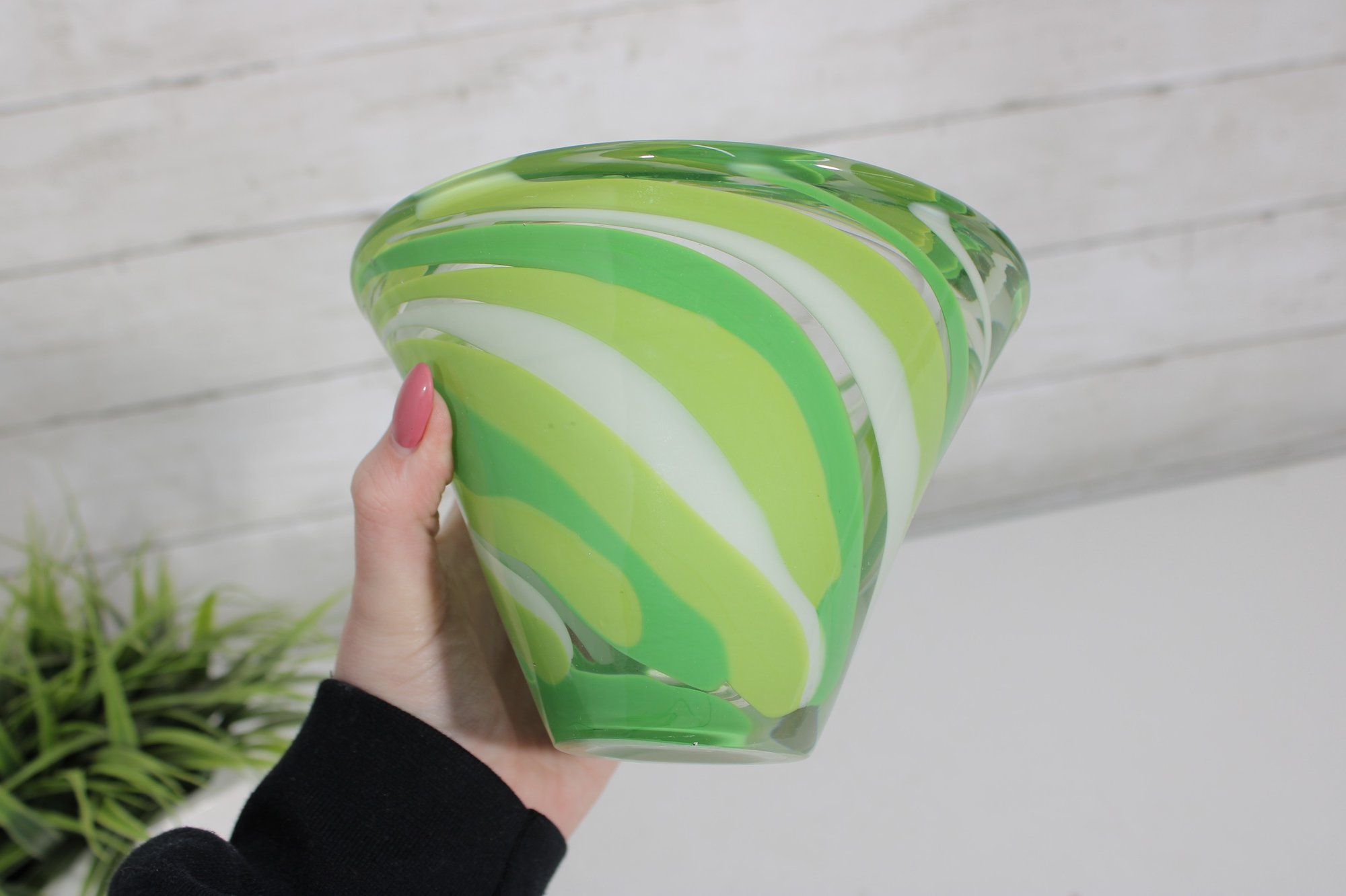 Bright and playful hand blown art glass bowl featuring a bold green and white swirl pattern. The dynamic spiral design flows throughout the piece, creating a lively sense of movement and making it a standout decorative accent.