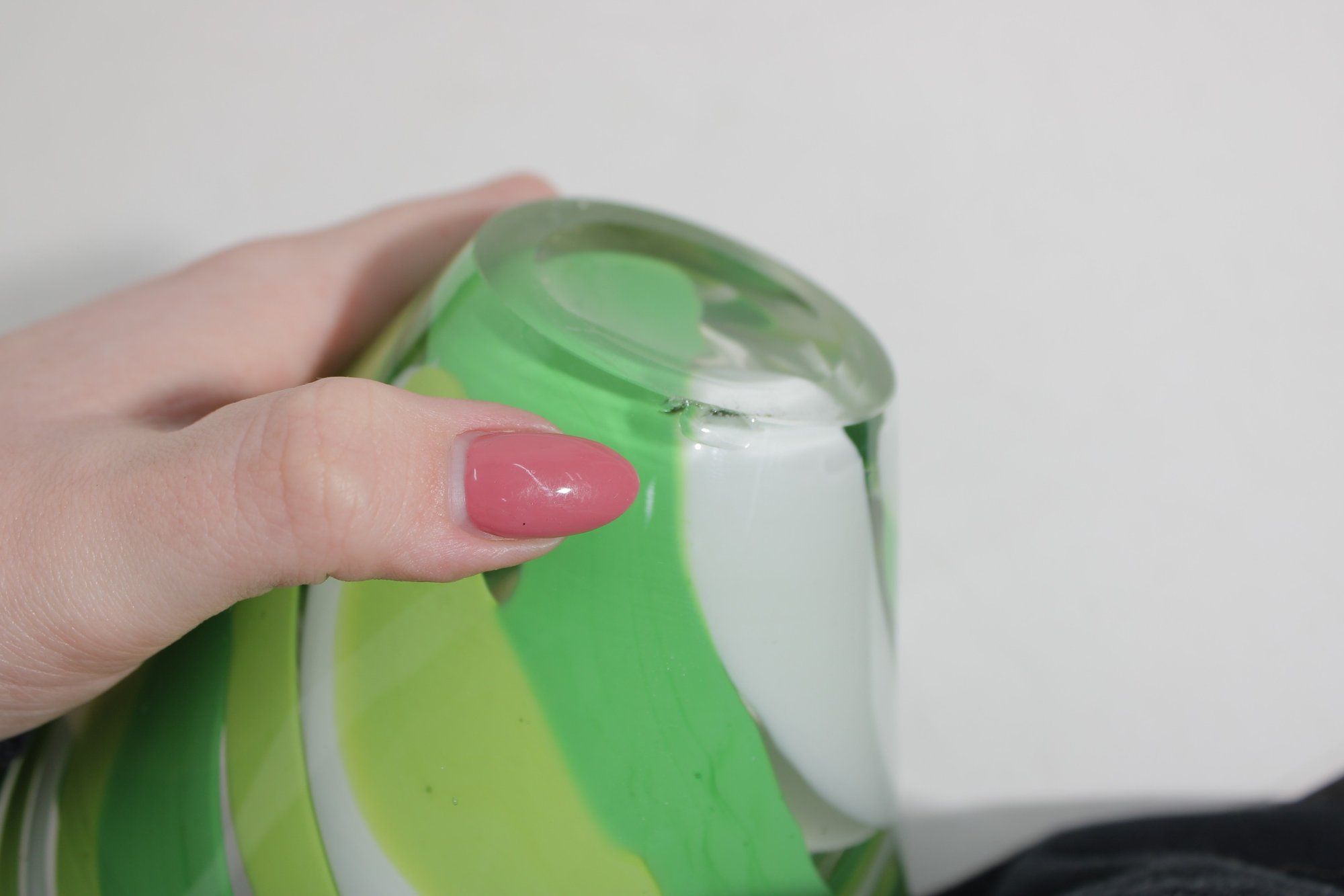 The bowl has a gently flared rim and smooth, rounded form, with vibrant shades of lime green layered against opaque white. Its eye-catching color combination makes it perfect as a centerpiece, candy dish, or display piece.