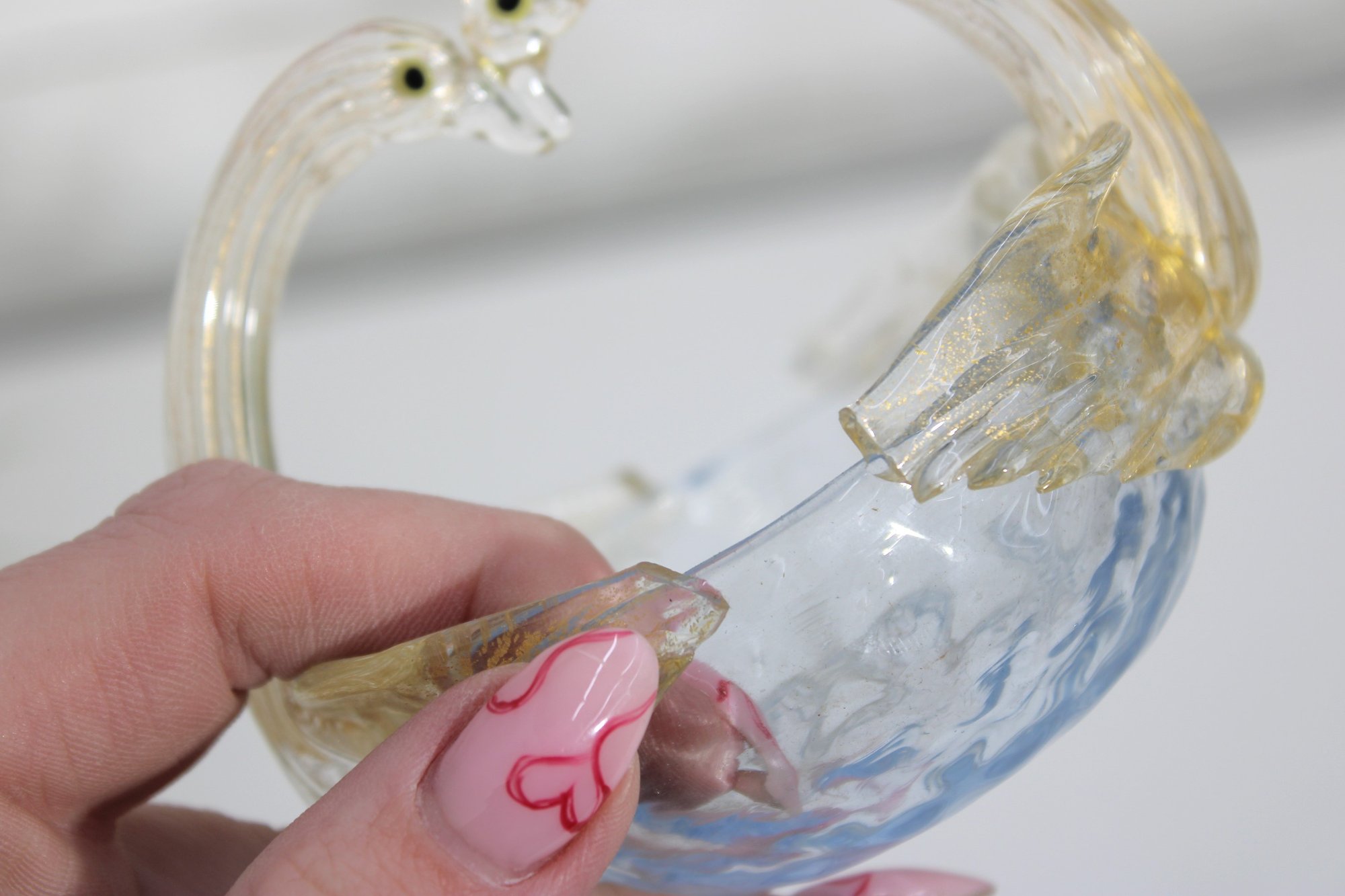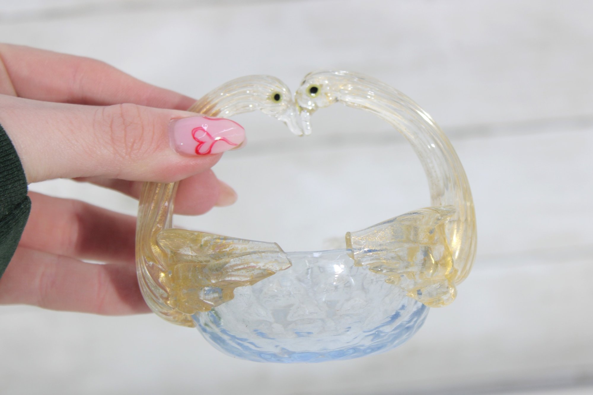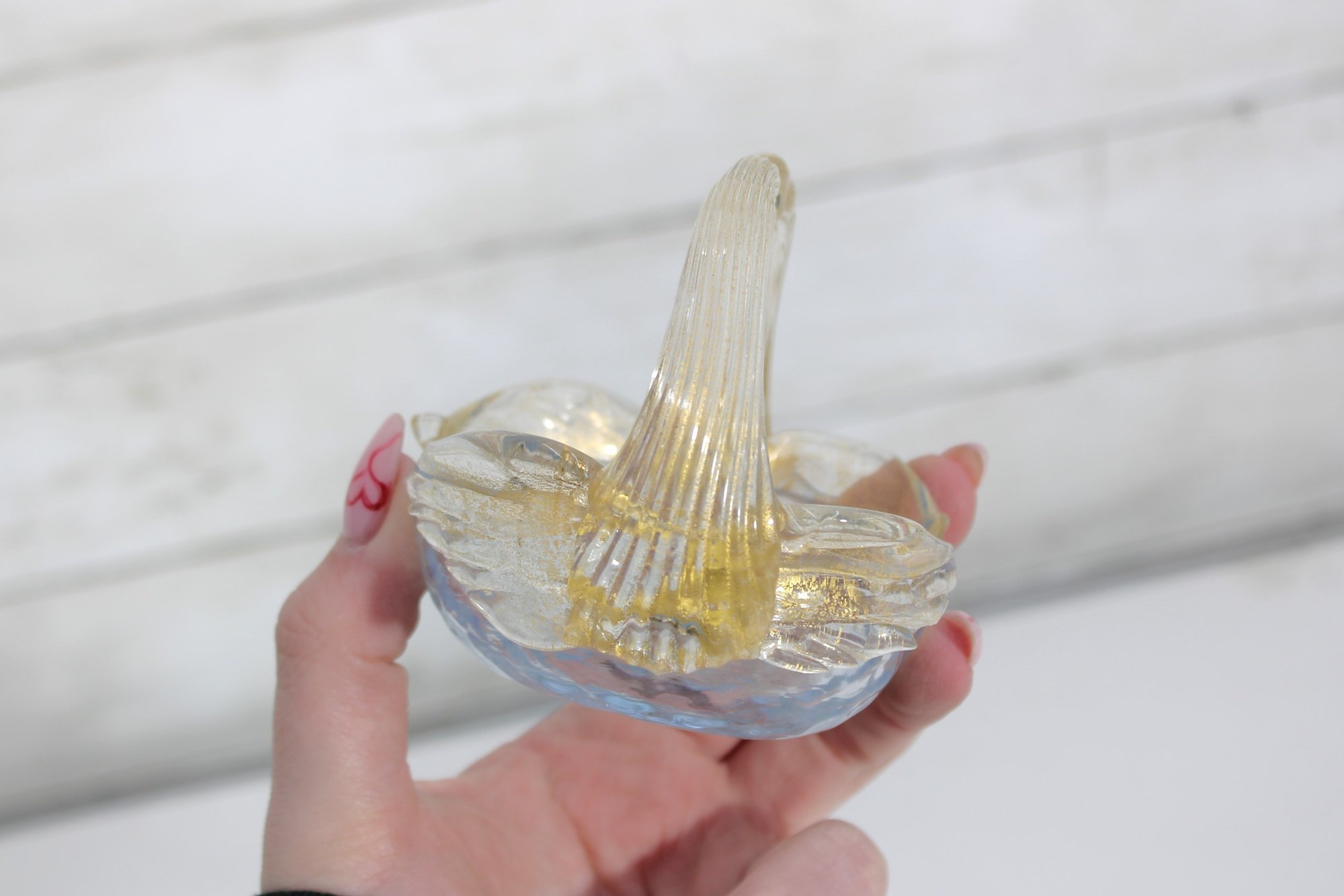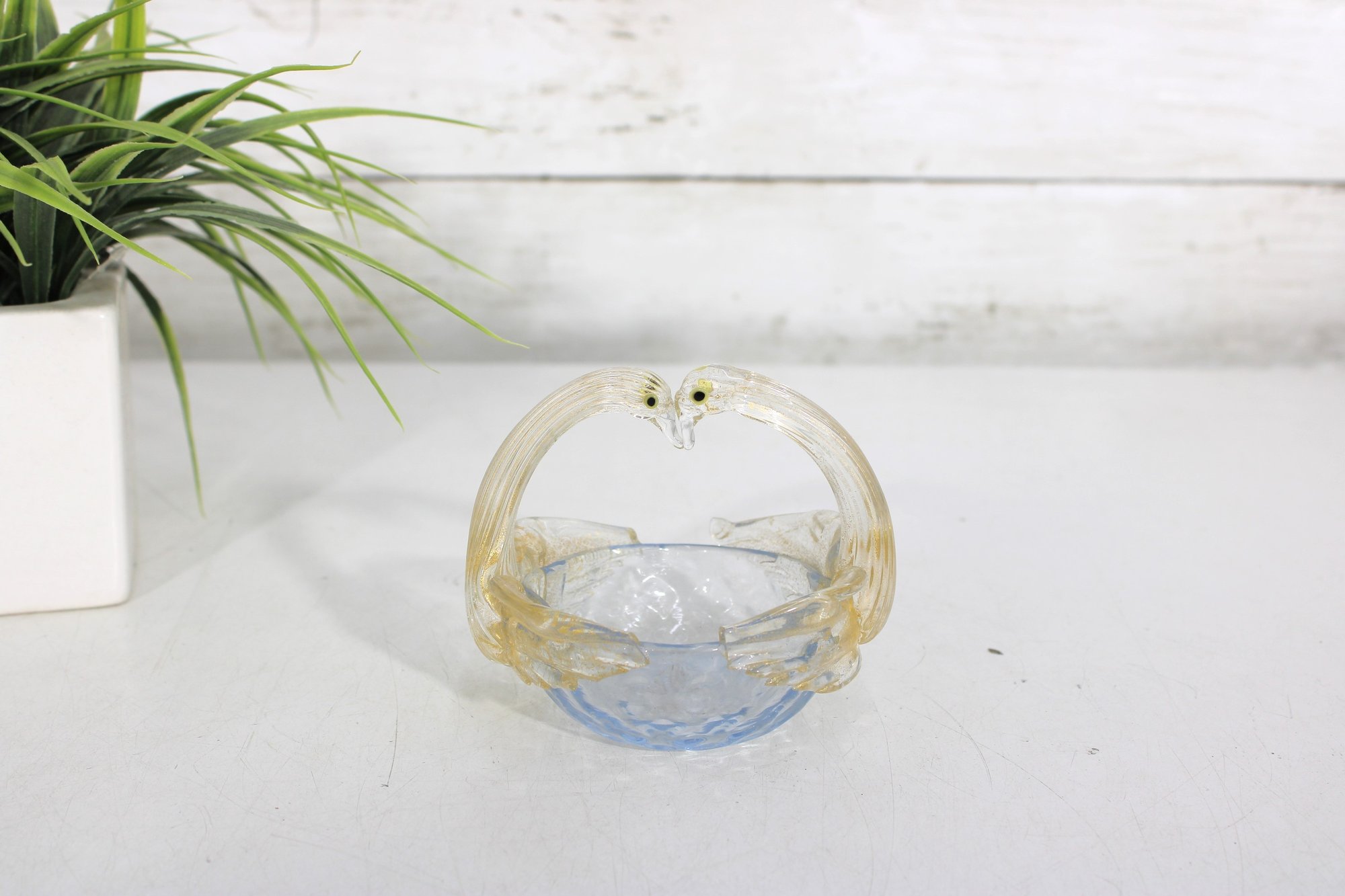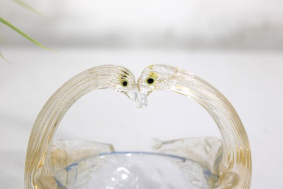 A graceful hand-blown art glass swan figurine, also functioning as a small decorative dish or basket, crafted in the Murano-style tradition. The piece features two elegantly arched swan necks forming the handle, with applied glass eyes and softly ribbed wings flowing into a shallow bowl.