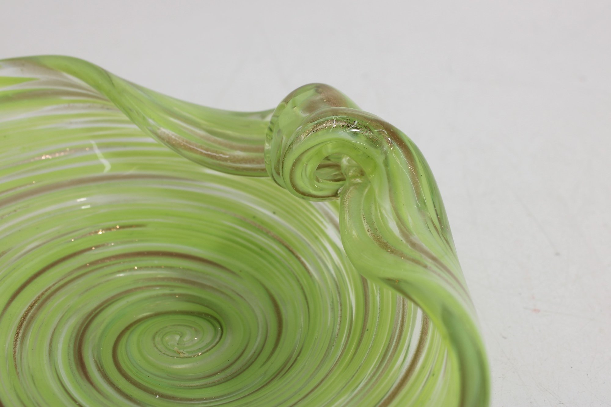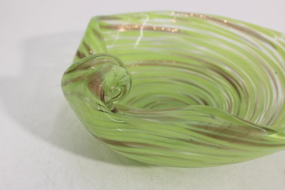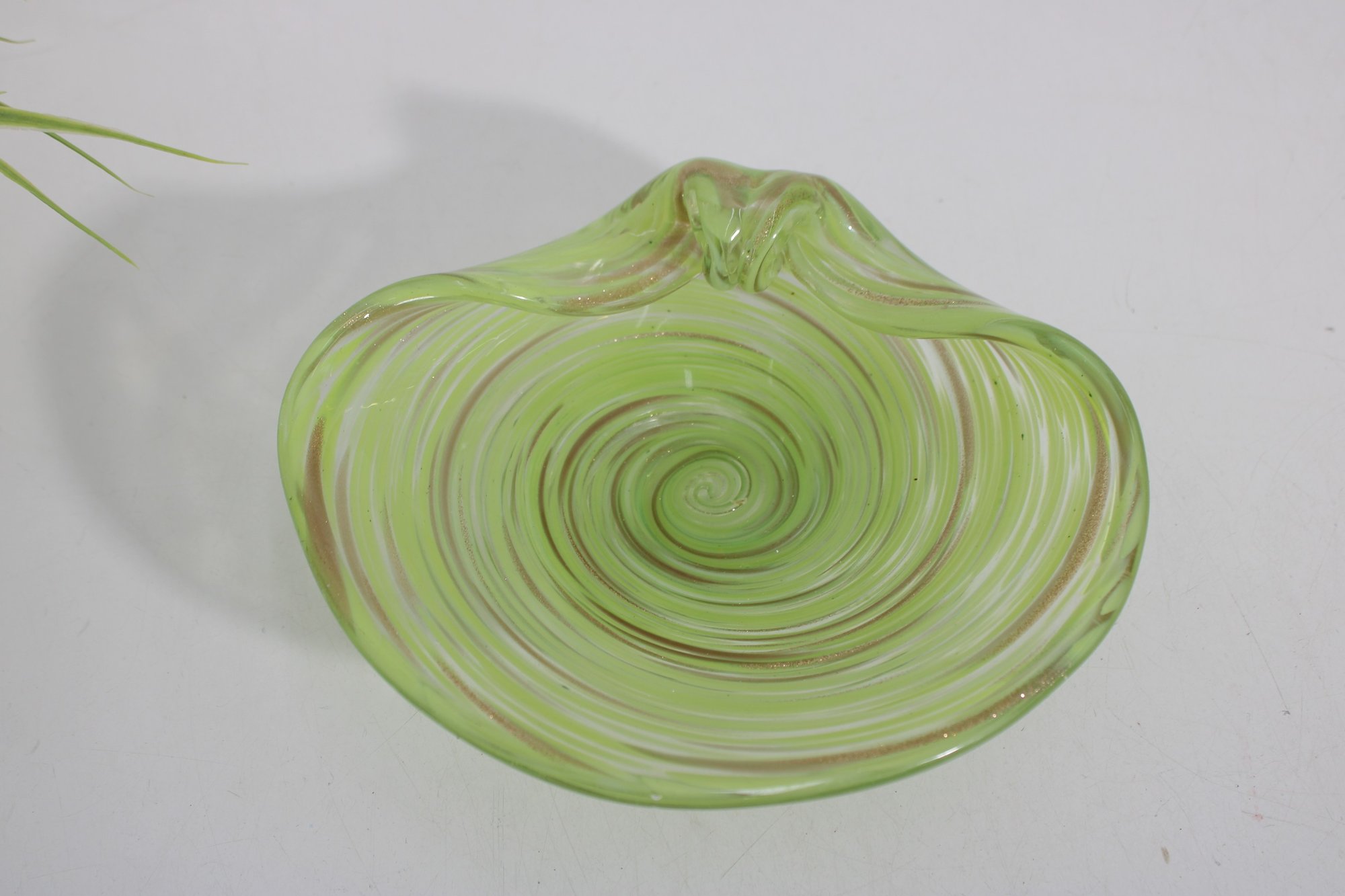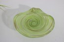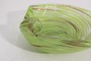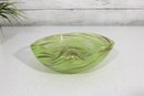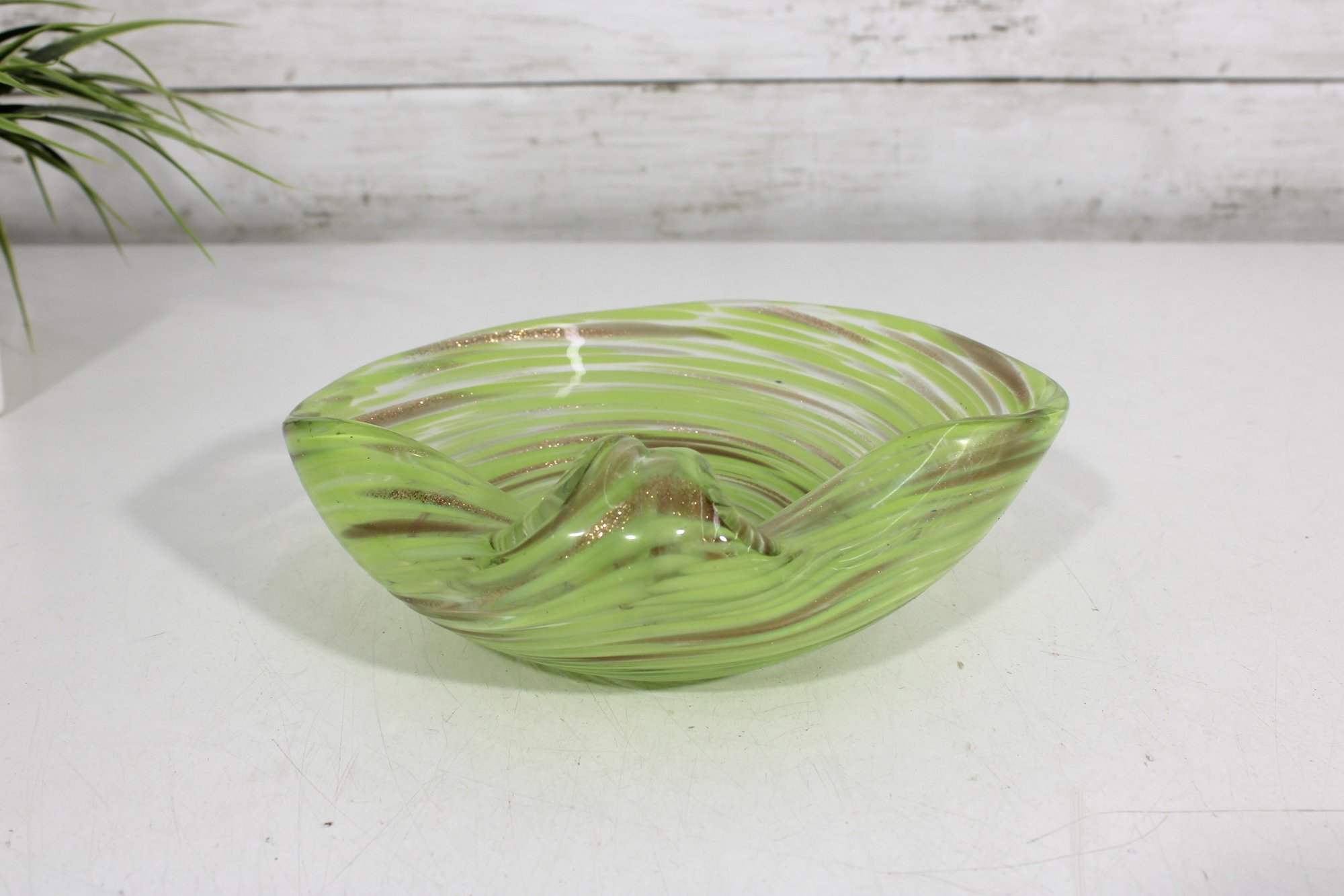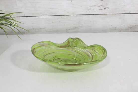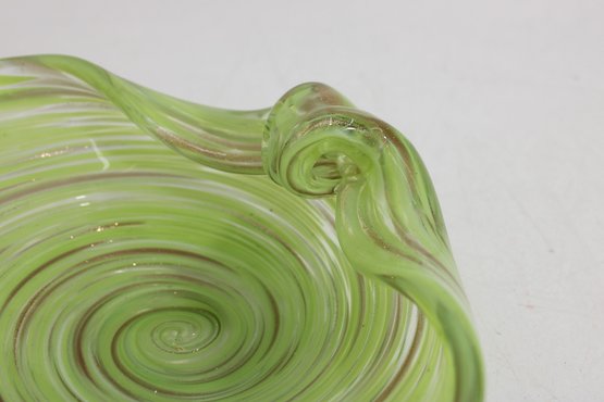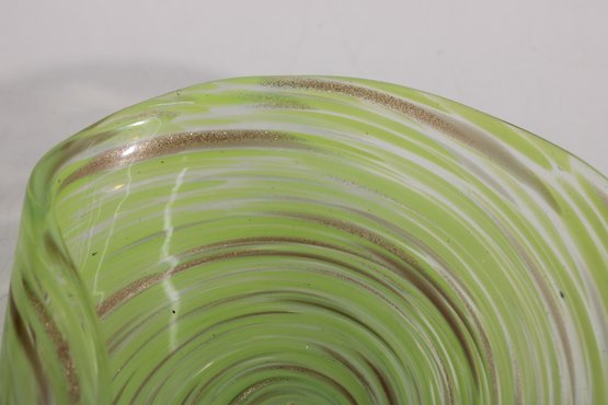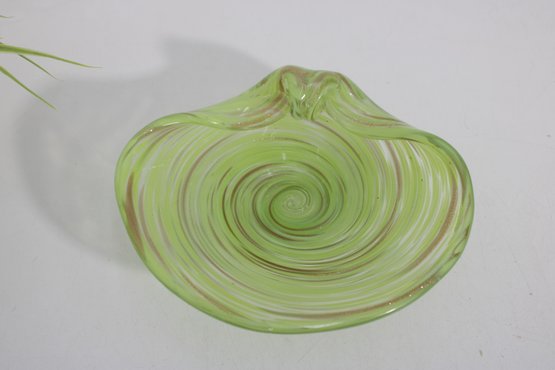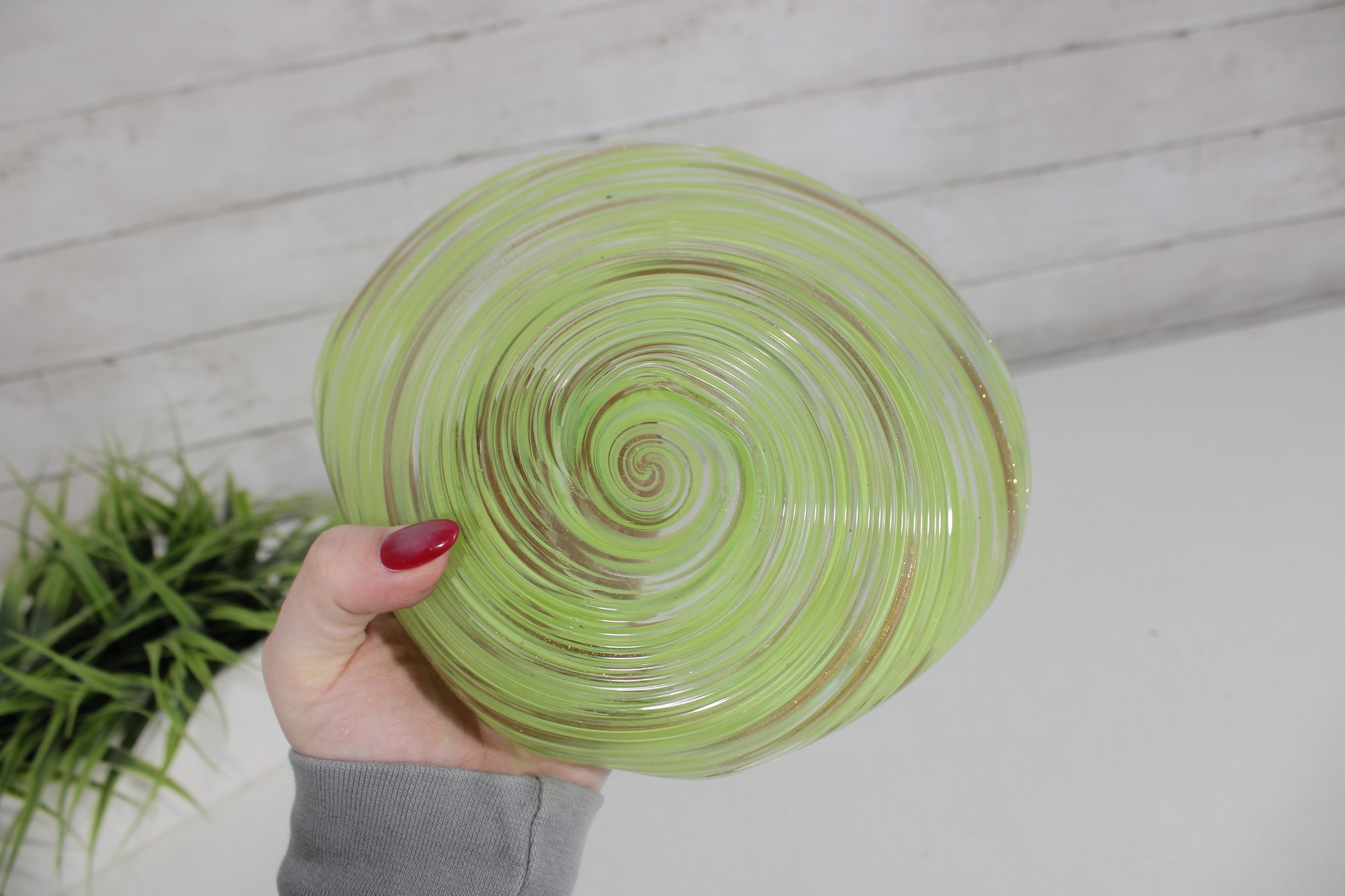 The translucent glass showcases layered tones of lime green with subtle accents, creating a mesmerizing spiral effect that draws the eye to the center. Perfect as a decorative centerpiece, candy dish, or display accent for any modern, retro, or eclectic décor.