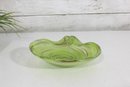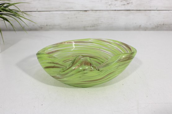 Striking and unique, this hand blown art glass bowl features a vibrant green color with elegant swirling patterns throughout. The freeform, organic shape includes a beautifully sculpted folded rim, giving the piece movement and artistic flair.