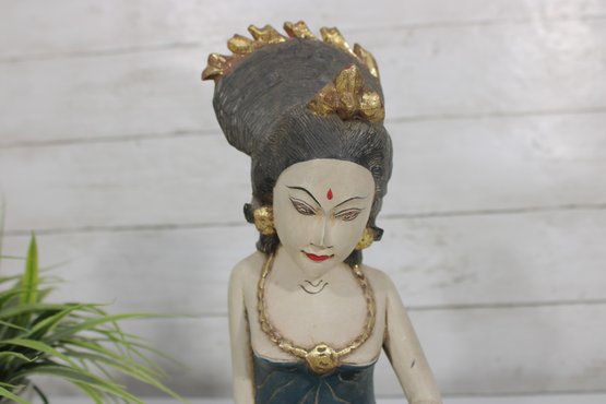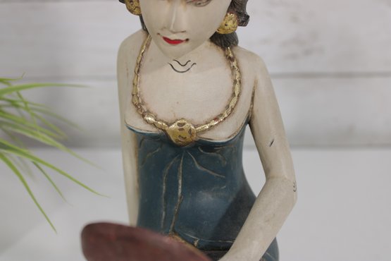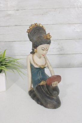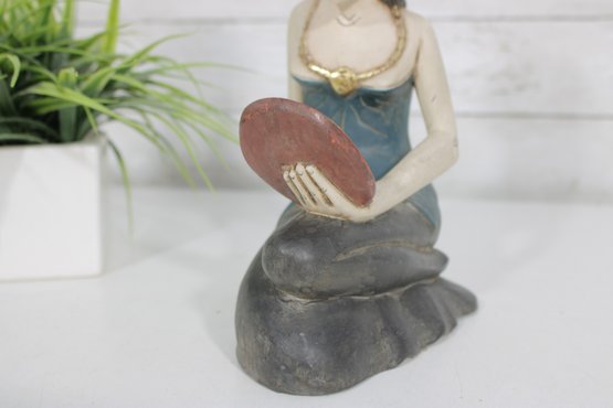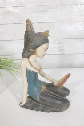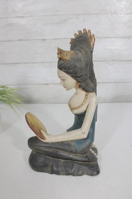 Beautiful hand-carved Balinese style female figure sculpture, depicting a seated woman gracefully holding a mirror. This expressive piece is rendered in carved wood with hand-painted polychrome details, including a serene facial expression, traditional jewelry, and a richly styled headdress with gold accents.