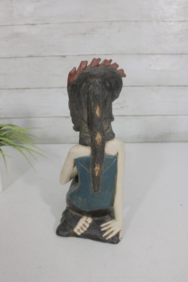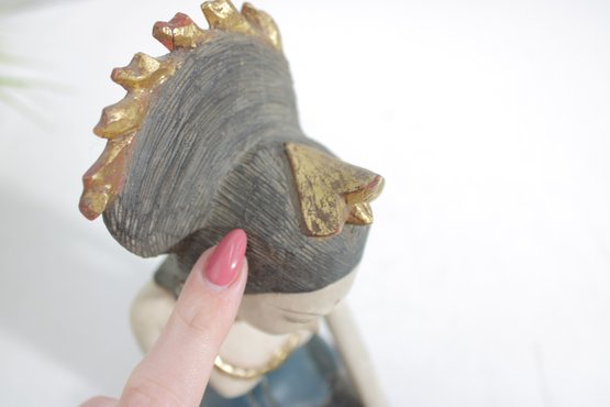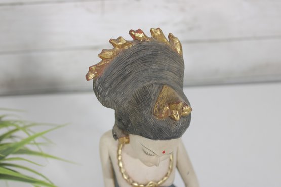 The figure’s pose and adornment reflect traditional Southeast Asian artistry, with fine detailing in the hair, necklace, and garment. The muted yet earthy color palette enhances its artisanal character and decorative appeal.