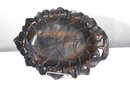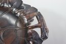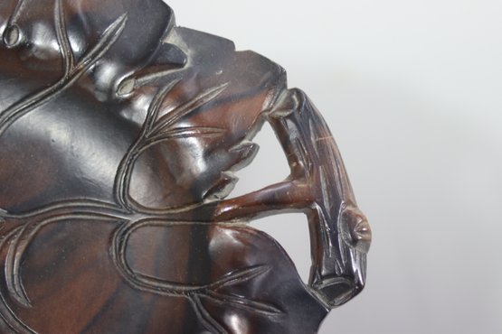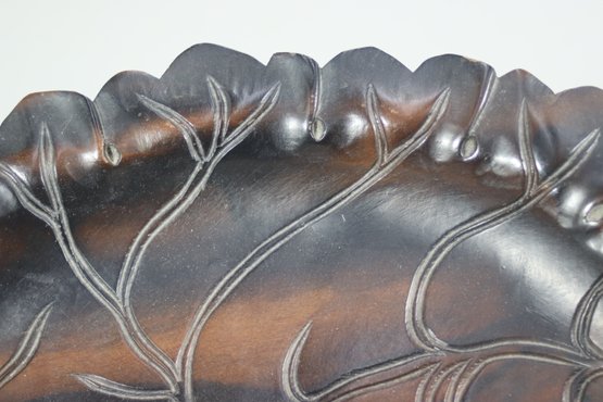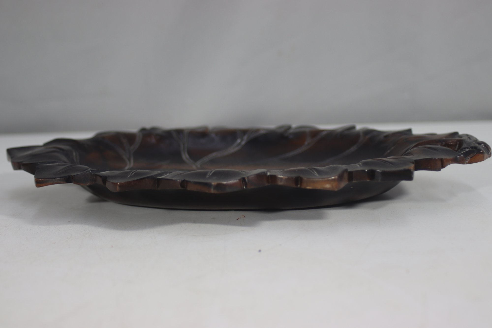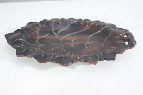 This intricately hand-carved dark wood bowl features a stunning leaf motif with fine detailing along the edges. It has a unique organic shape with a carved handle on one side. Some minor chips and signs of wear are present, adding to its rustic charm. A great decorative piece for any home or collection.