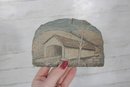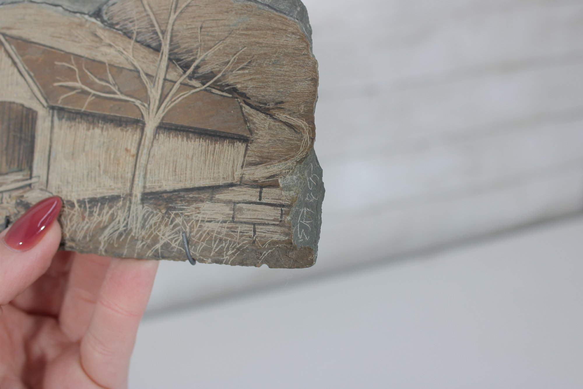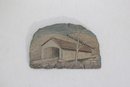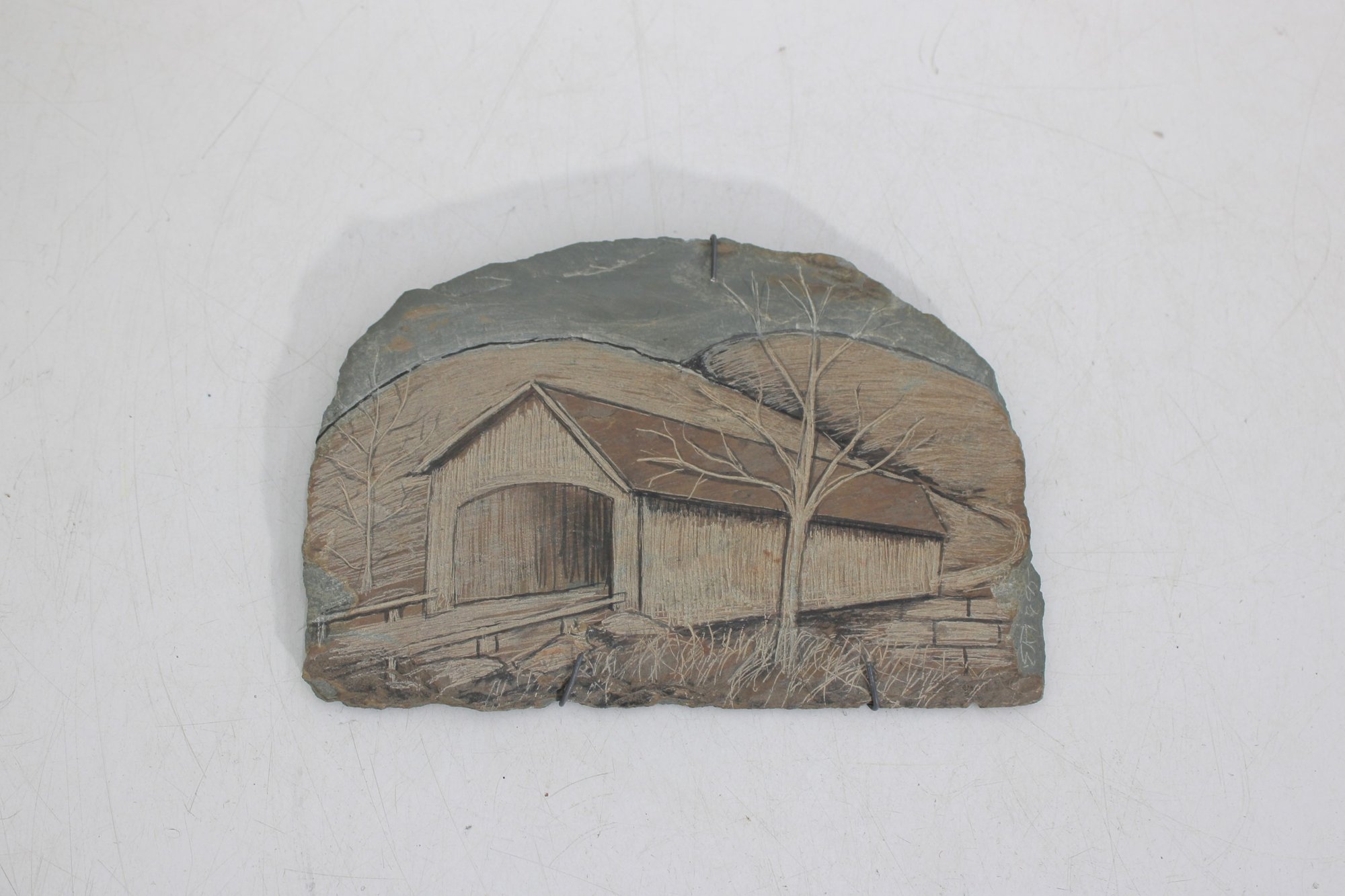 Beautiful hand-carved and etched slate plaque featuring a detailed depiction of a Vermont covered bridge landscape scene. The artwork is carefully etched into natural slate, highlighting rustic architectural details, trees, and rolling hills.