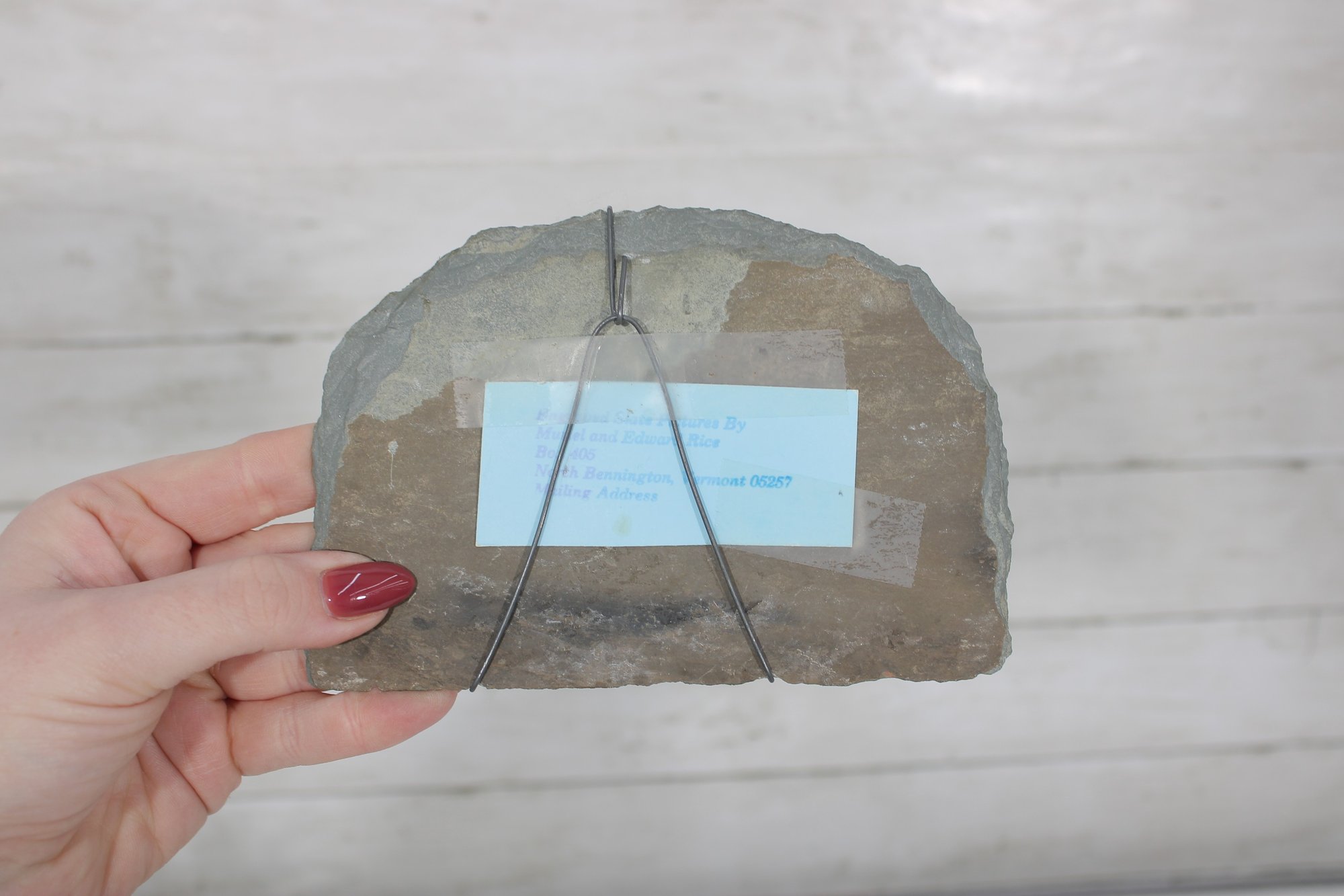 The reverse includes an attribution label for Ed & Muriel Rice, known for Vermont slate carvings.