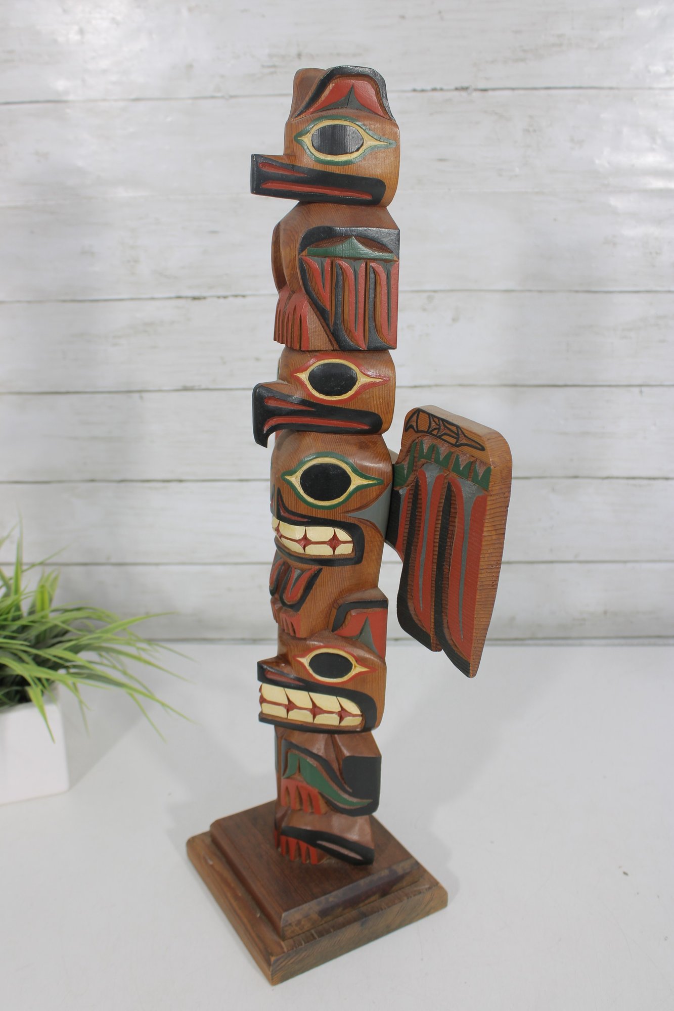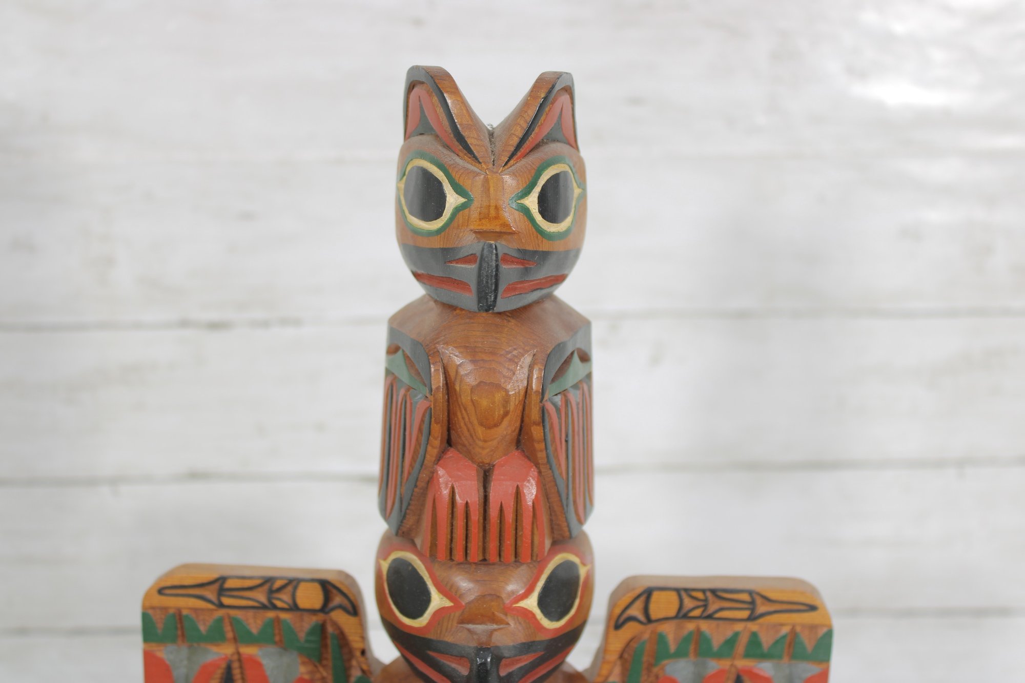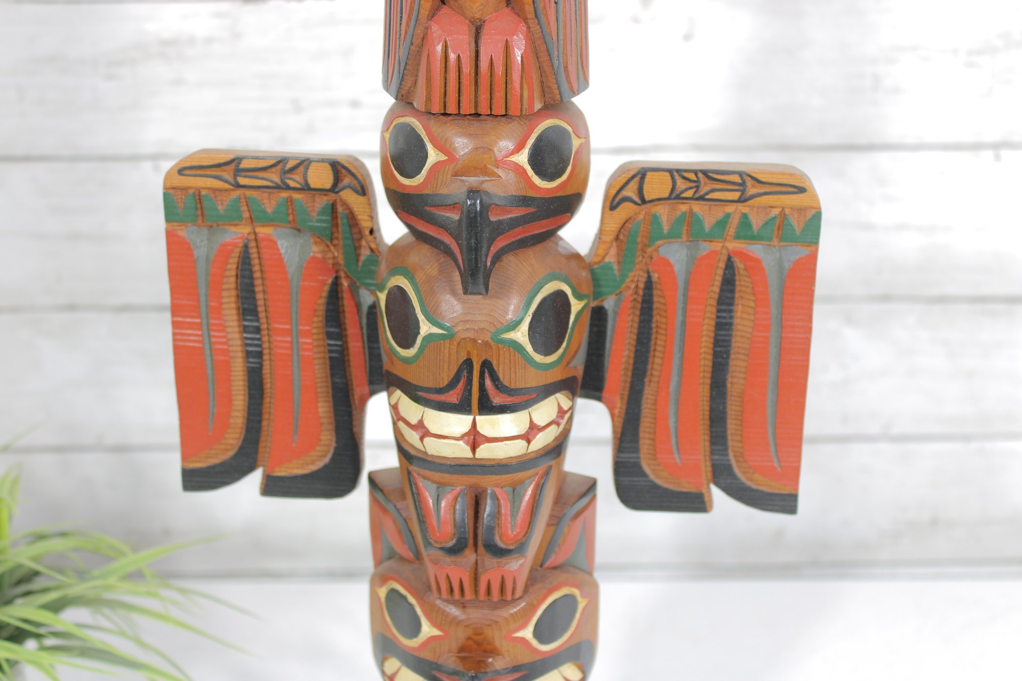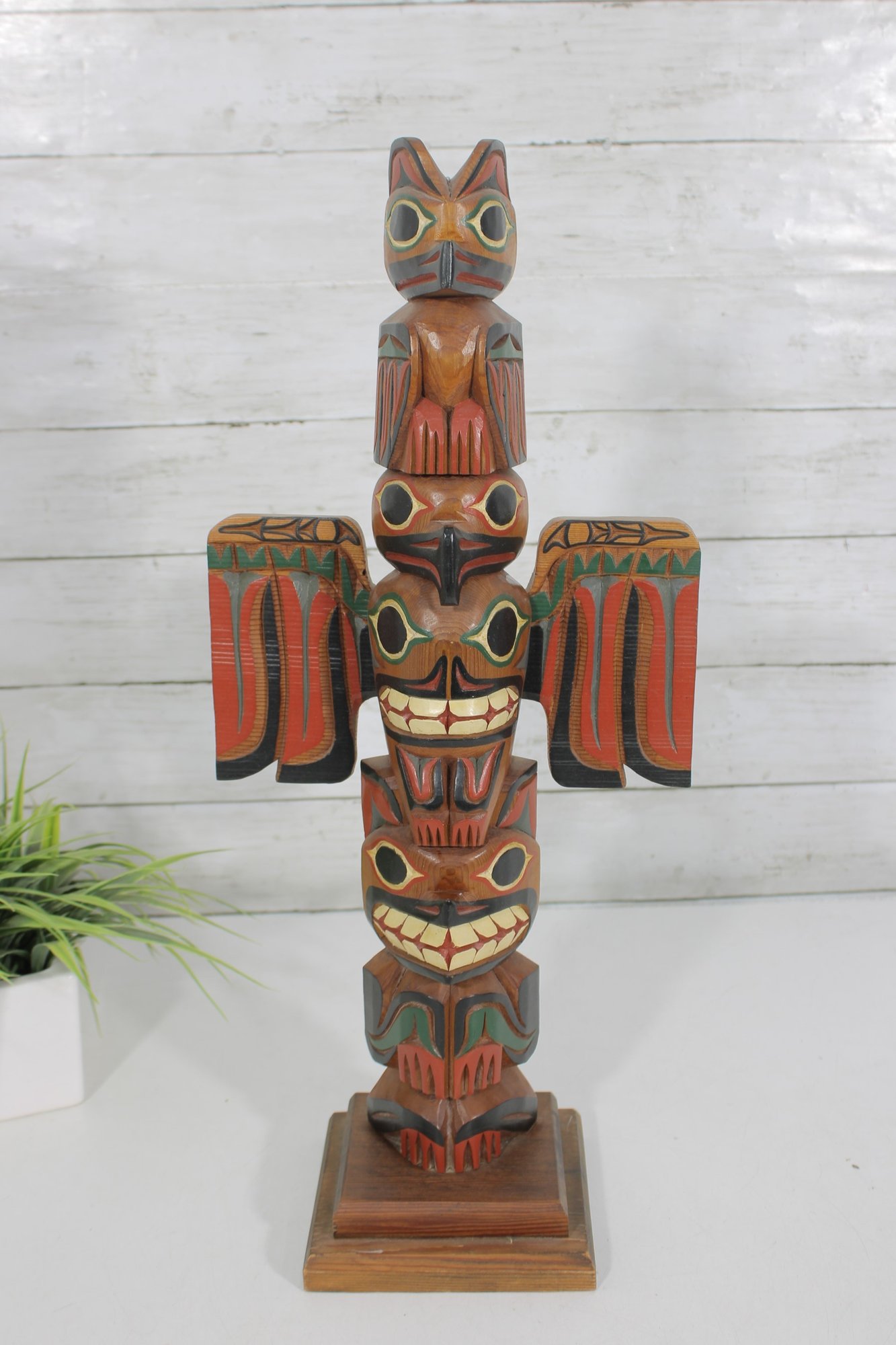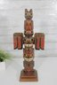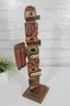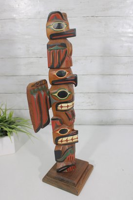 Striking hand-carved and hand-painted Kyan Totem Pole sculpture inspired by traditional Northwest Coast Indigenous art. This decorative wooden totem features stacked animal figures with bold colors and stylized forms, including bird and animal motifs commonly seen in Pacific Northwest totem carving traditions.