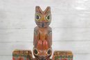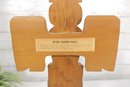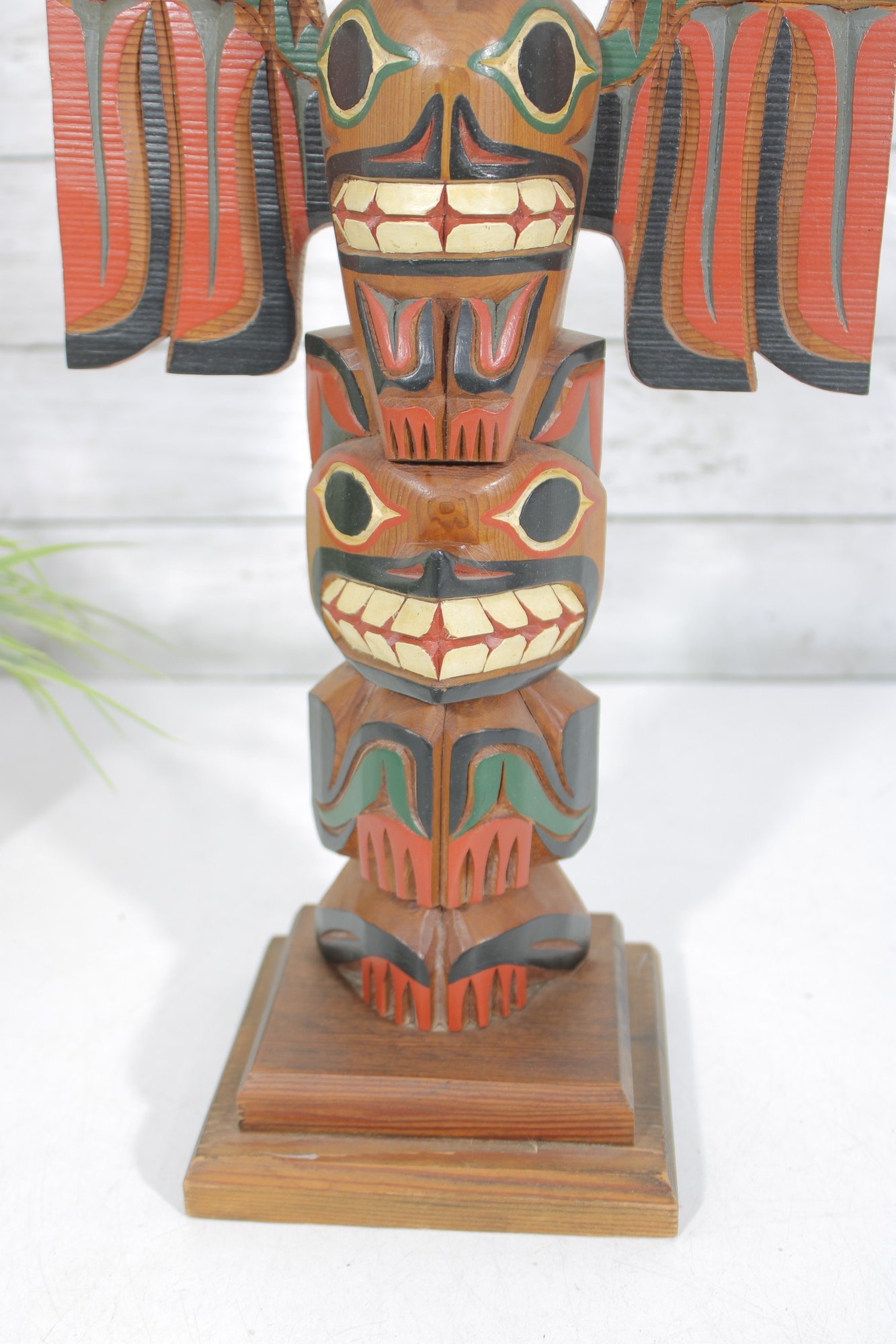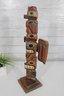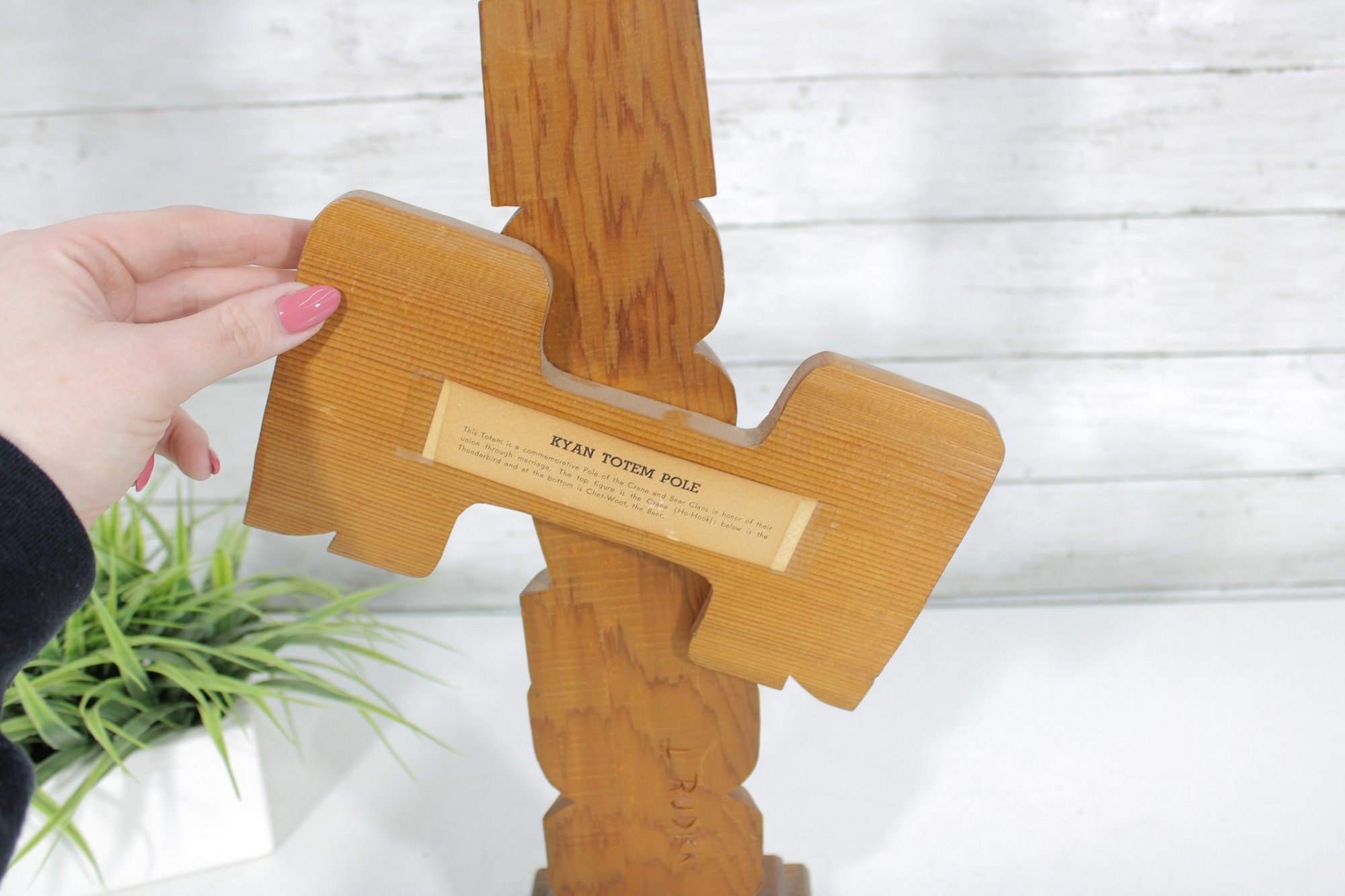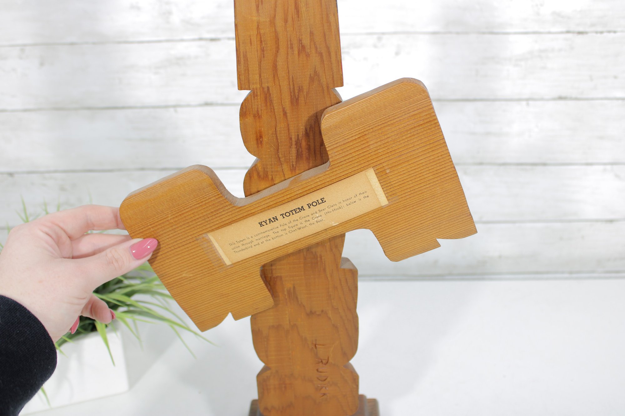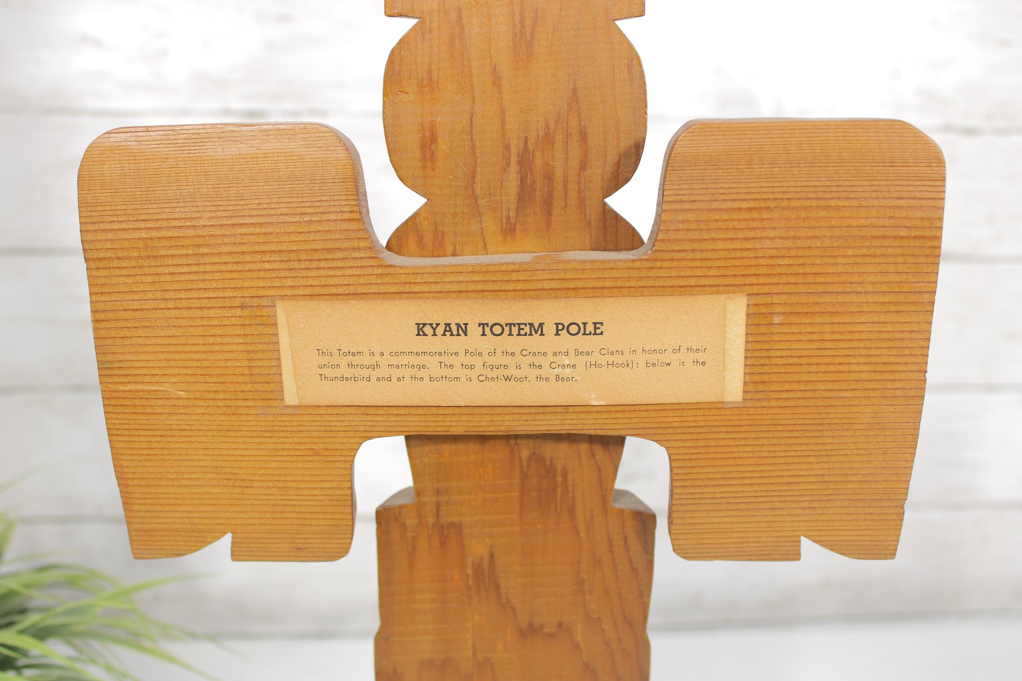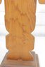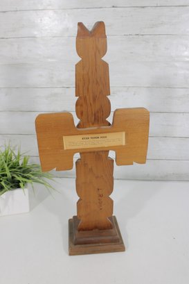 The back of the sculpture includes a label identifying the piece as a “Kyan Totem Pole.” The lower back area also appears to have a carved signature or marking.