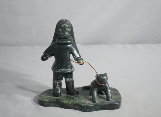 This sculpture features an Inuit hunter in traditional attire, complete with a hooded anorak and intricately etched boots, accompanied by a dog. Both figures are exquisitely carved from a dark, polished soapstone, highlighting the natural grain and coloring of the stone.