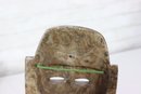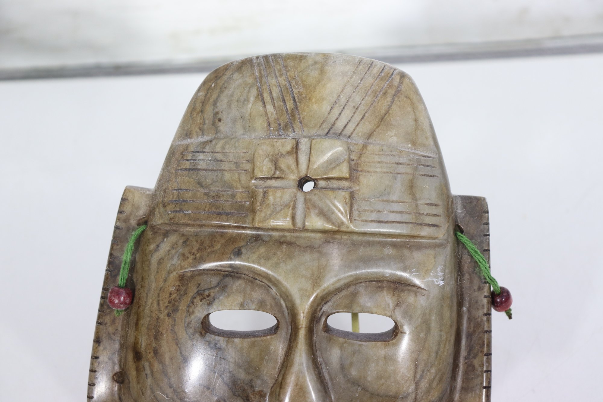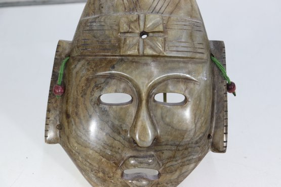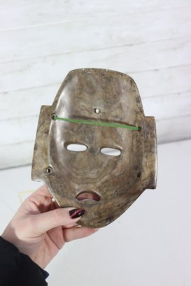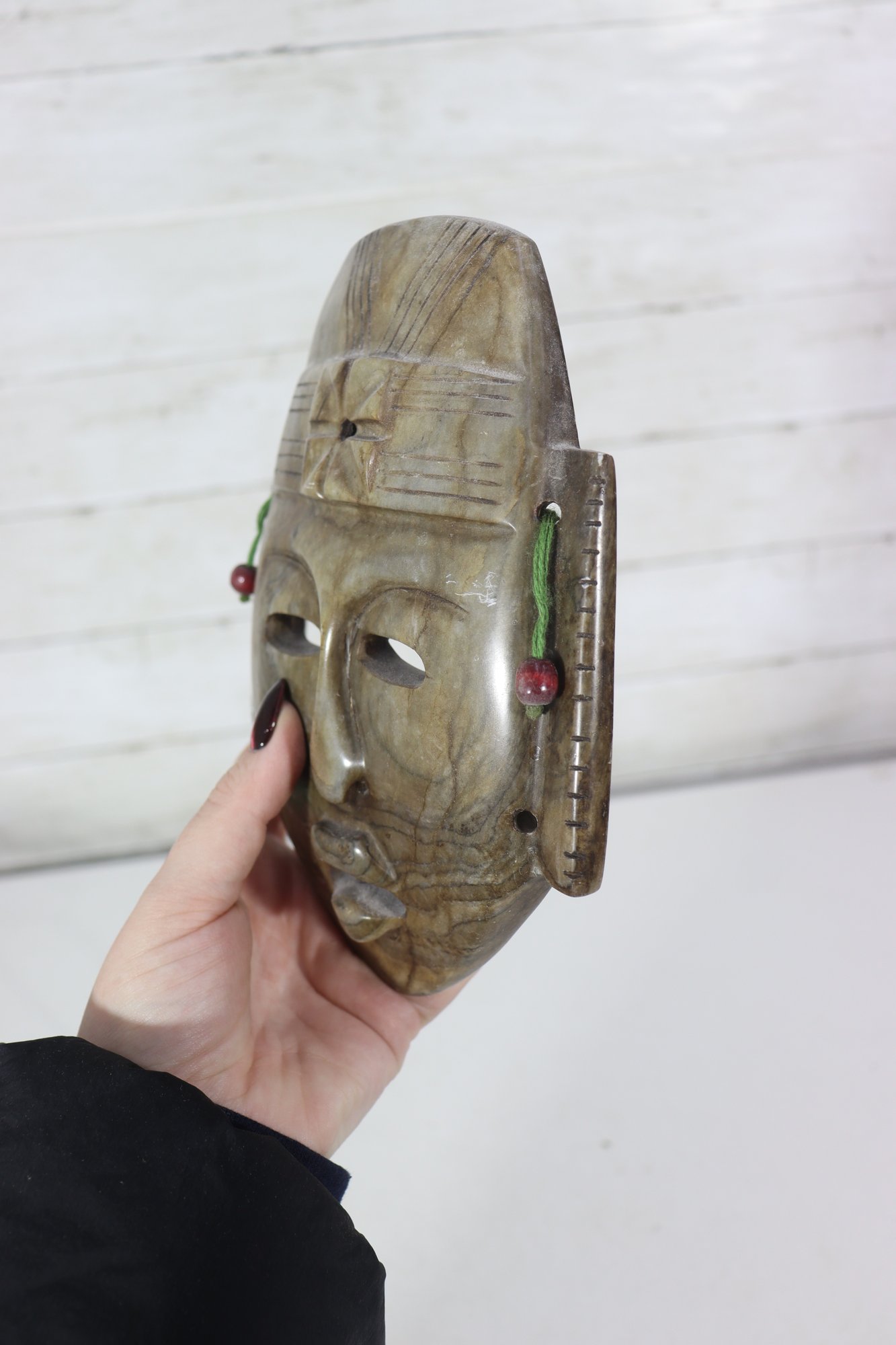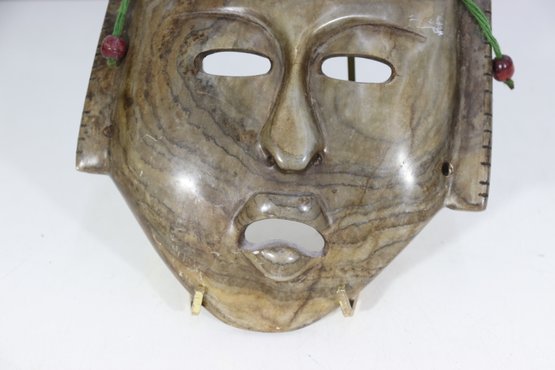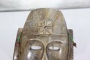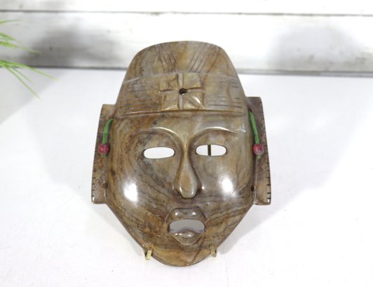 Striking hand-carved stone mask wall sculpture, featuring a stylized human face with strong geometric lines and expressive features. This piece has a smooth, polished surface with natural stone veining that gives it depth and organic character. Small decorative accents on the sides add visual interest and balance to the design.