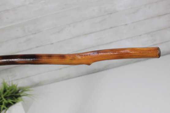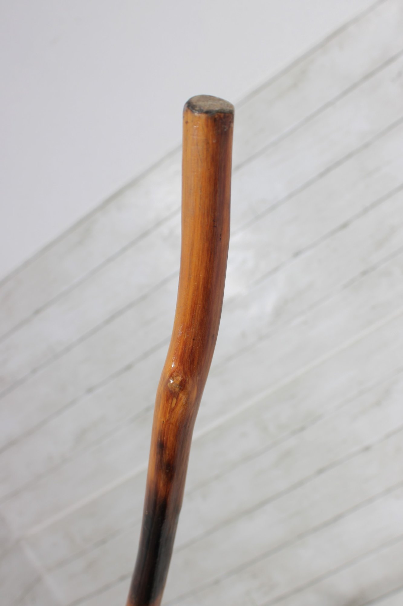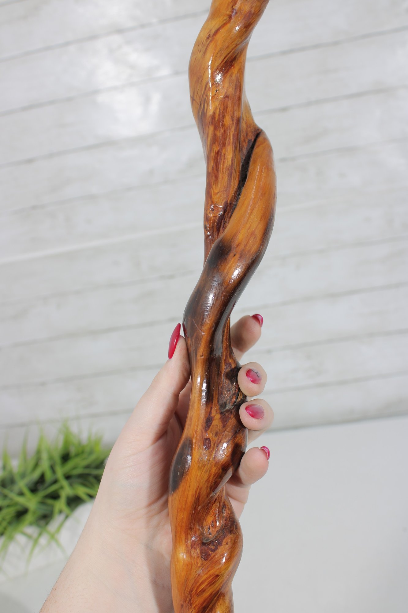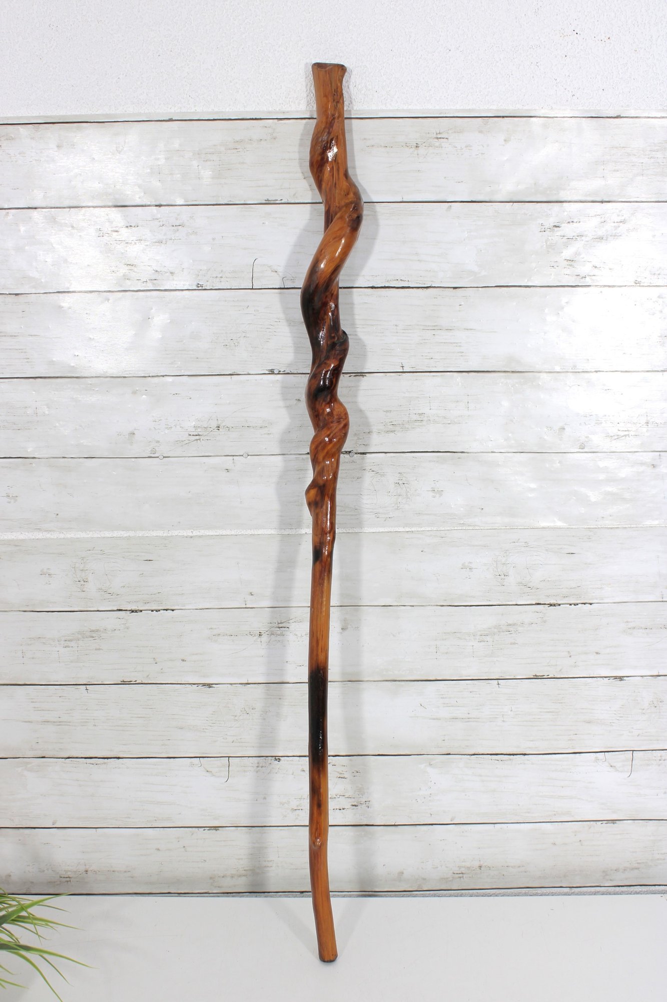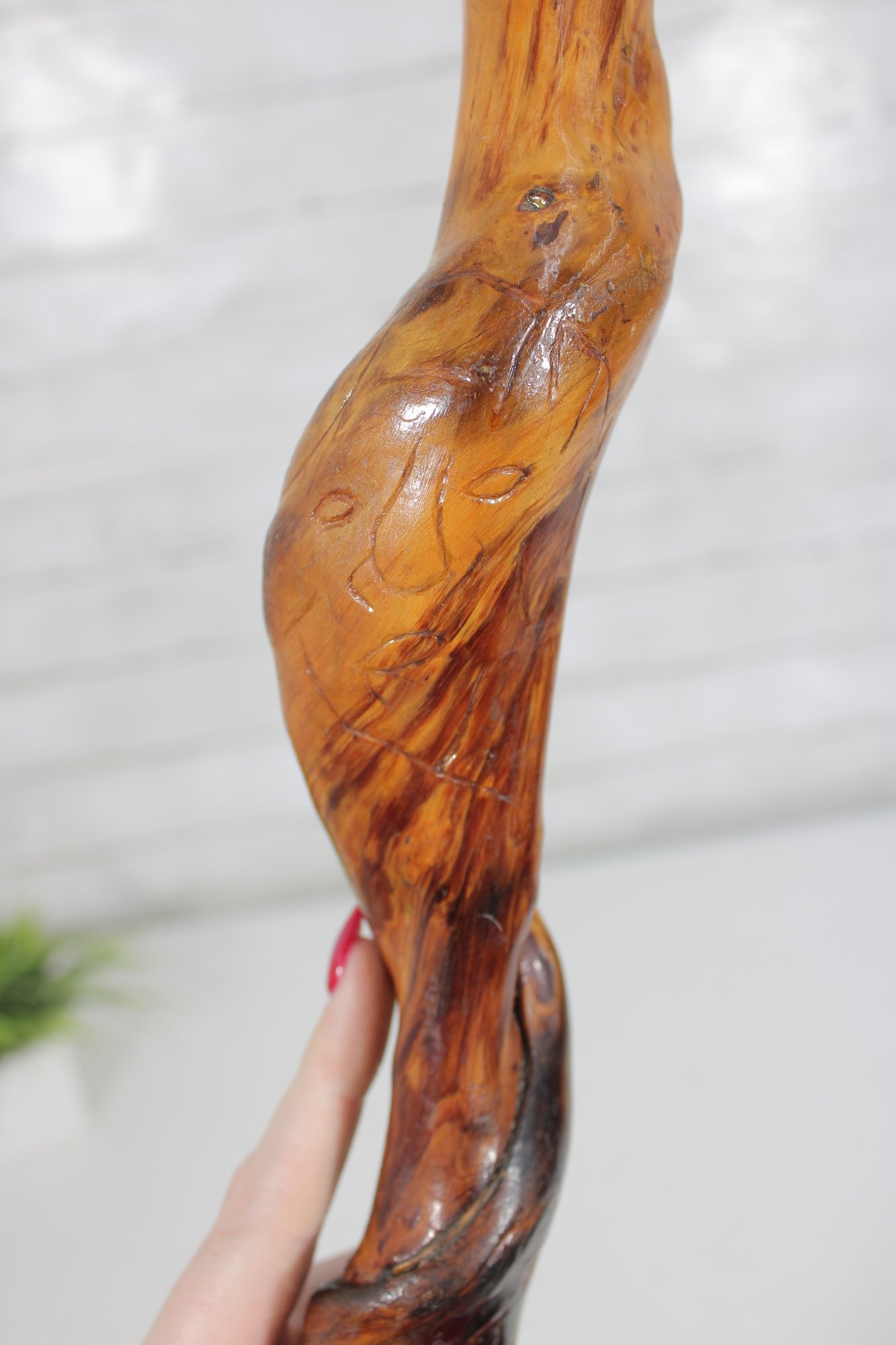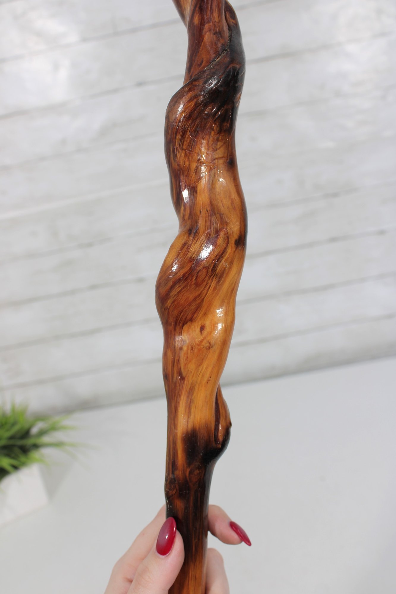 Finished with a smooth polish, this piece blends functionality with artistry—perfect as a walking aid, decorative staff, or rustic accent. The rich tones and natural variations in the wood make it especially appealing for collectors or those who appreciate handcrafted items.