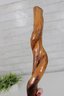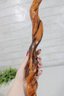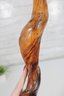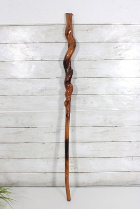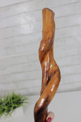 Beautiful hand-carved wooden walking stick featuring an organically twisted design that highlights the natural grain and character of the wood. The sculptural shaft showcases flowing curves and knots, giving it a unique, one-of-a-kind appearance.