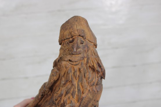 Unique hand-carved wooden sculpture depicting a bearded man, likely inspired by a rustic woodsman or folkloric figure. This striking piece appears to be carved from a natural piece of wood, incorporating organic shapes and grain patterns that enhance its character and one-of-a-kind appeal.