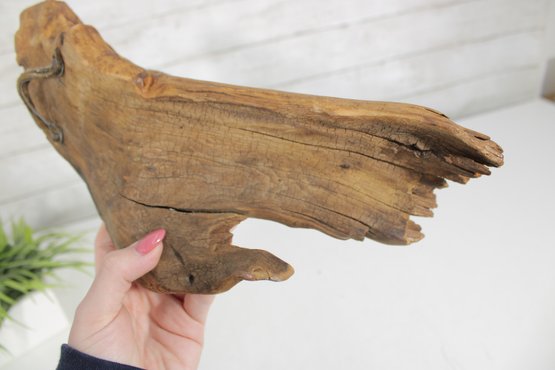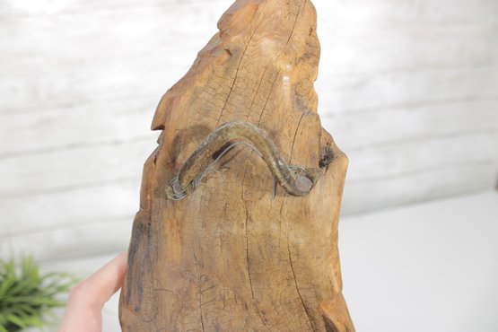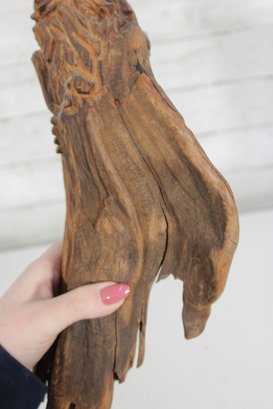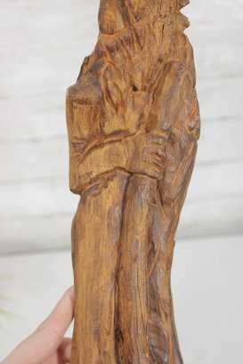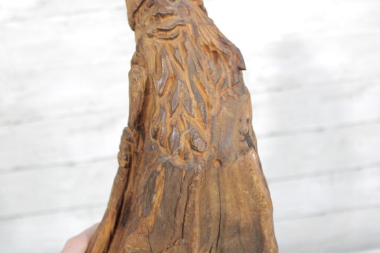 Measuring approximately 14” tall by 6.5” wide, the figure features detailed carving in the face and beard, while the natural contours of the wood form the body and base. The back retains a raw, driftwood-like appearance, adding to its rustic charm and making it an excellent decorative accent for cabin, lodge, or farmhouse-style interiors.