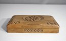A beautifully handcrafted wooden box featuring intricate floral carvings on the lid and sides. Measuring 7.75 inches by 4.75 inches, this box is both decorative and functional. The interior is divided into two compartments, making it perfect for storing small treasures, jewelry, or keepsakes. The natural wood grain adds warmth and rustic charm to this unique piece.
