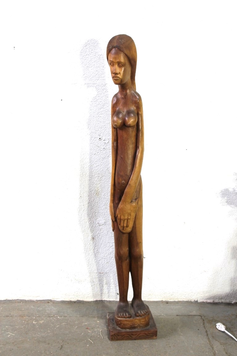 This impressive hand-carved wooden figure stands at 57 inches tall, depicting a graceful and serene female form. The natural wood grain enhances the intricacy of the carving, showcasing a delicate face, flowing hair, and elegantly positioned hands. The sculpture rests on a carved wooden base, and the craftsmanship highlights the skill and artistry of tribal or folk carving traditions.