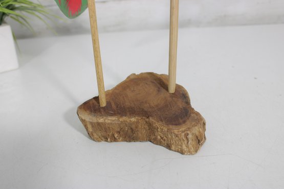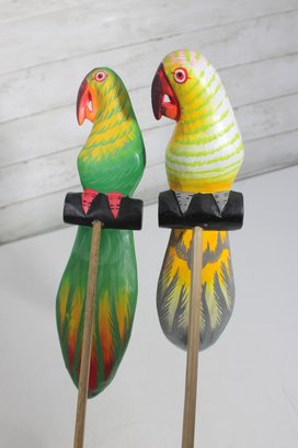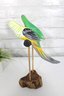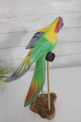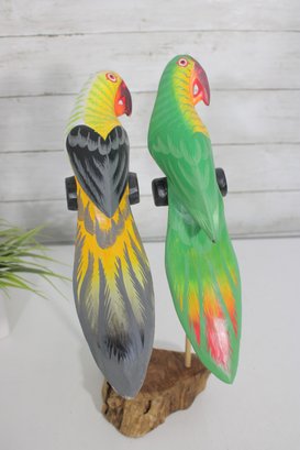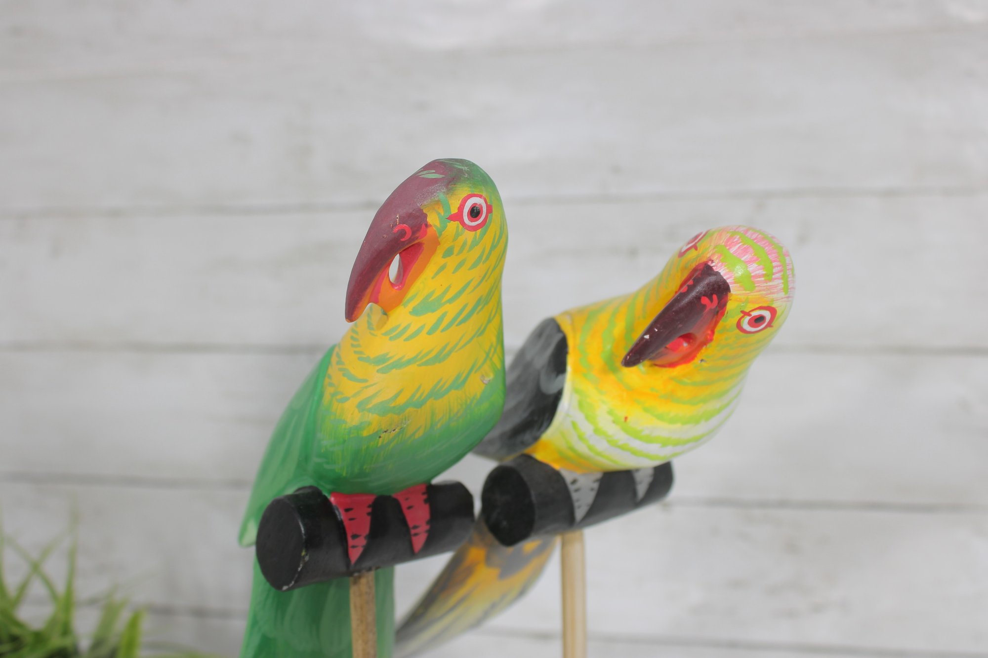 The parrots are richly detailed with bold colors including green, yellow, red, and black, capturing the lively beauty of tropical birds. Each bird is mounted on slender wooden dowels, giving the sculpture height and visual interest, while the natural wood base adds a rustic, organic element.