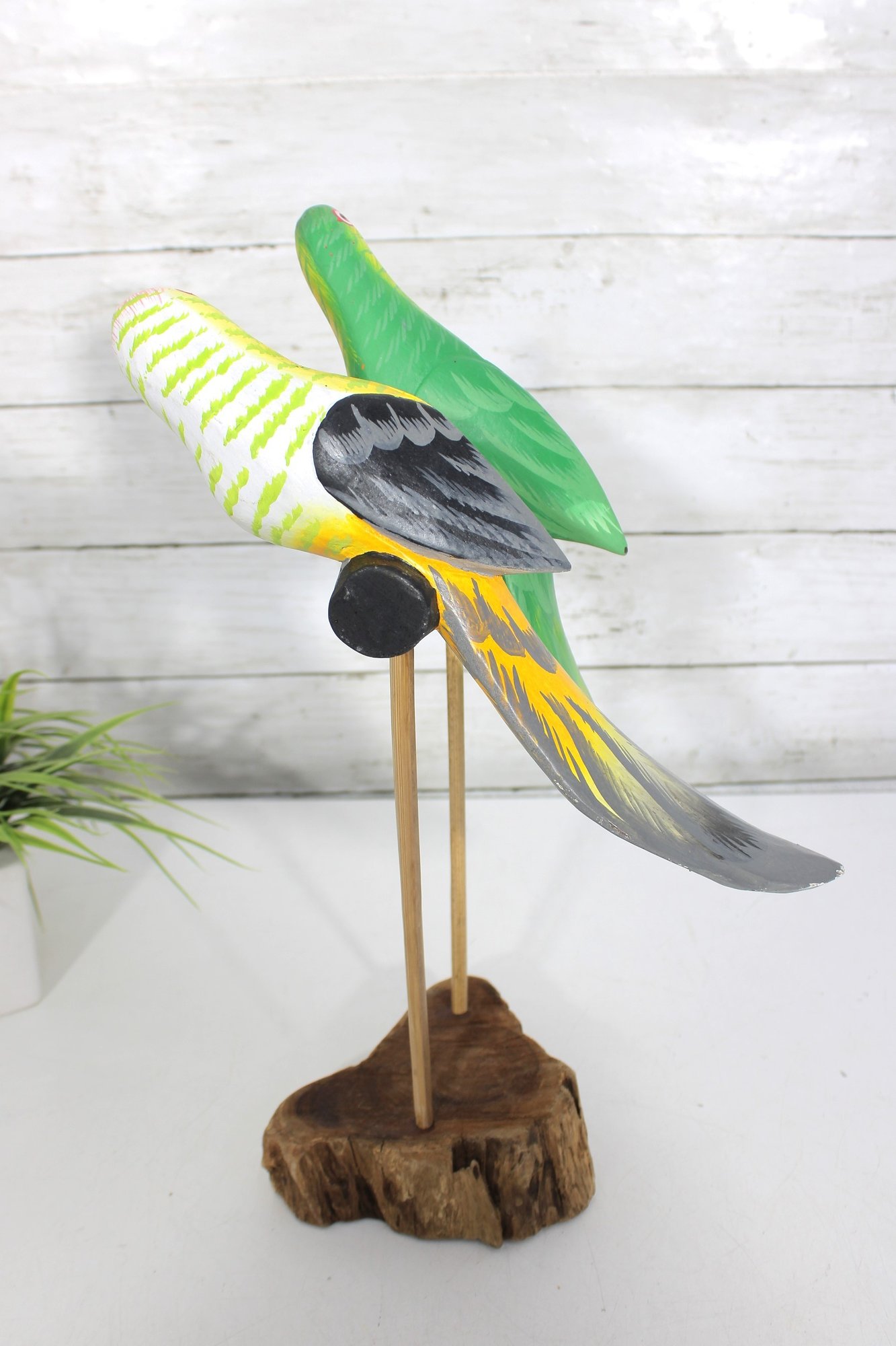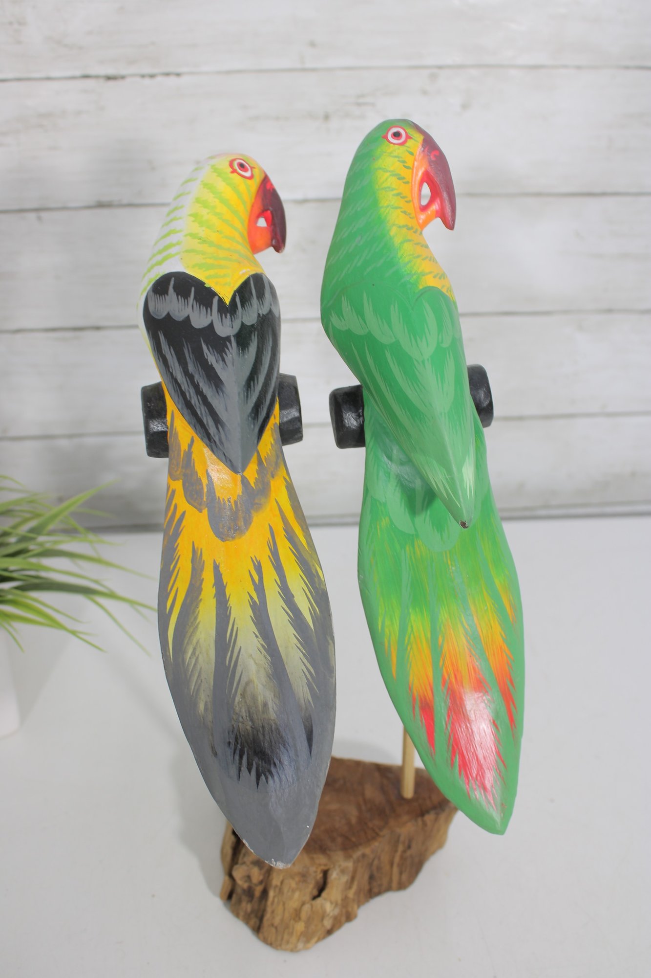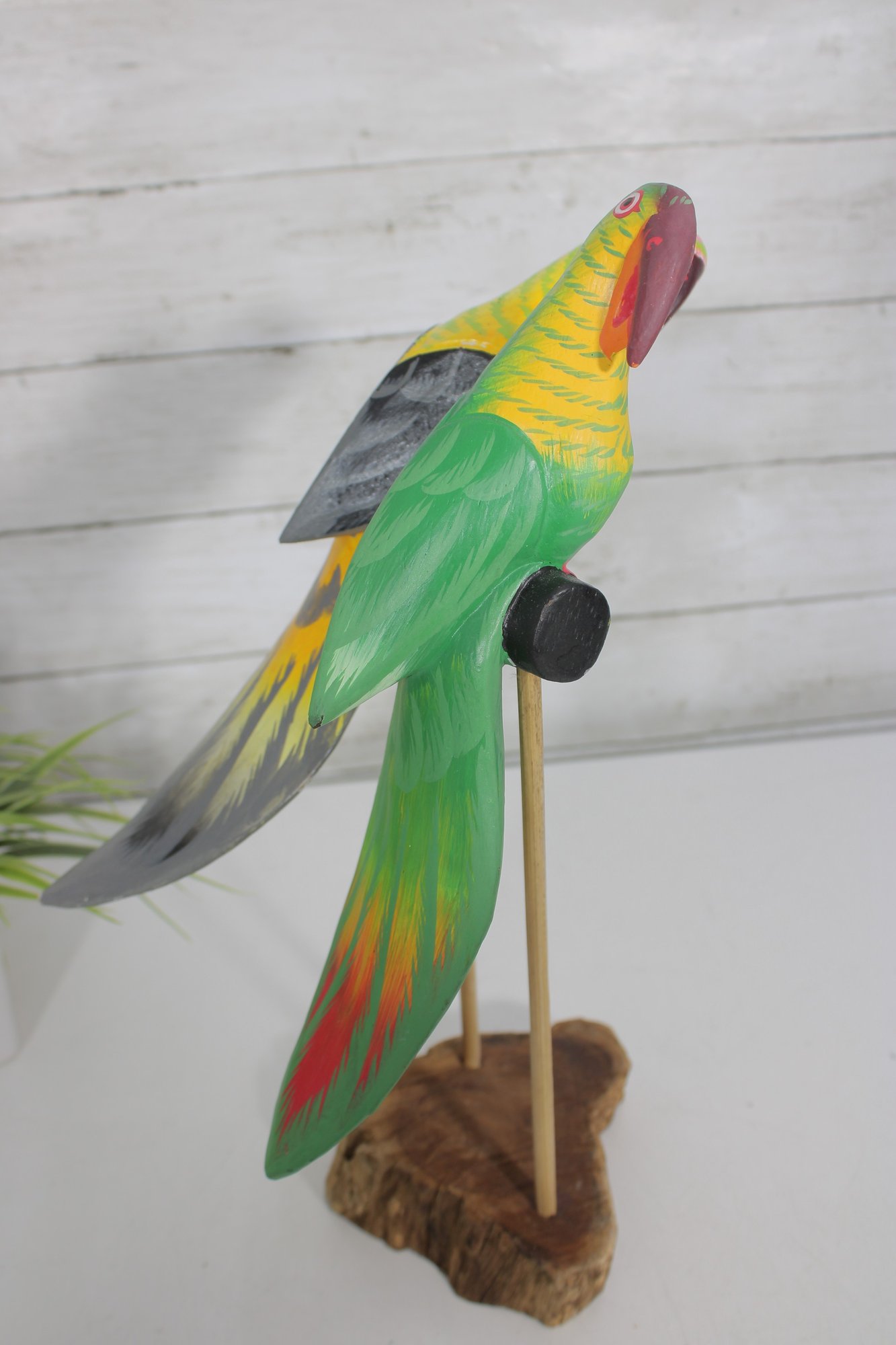 a vibrant tropical touch to your décor with this charming hand-carved wooden parrot sculpture. Standing approximately 14 inches tall, this piece features two brightly painted parrots perched side by side on a natural wood base.