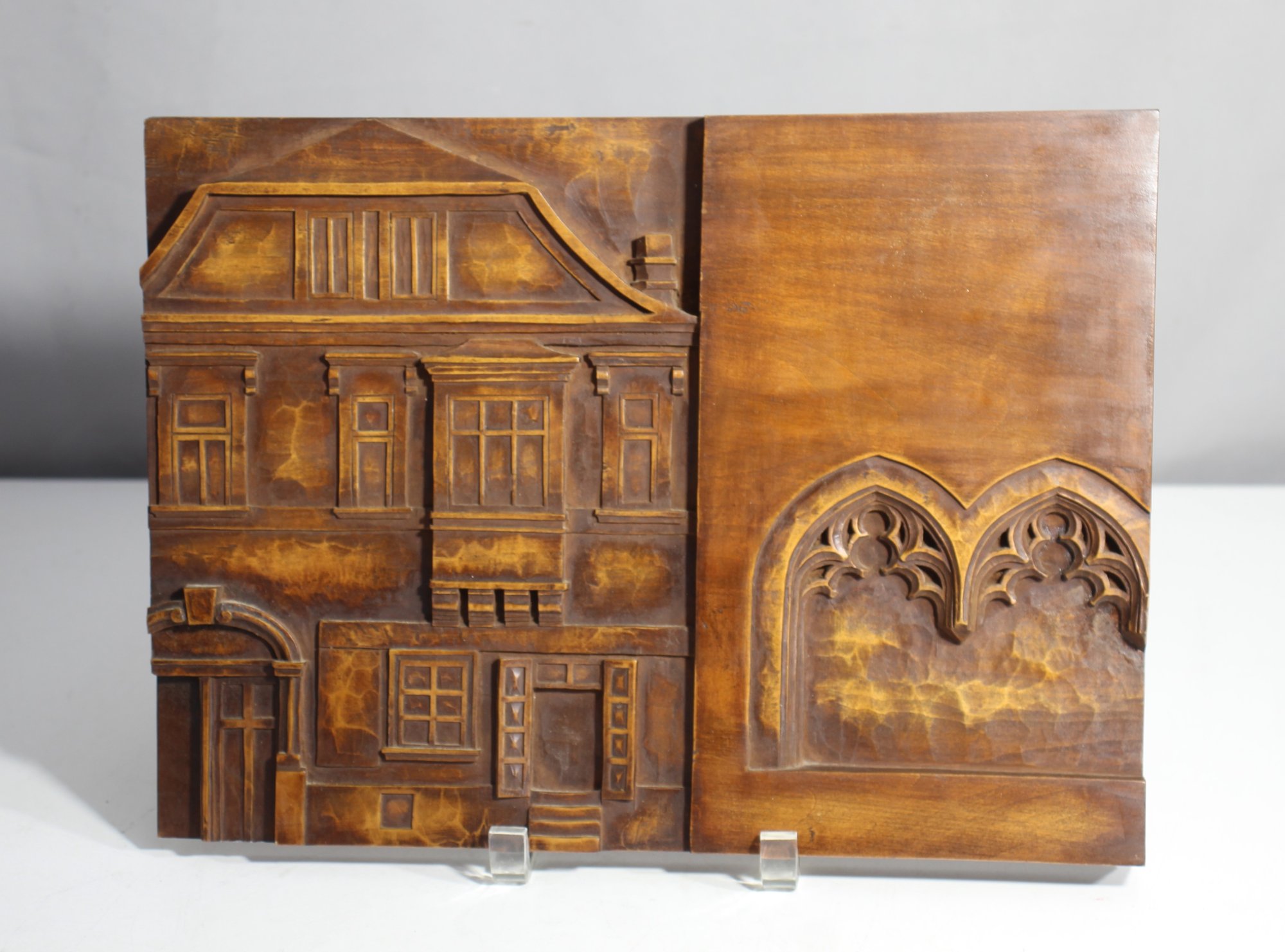 This beautiful hand-carved wooden panel features a detailed relief of architectural elements, showcasing the front of a building and Gothic window designs. Signed and dated 1977 on the back, the craftsmanship is evident in the intricate details and the smooth finish. The back also has handwritten notations, adding to the history of the piece. Ideal for collectors of carved wooden art or those looking for a unique decorative piece.