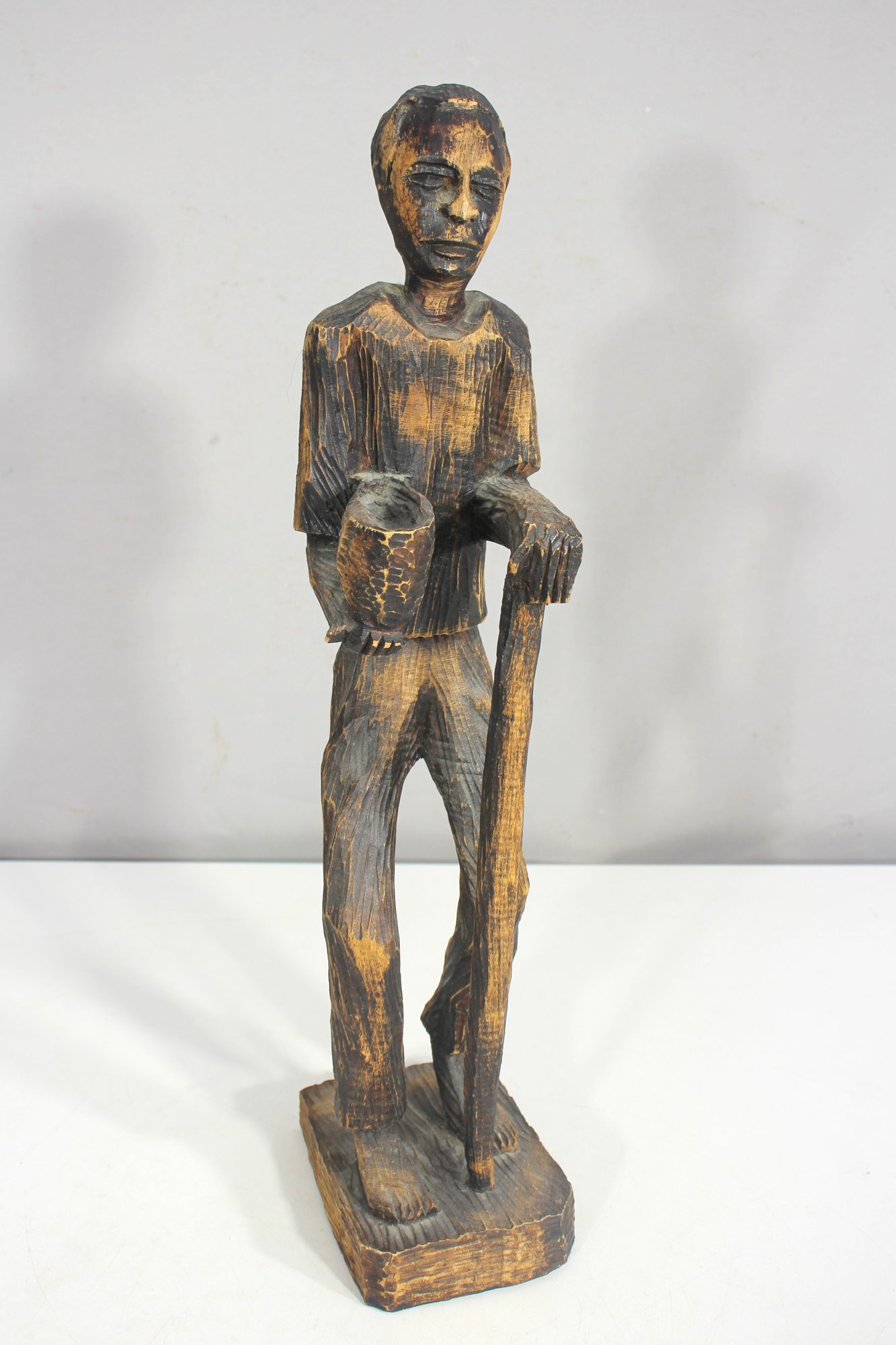 a striking hand-carved wooden sculpture depicting an elderly man standing with a cane in one hand and a cup in the other. Measuring approximately 19 inches tall, this rustic and expressive piece captures a sense of resilience and humility, with detailed carving that highlights the texture and depth of the wood.