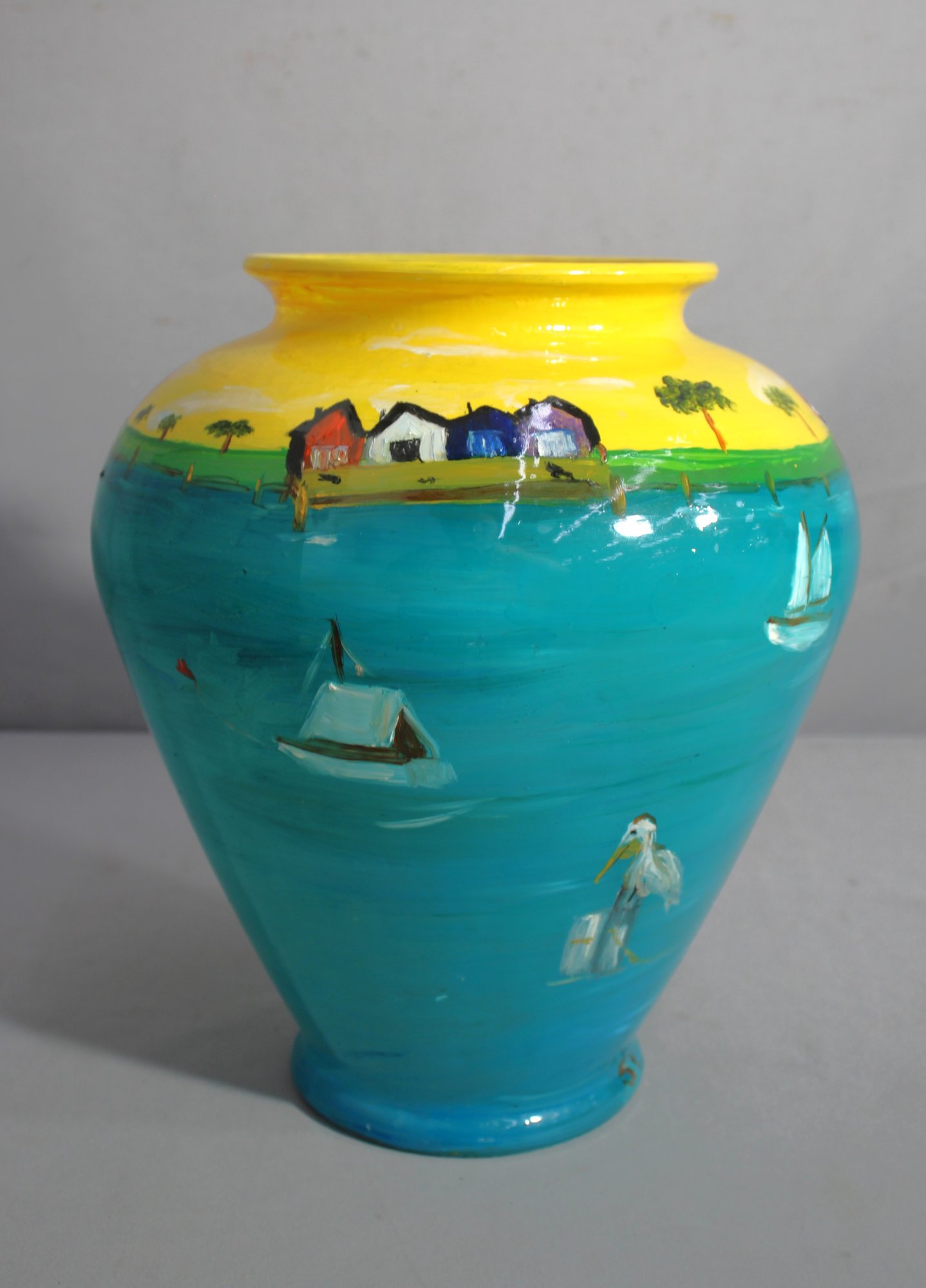 This eye-catching 11-inch hand-painted glass vase is a splendid example of artisan craftsmanship. The vase features a vibrant and colorful panorama of a seaside landscape, complete with quaint cottages, lush trees, and serene sailboats adrift on a striking blue backdrop. The top of the vase is elegantly finished in a bright yellow, contrasting beautifully with the lively scene below. This unique piece is perfect for collectors of fine hand-painted glass or anyone looking to add a touch of charm and color to their home decor.