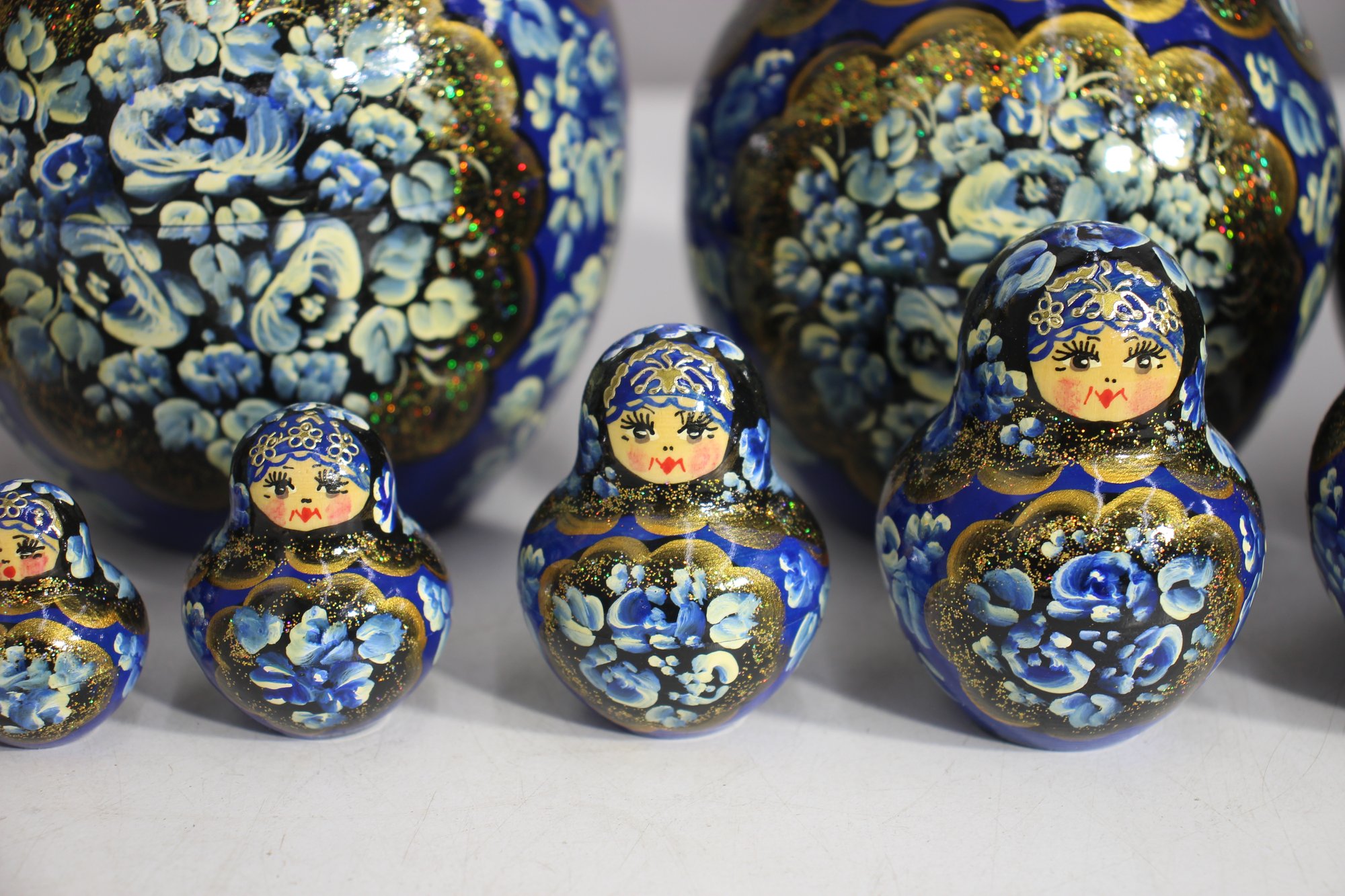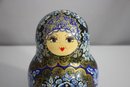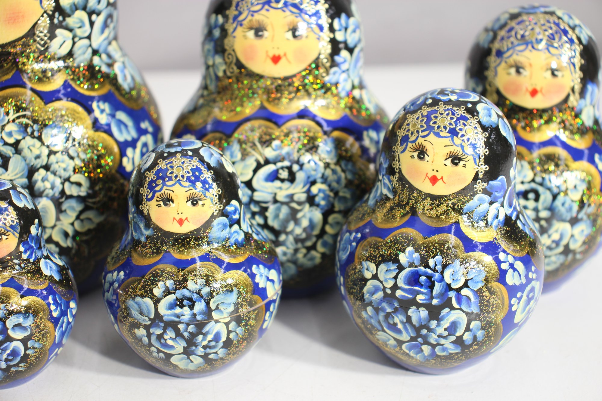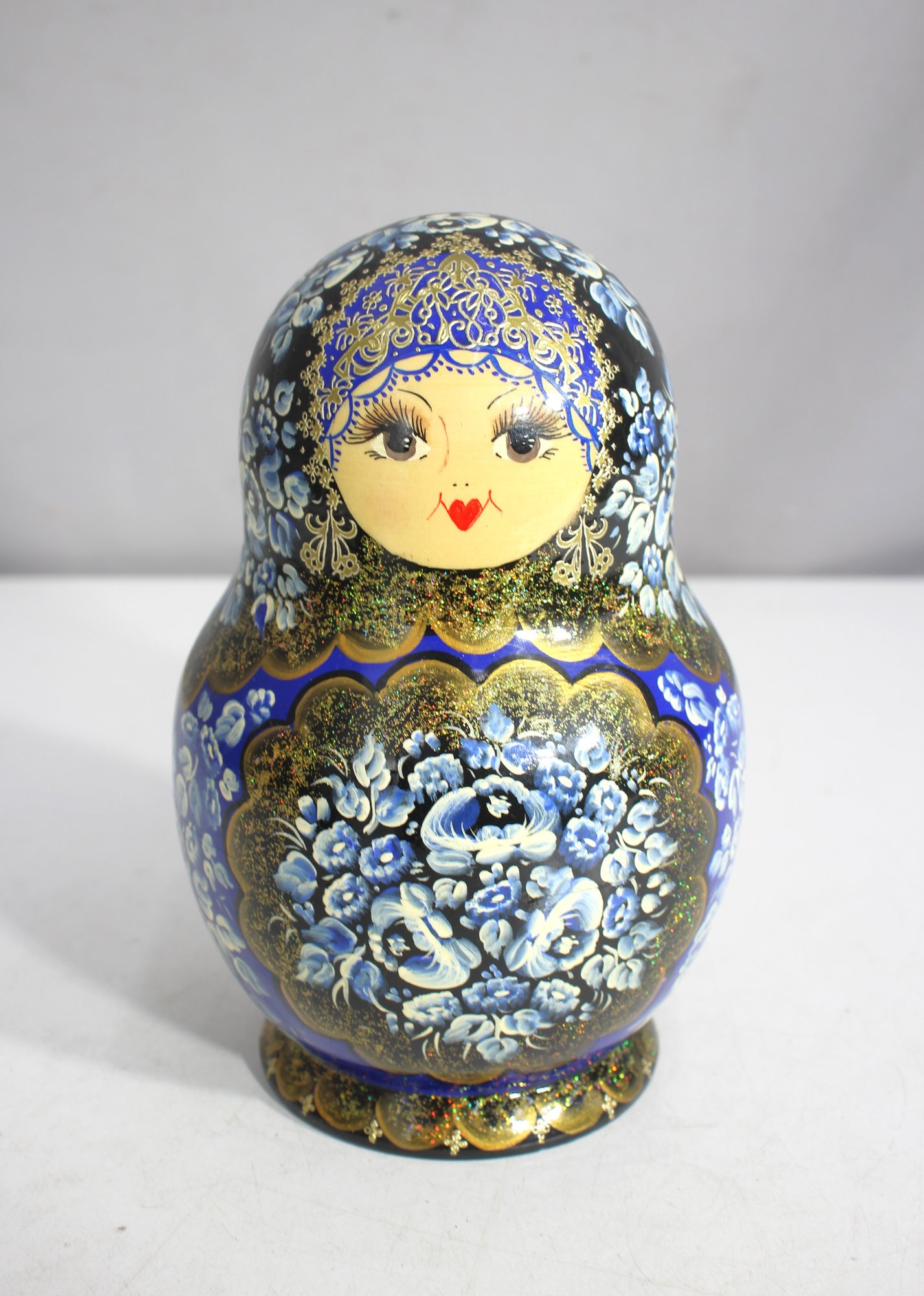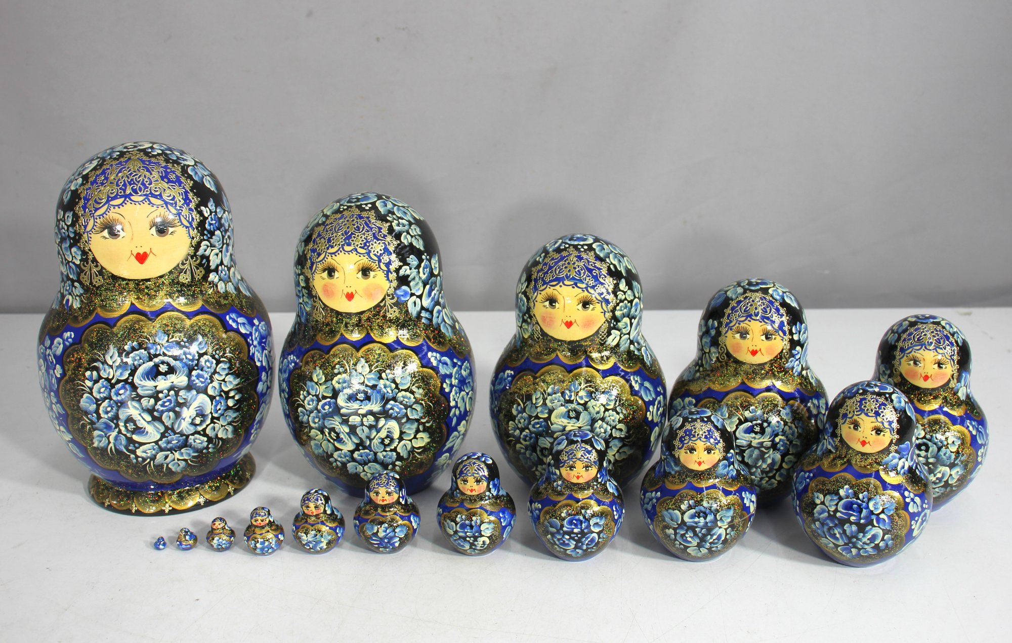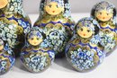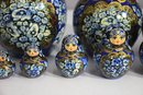 a stunning 15-piece Russian Matryoshka Nesting Doll Set, standing 9 inches tall at its largest. This exquisitely hand-painted set features intricate blue and gold floral patterns, delicate facial details, and traditional Russian artistry.