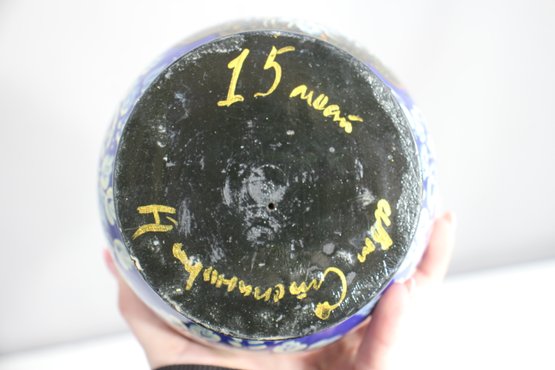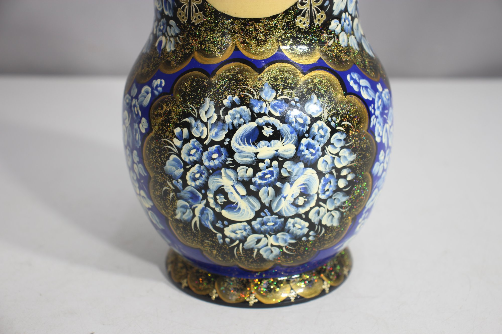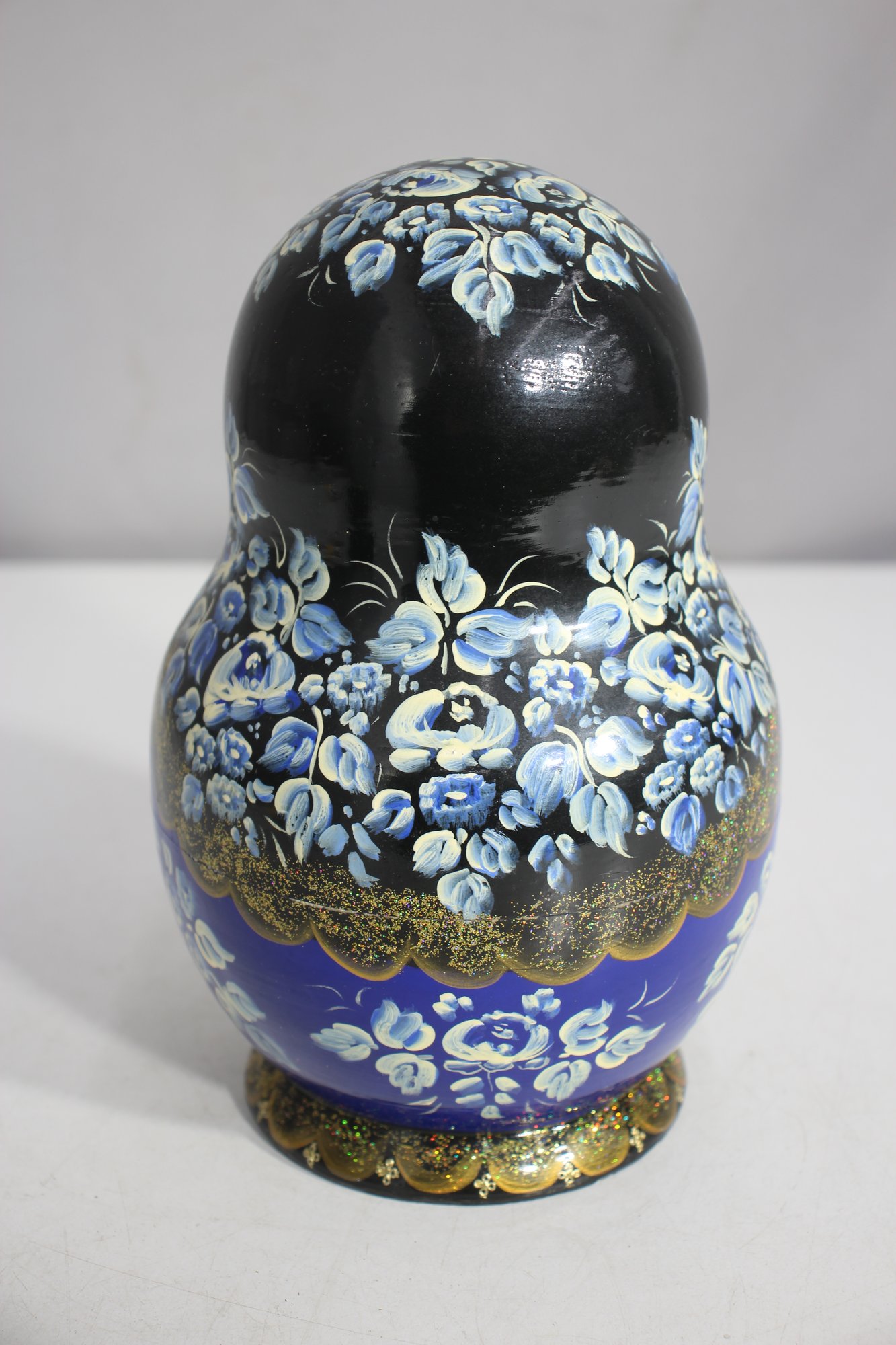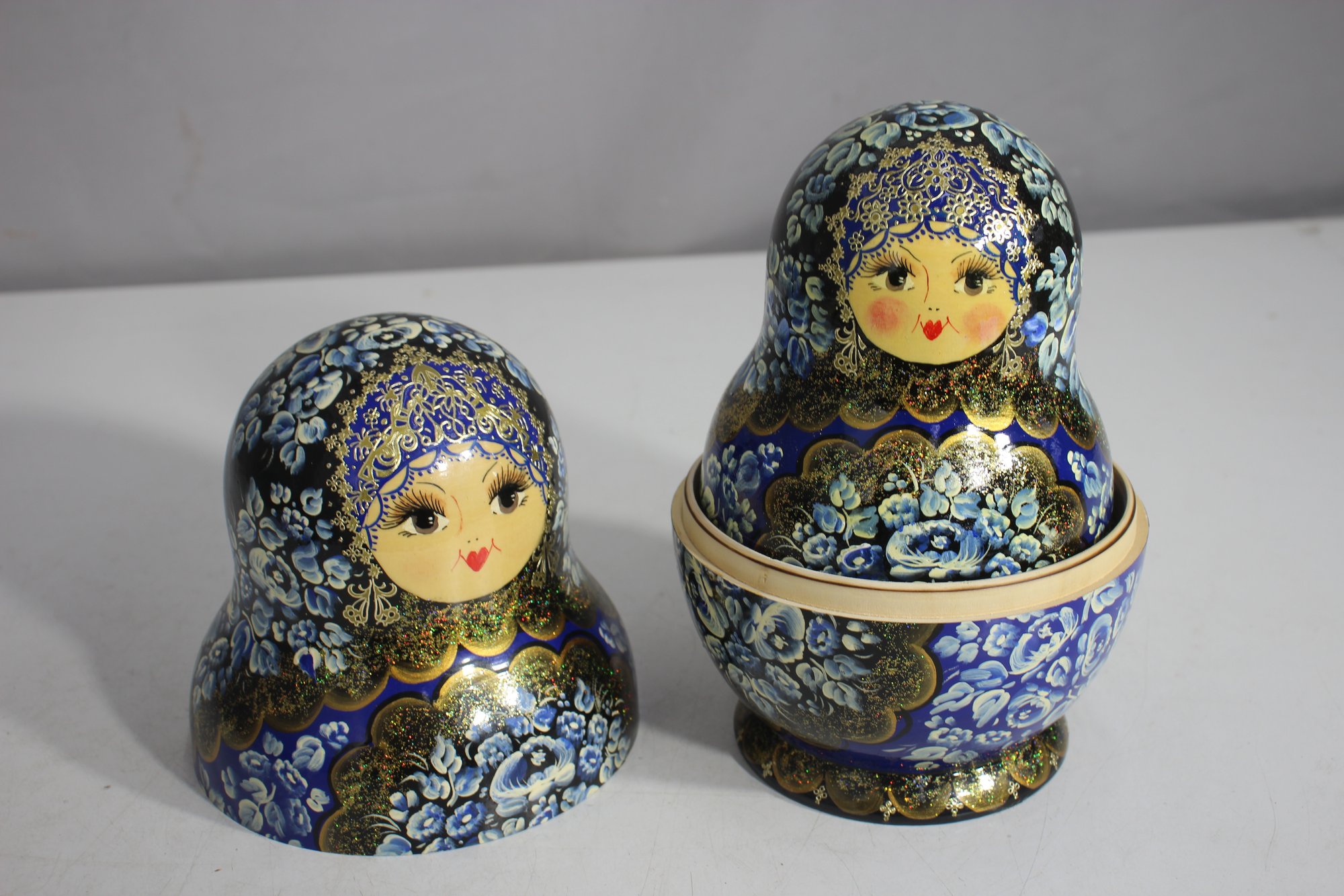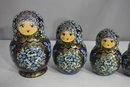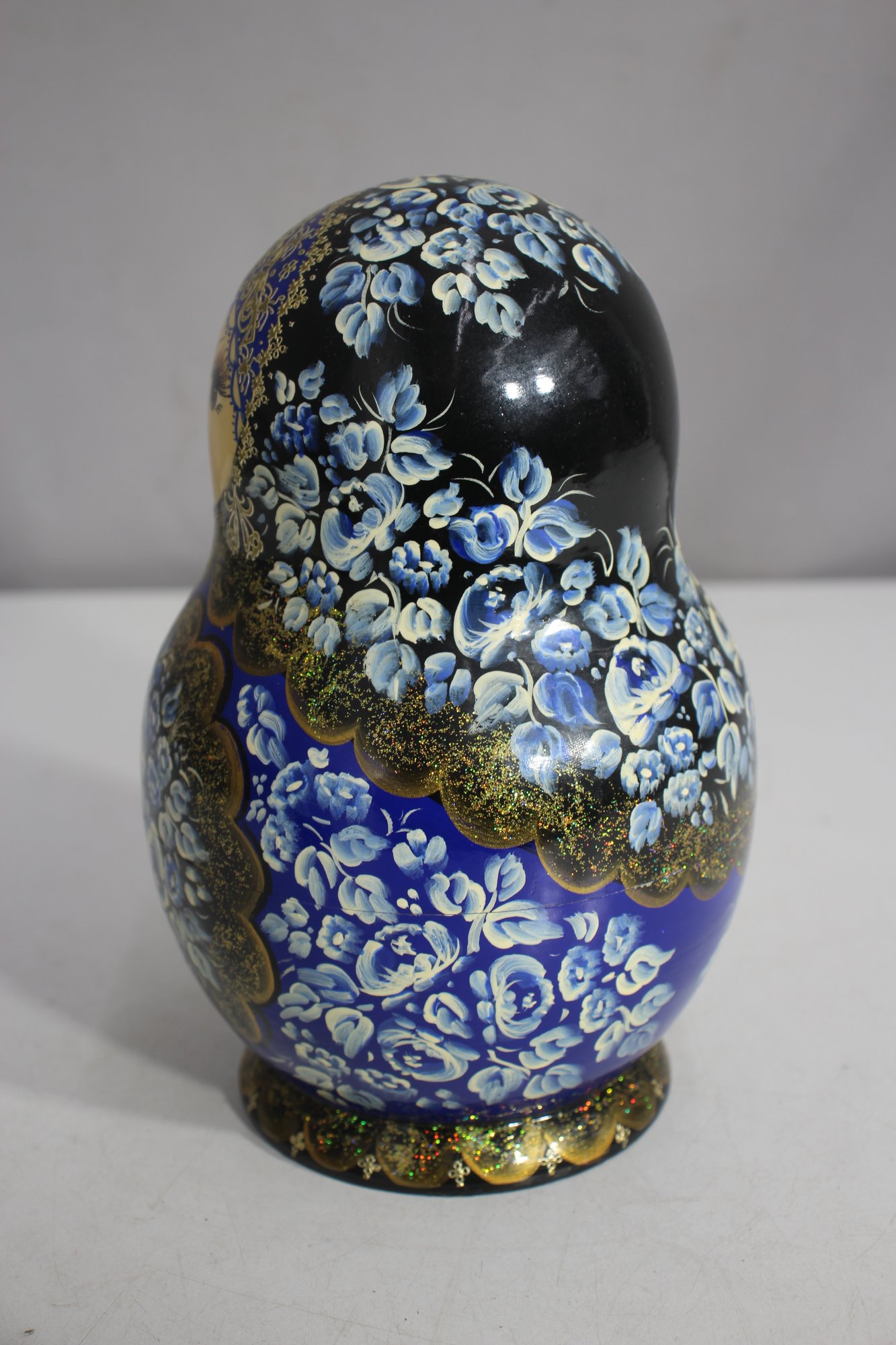 a stunning 15-piece Russian Matryoshka Nesting Doll Set, standing 9 inches tall at its largest. This exquisitely hand-painted set features intricate blue and gold floral patterns, delicate facial details, and traditional Russian artistry.