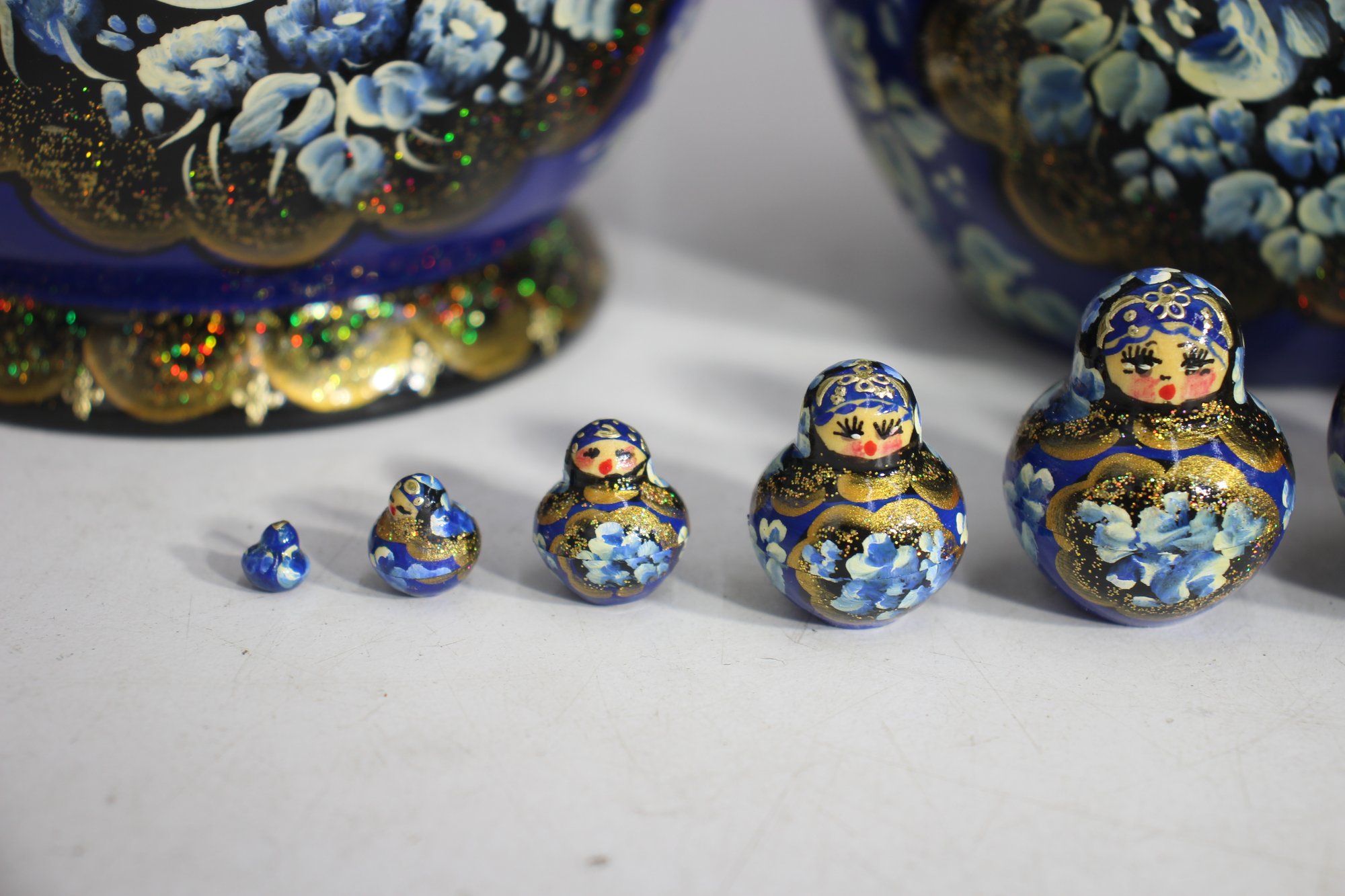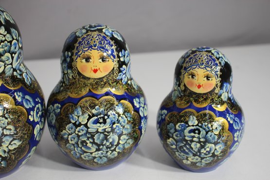 Each doll is uniquely decorated with golden accents, fine brushwork, and vibrant colors, showcasing the remarkable craftsmanship. The bottom of the largest doll is signed and numbered, further attesting to its authenticity and handmade nature.