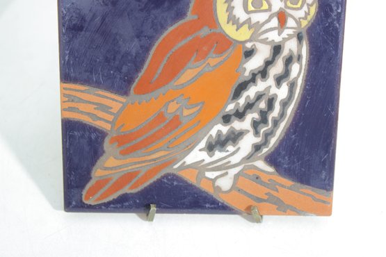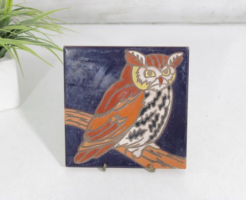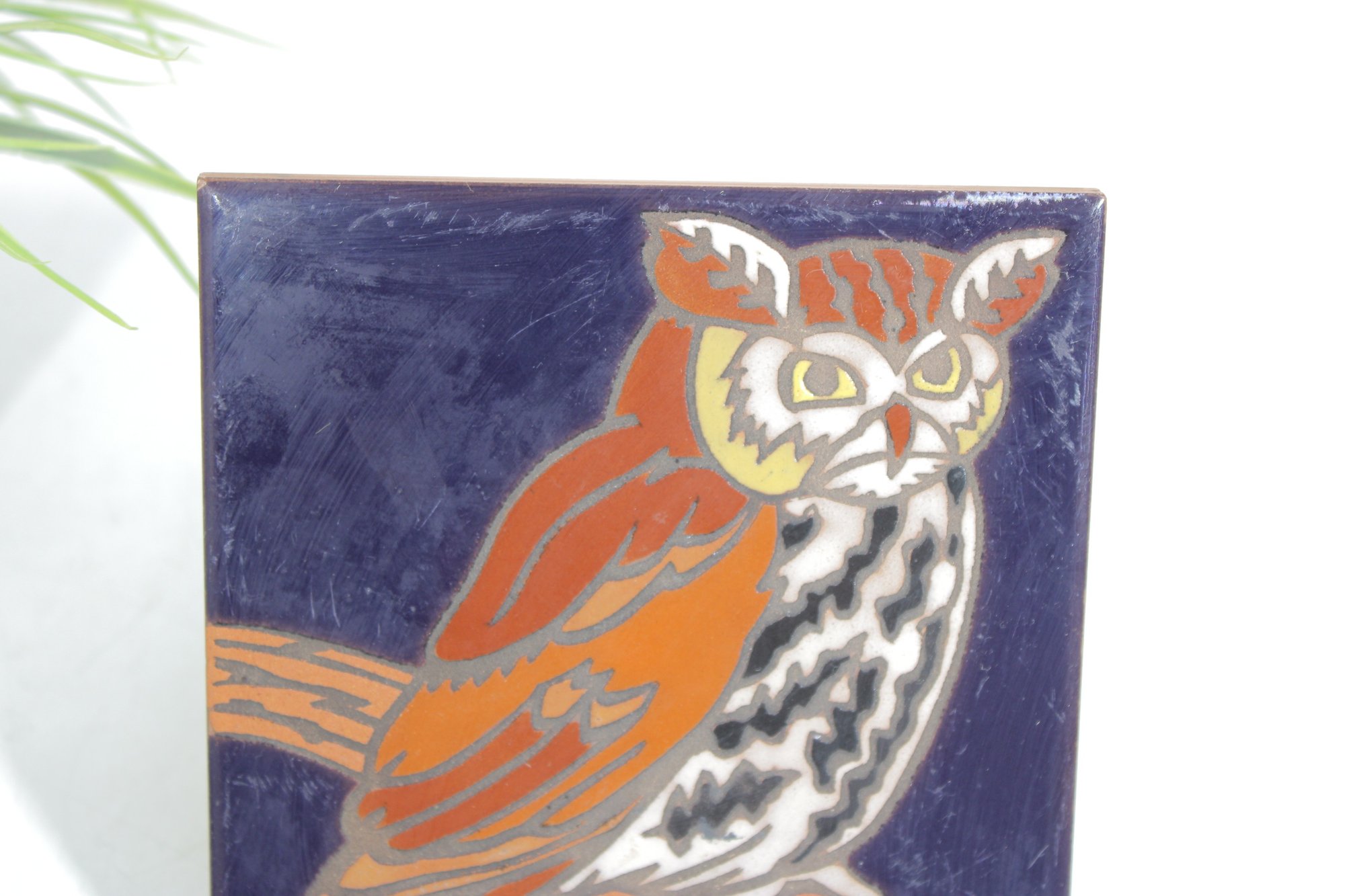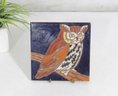 Bold and eye-catching hand-painted ceramic tile featuring a stylized owl design. Rendered in rich tones of deep blue, warm orange, and cream, the owl is depicted with expressive eyes and graphic feather detailing, giving the piece a strong folk art or mid-century modern aesthetic.