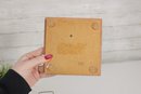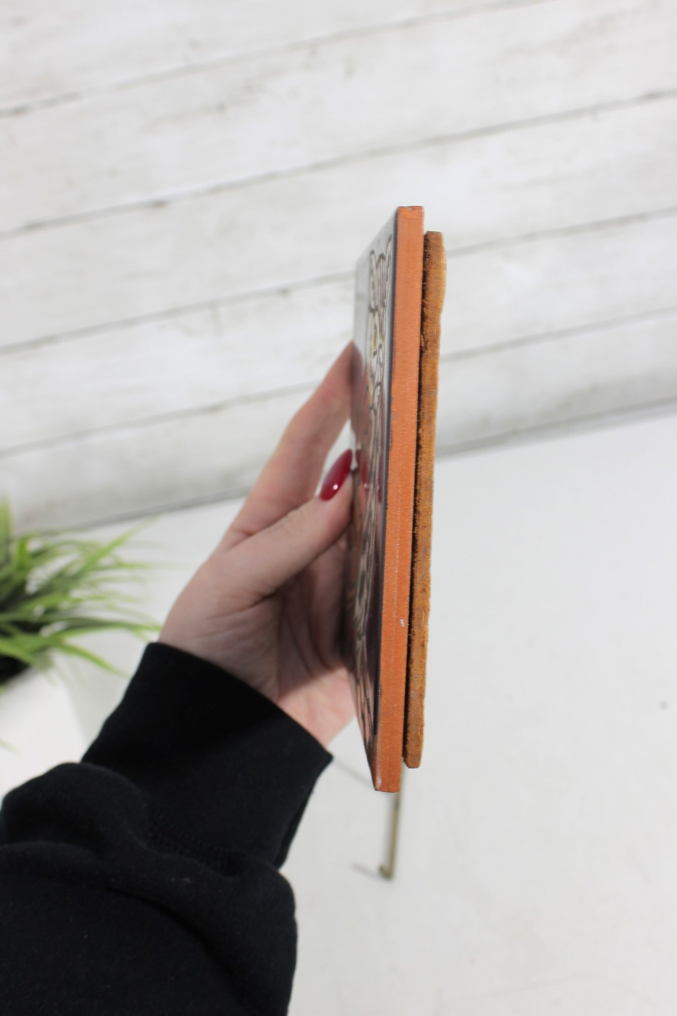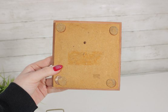 The tile has a glossy glazed finish and is mounted on a backing with felt pads, making it suitable for use as a trivet or for wall/display décor.