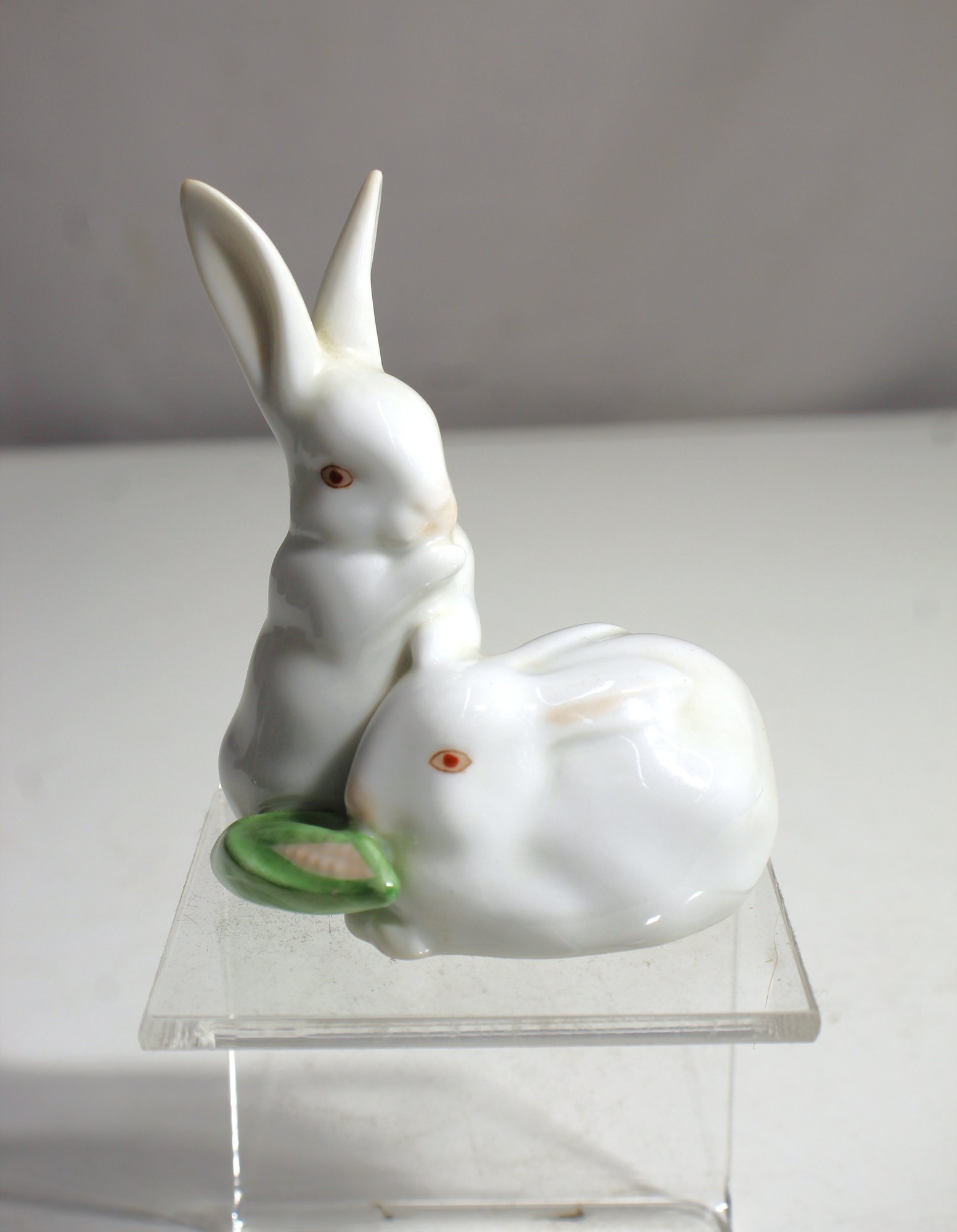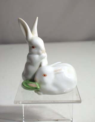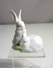 This charming hand-painted porcelain figurine from Herend, Hungary features two adorable white bunnies nestled together, one sitting upright and the other resting on the ground. The figurine is beautifully crafted with fine attention to detail, showcasing Herend's renowned porcelain artistry. The soft, delicate features of the bunnies, combined with the subtle touch of green from the leaf, make this a delightful piece of collectible art.