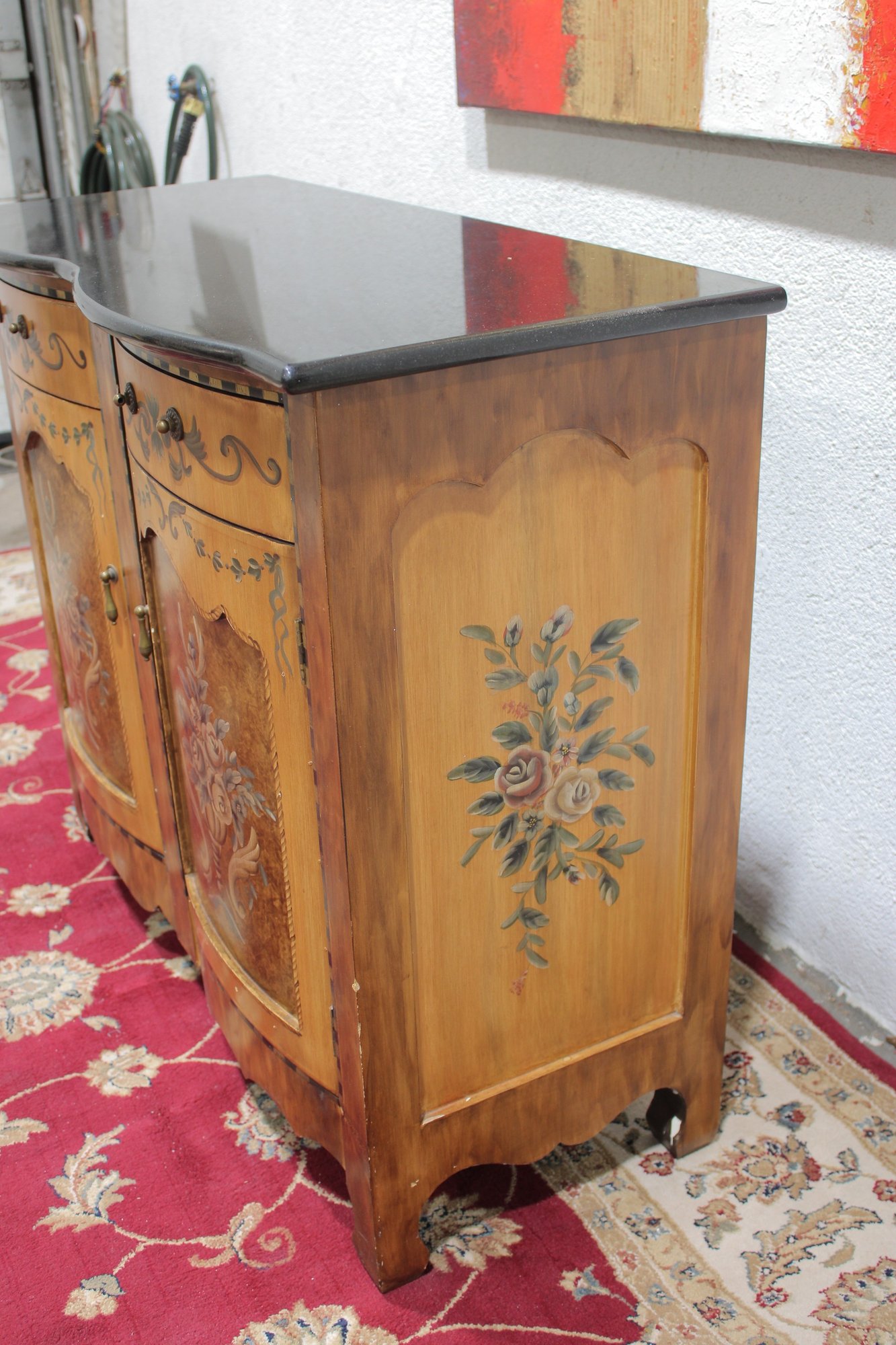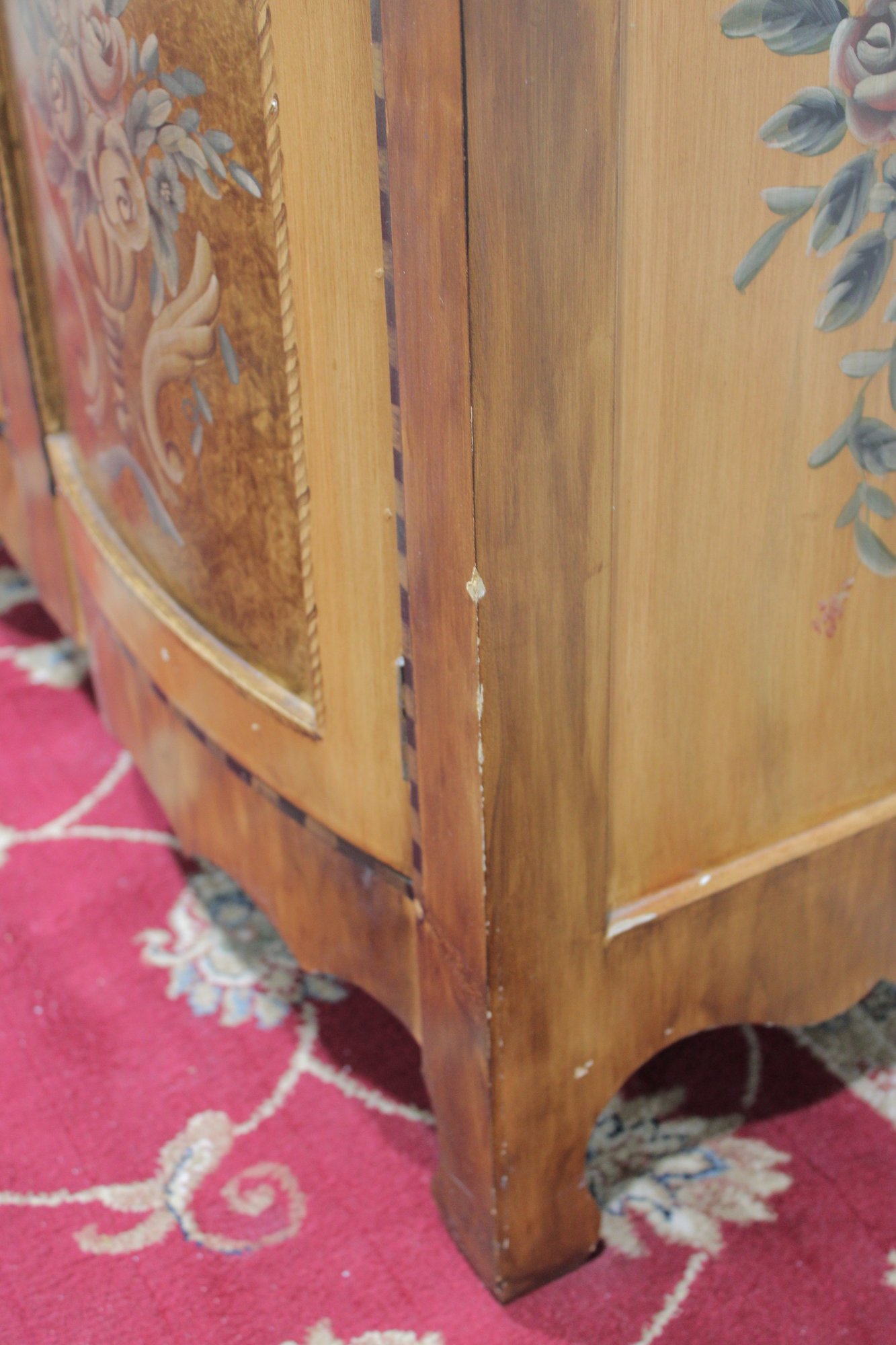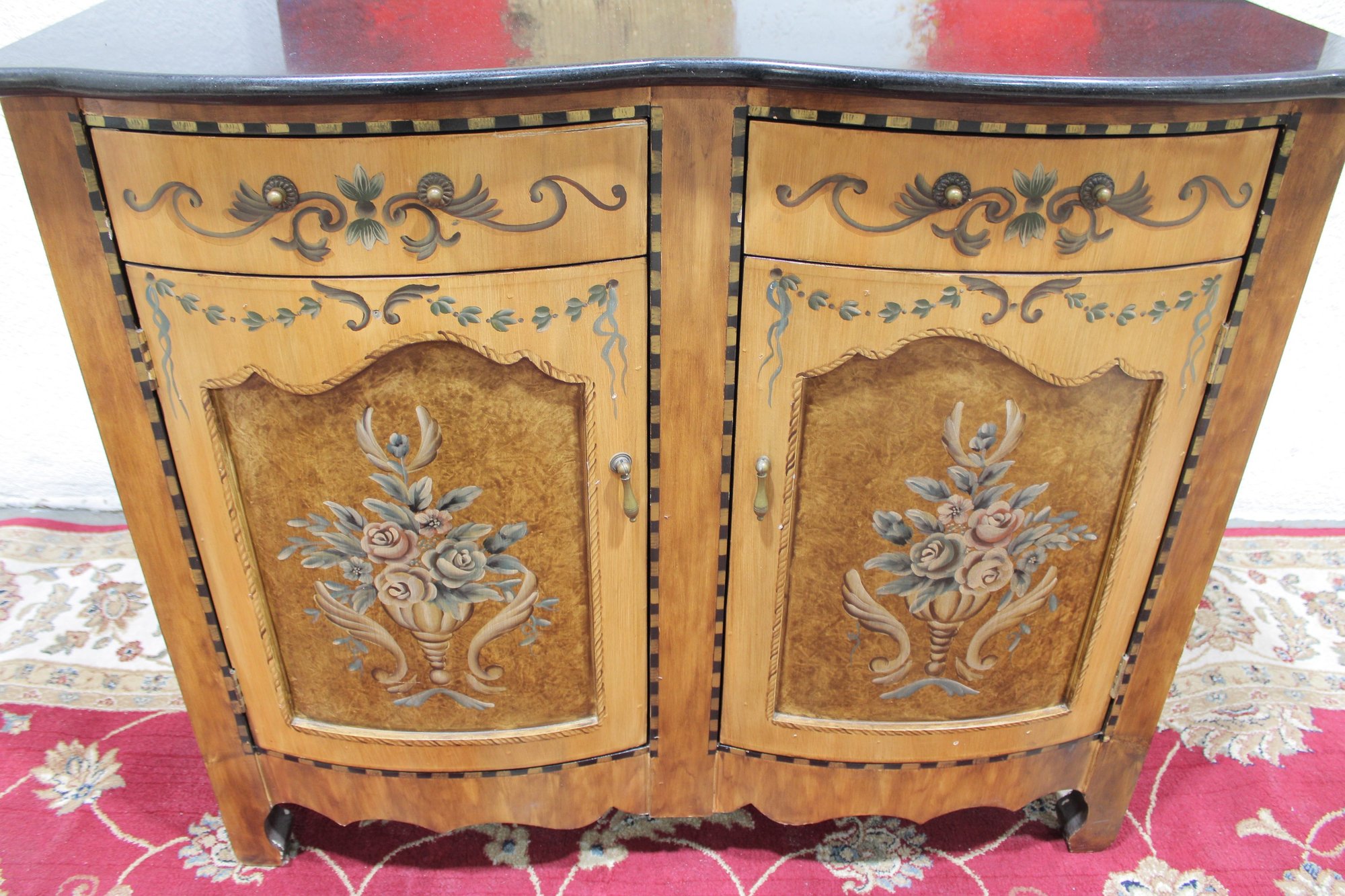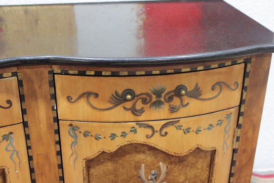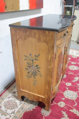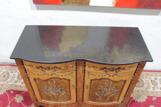 a beautiful hand-painted Italian-style cabinet or small credenza, featuring elegant decorative artwork and traditional craftsmanship. The cabinet showcases a warm wood tone finish accented with hand-painted floral motifs, scrolling details, and decorative borders throughout the front and sides.