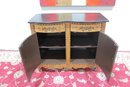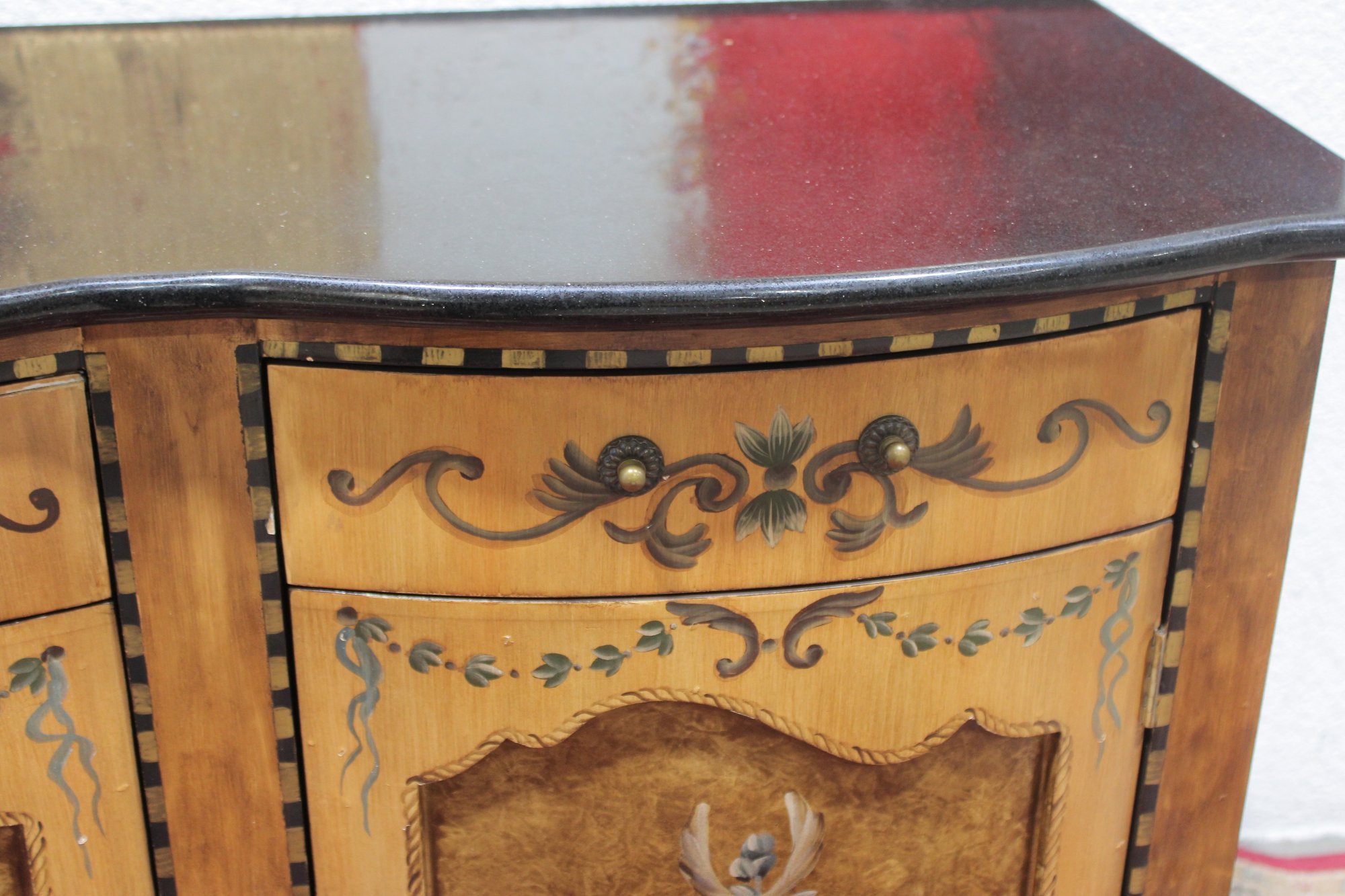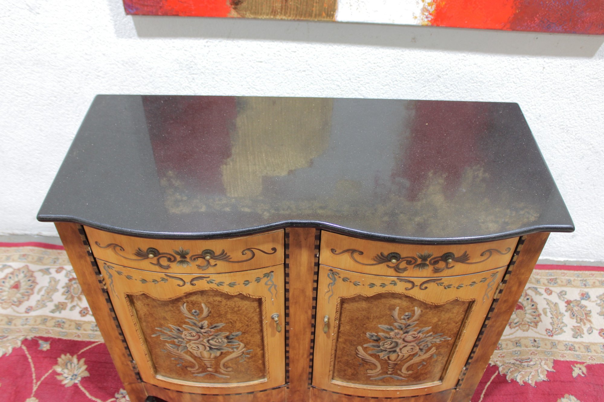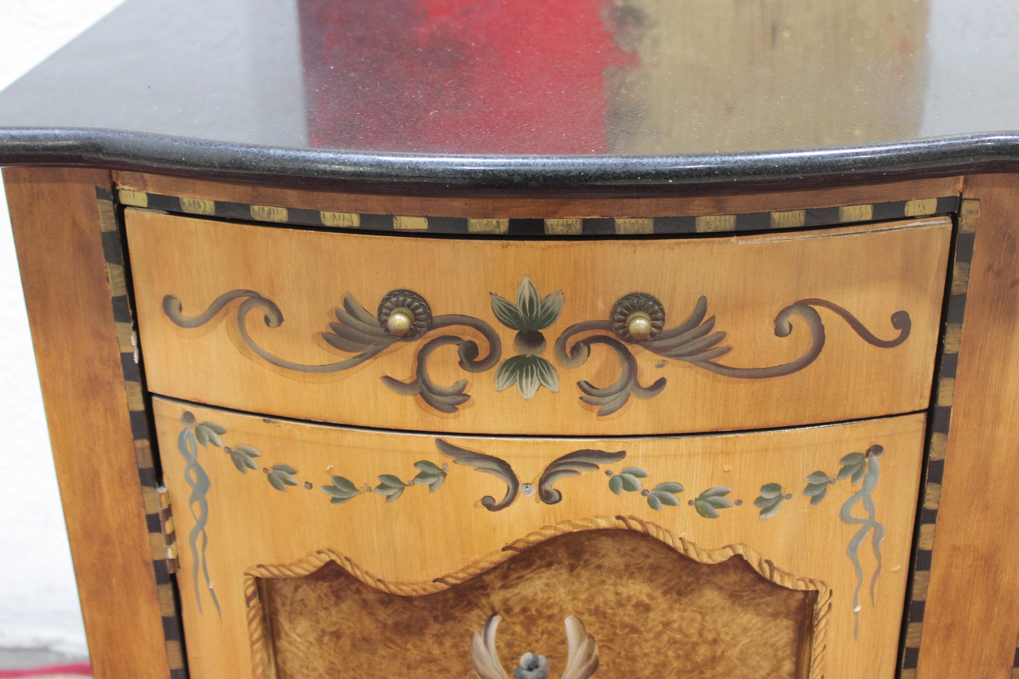 a beautiful hand-painted Italian-style cabinet or small credenza, featuring elegant decorative artwork and traditional craftsmanship. The cabinet showcases a warm wood tone finish accented with hand-painted floral motifs, scrolling details, and decorative borders throughout the front and sides.