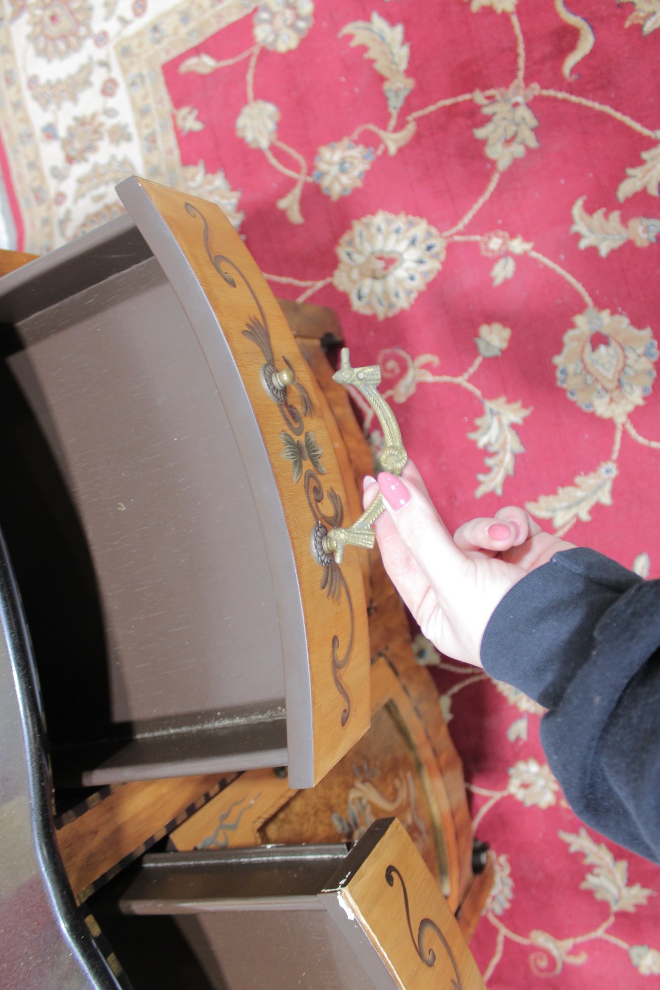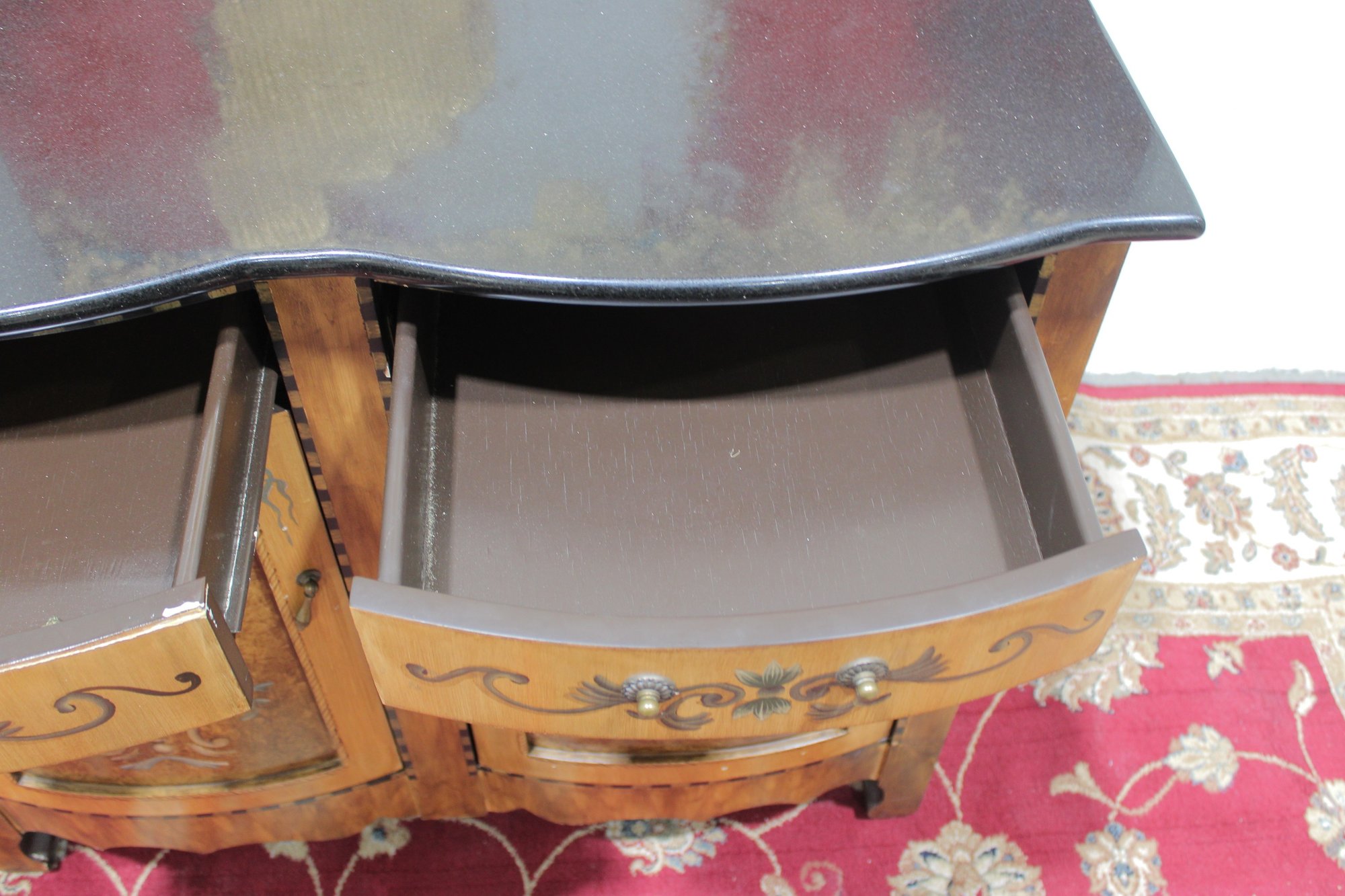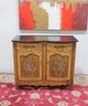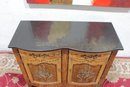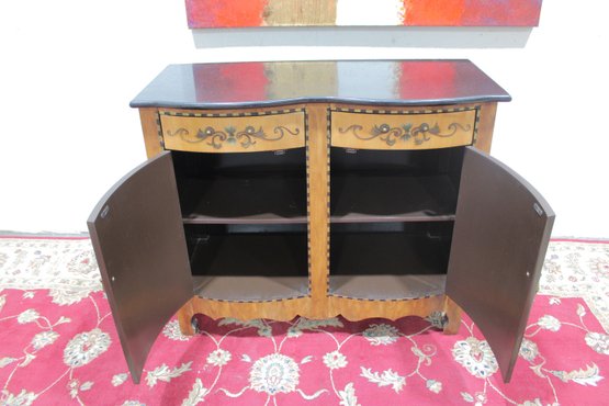 A contrasting dark finished top adds visual depth while protecting the surface. The piece stands on decorative feet and a shaped base, giving it a refined European look.