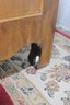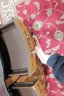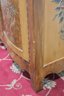The two paneled doors display ornate painted floral bouquets framed by carved and painted trim. Inside, the cabinet offers shelved storage space, making it practical for storing linens, dishes, or household items.