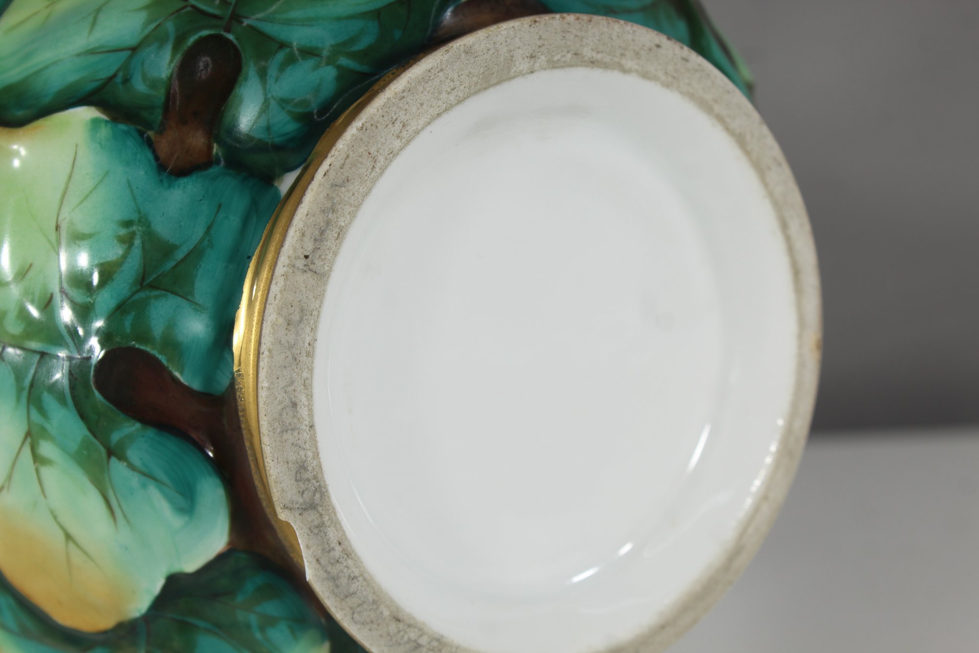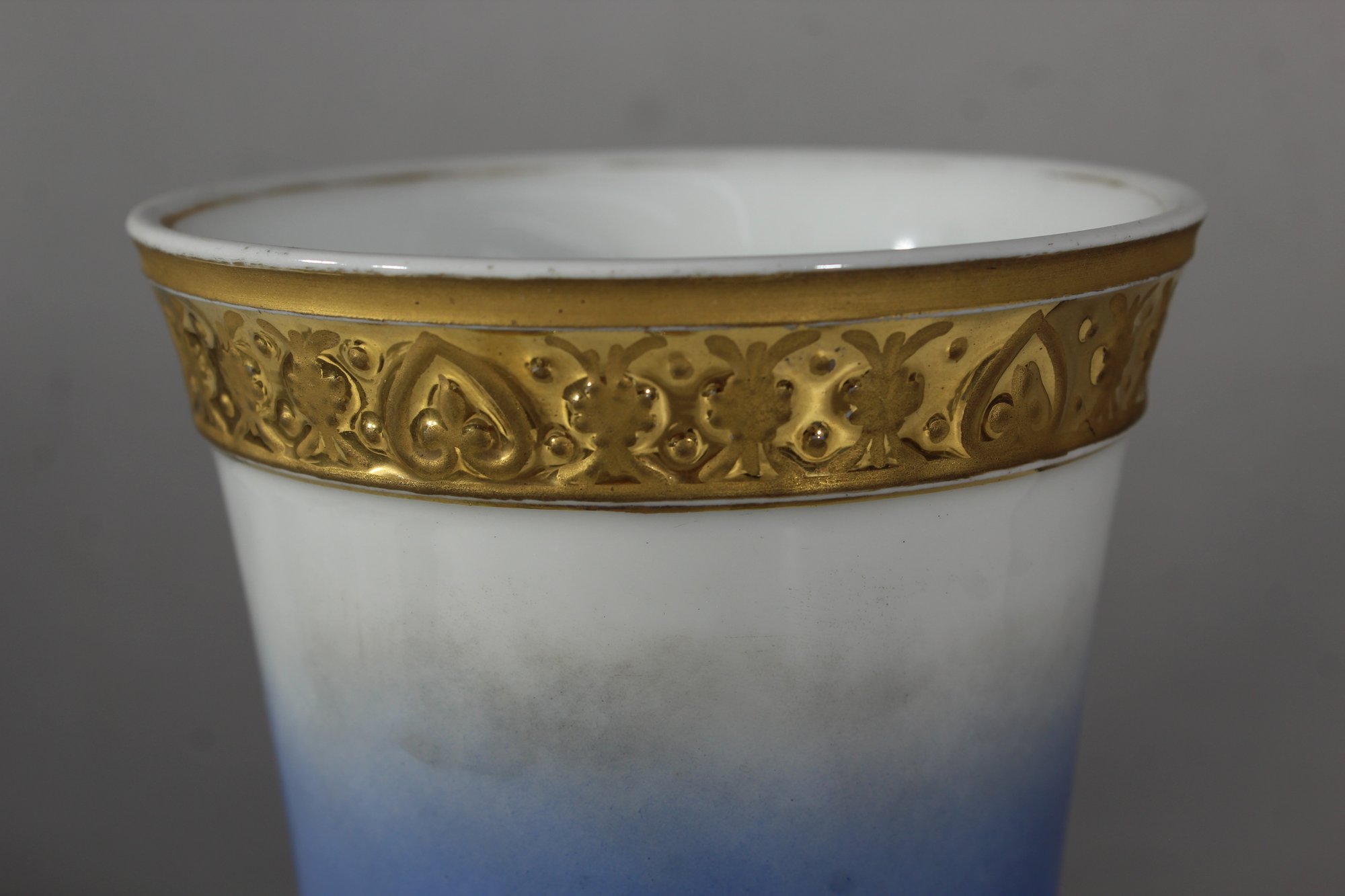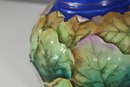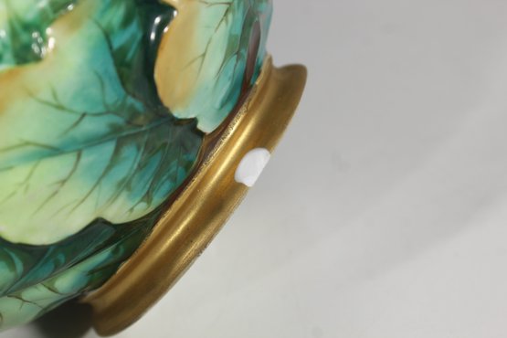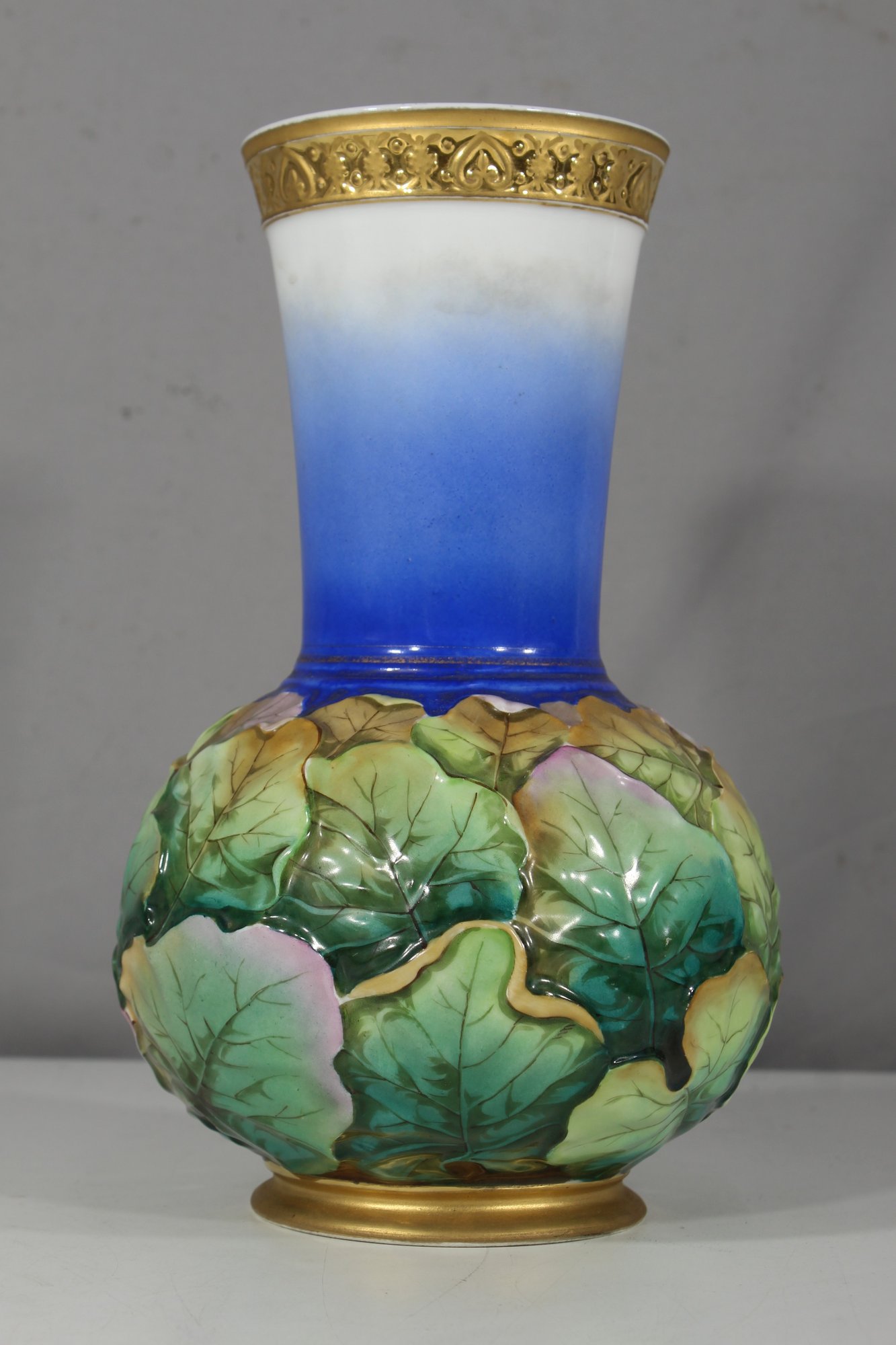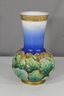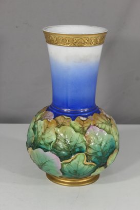 This stunning hand-painted porcelain vase is a true work of art. Featuring a vibrant gradient of blue transitioning into a lush leafy motif, this piece is accented with a delicately embossed gold band along the rim and base, exuding timeless elegance.