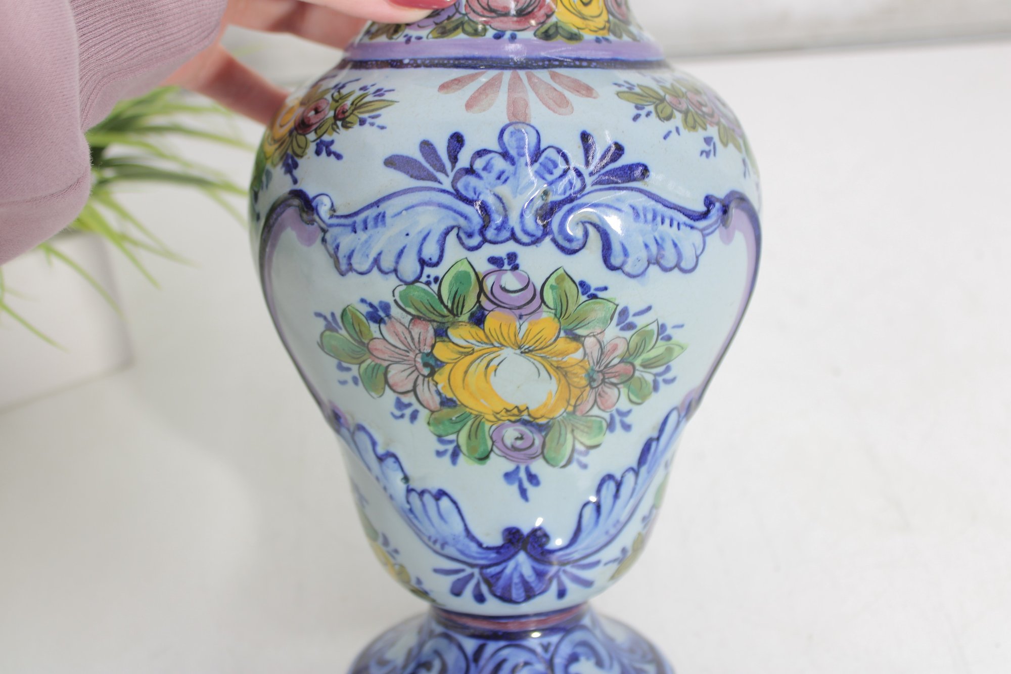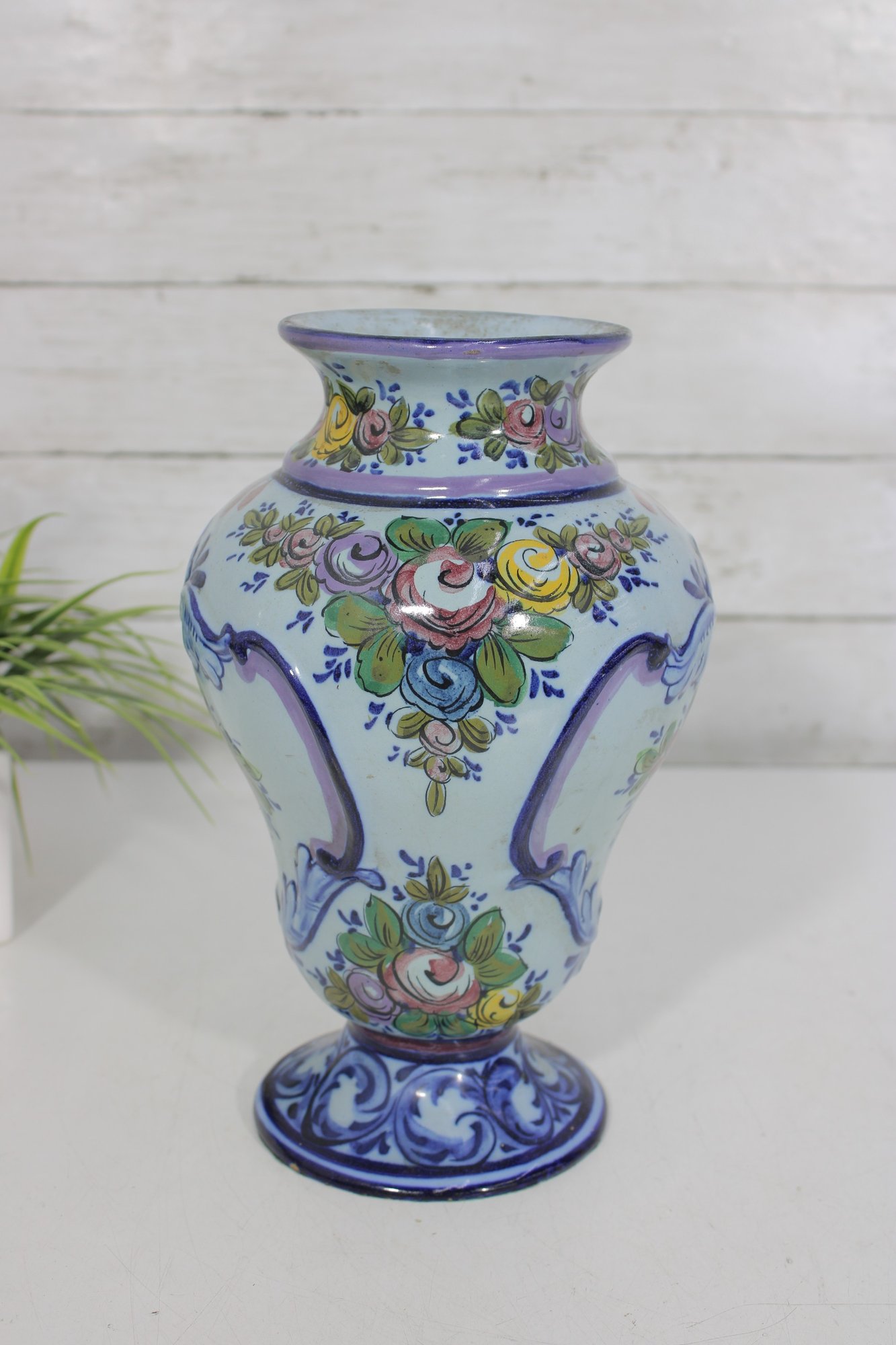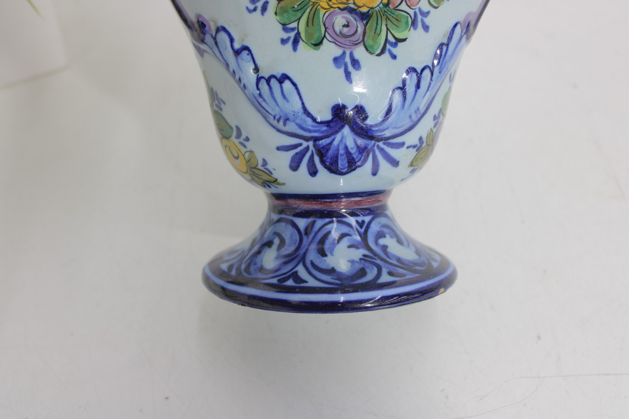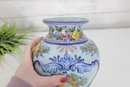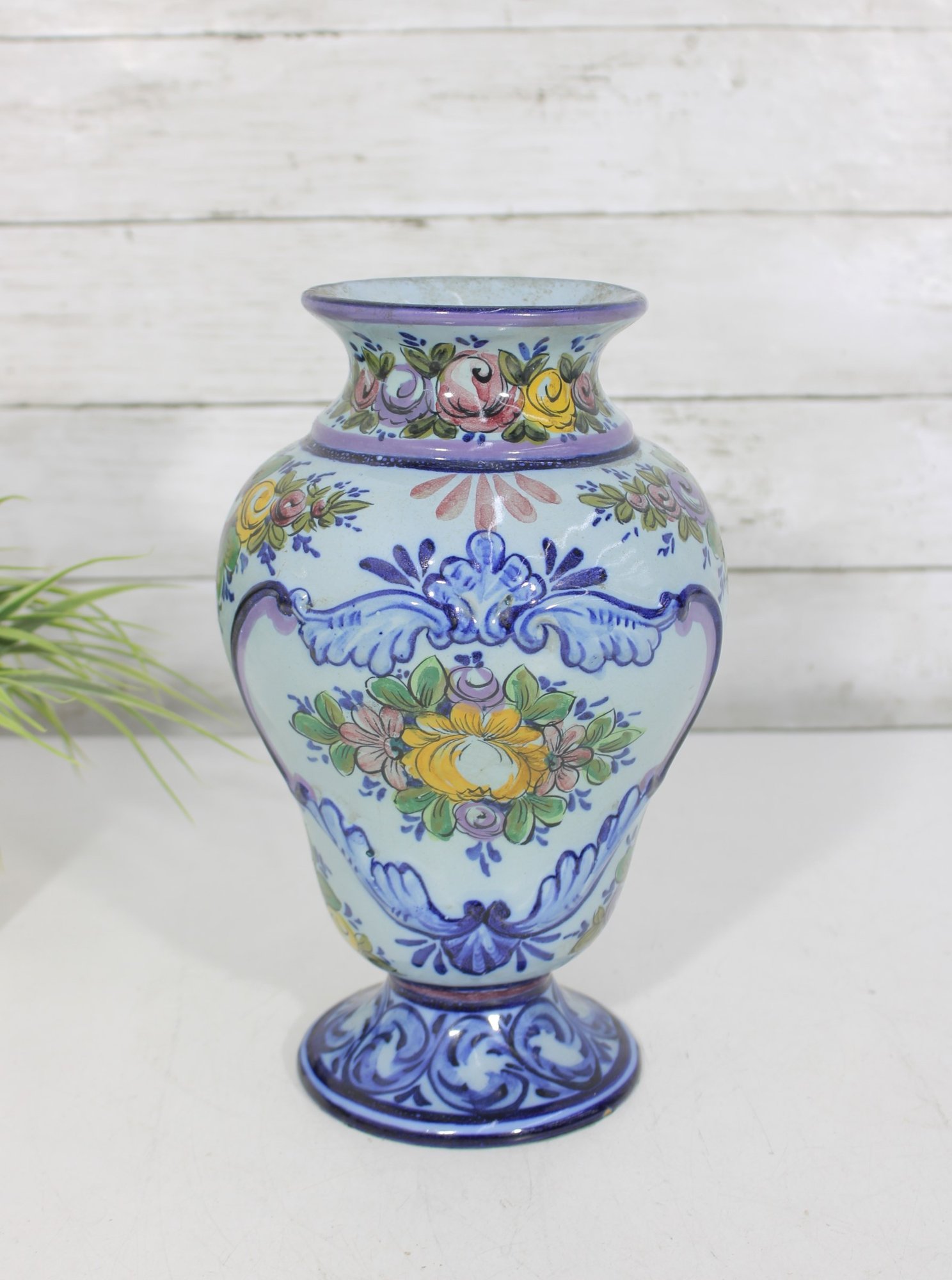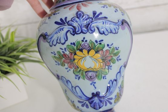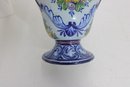Crafted in Portugal, this piece reflects traditional Portuguese ceramic artistry, known for its detailed hand-painted designs and bright, decorative patterns. The vase has a rounded body with a pedestal base and flared rim, making it an elegant display piece for flowers or as a stand-alone decorative accent.