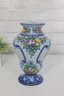 Beautiful hand-painted Portuguese pottery vase featuring colorful floral decoration in classic European ceramic style. The vase displays vibrant blue scrollwork and yellow floral motifs on a soft light background, with additional decorative flowers around the neck and base.
