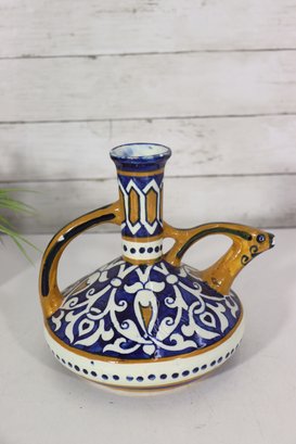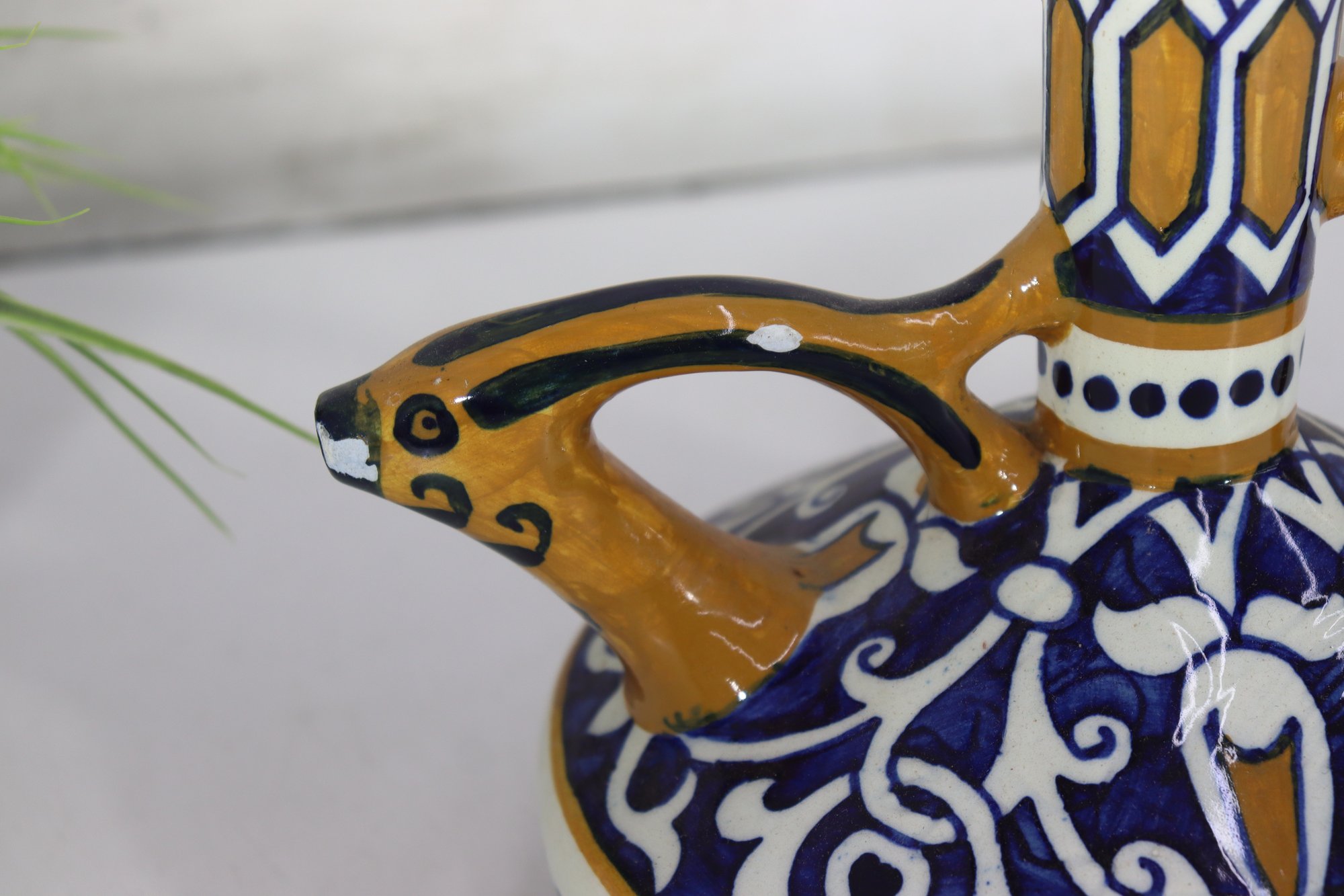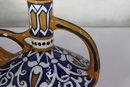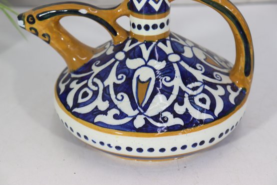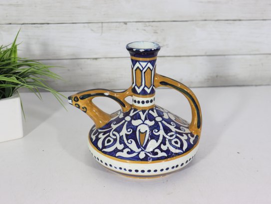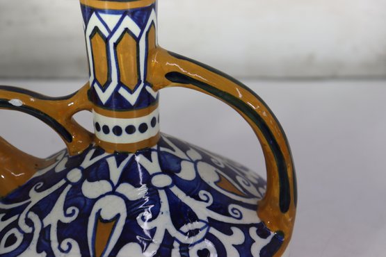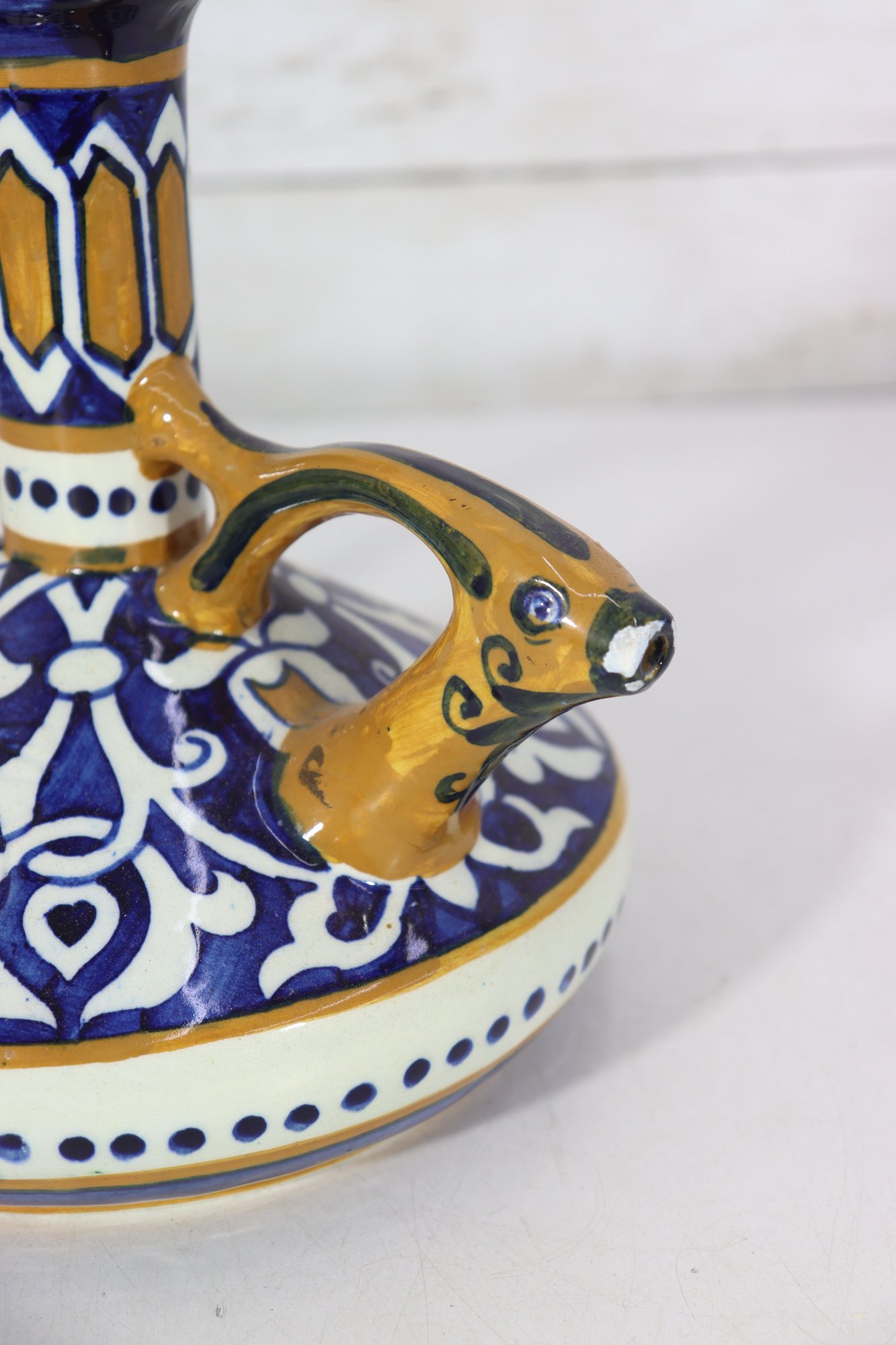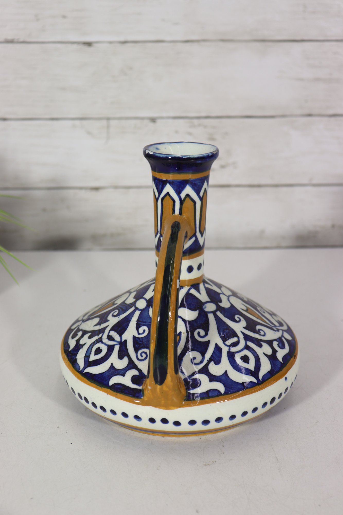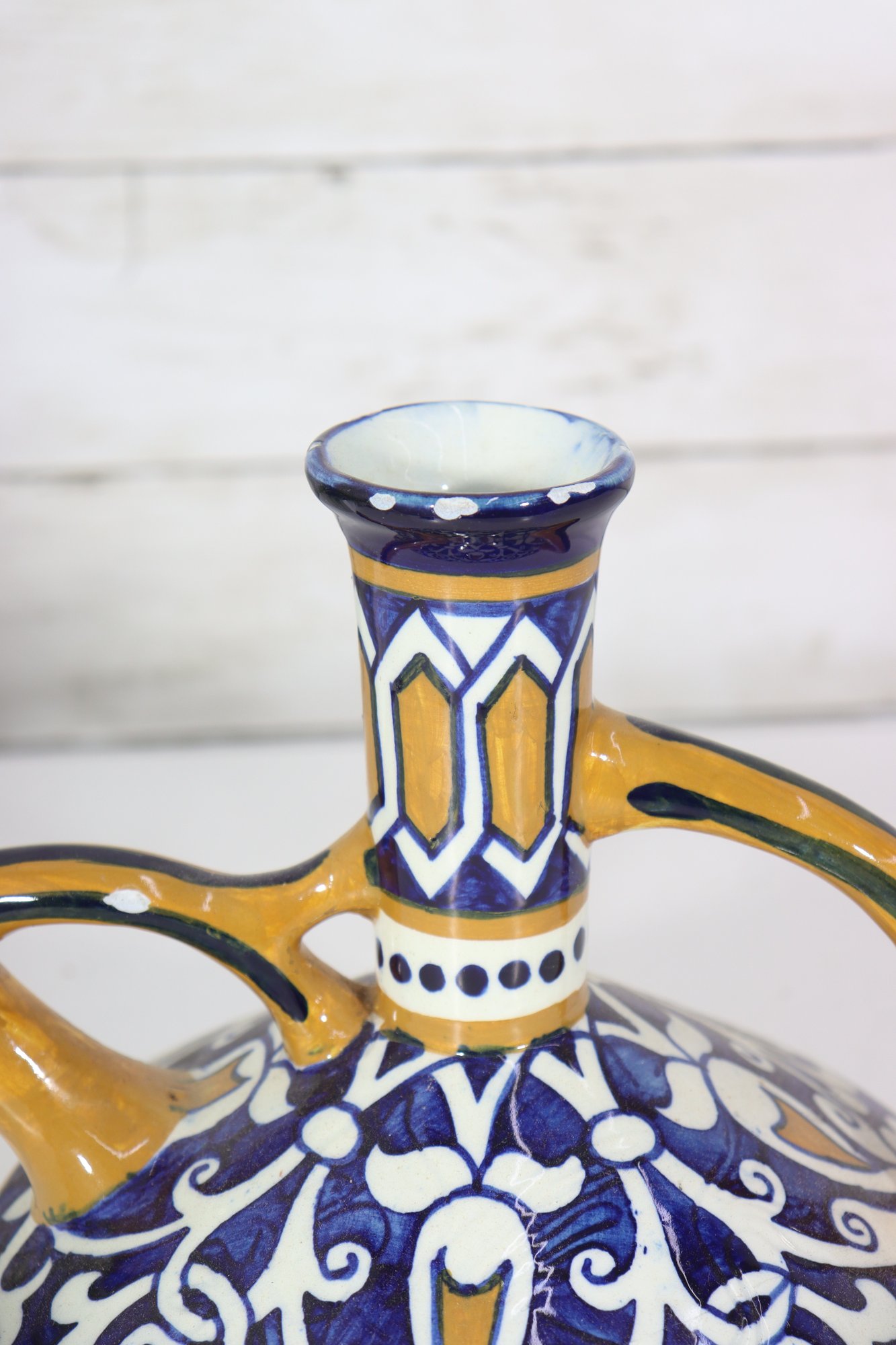 a beautiful hand-painted ceramic vase in a classic Spanish/Mediterranean style, standing approximately 8 inches tall. This distinctive piece features two gracefully curved handles and a wide, rounded body decorated with intricate floral and scrollwork patterns.