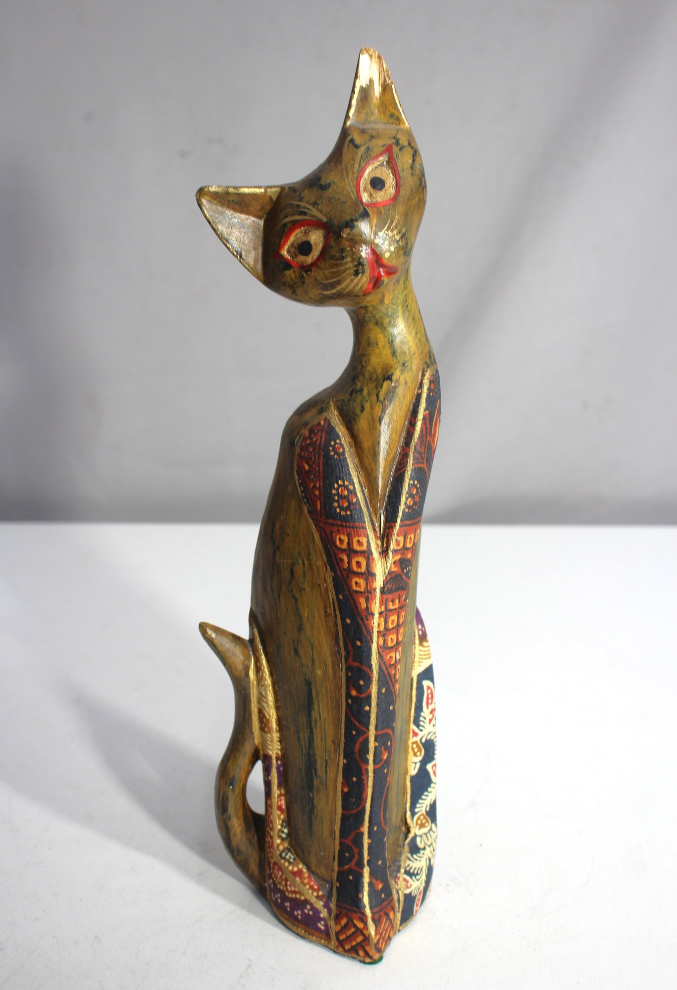 This striking hand-painted wooden cat figurine stands 13.5" tall and features a whimsical folk-art design. Its elongated, stylized shape and vibrant, intricate patterns make it a unique decorative piece.