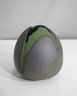 This unique handcrafted ceramic vessel features an organic, egg-like shape with a smooth matte gray finish accented by subtle golden speckles. A distinctive, irregular opening reveals an interior with a rich green glaze that flows over the edges, creating a natural, flowing contrast against the dark exterior. The base is carefully finished with a circular foot and an artist’s signature stamp, adding to its authenticity and collectible appeal. This sculptural piece serves as a decorative accent or functional vessel, embodying contemporary artistry with a raw, natural aesthetic.